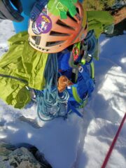 La cascata è in condizioni grandiose, forse un po’ più gonfia dello scorso anno. Fatto 3 tiri da circa 40m di cui il primo è il più duro con ghiaccio meno buono. Fatto 2 soste su ghiaccio e l’ultima su spit, poi due doppie su spit (una sosta a destra e una a sinistra). Viti abbastanza semplici da piazzare e tutte buone.