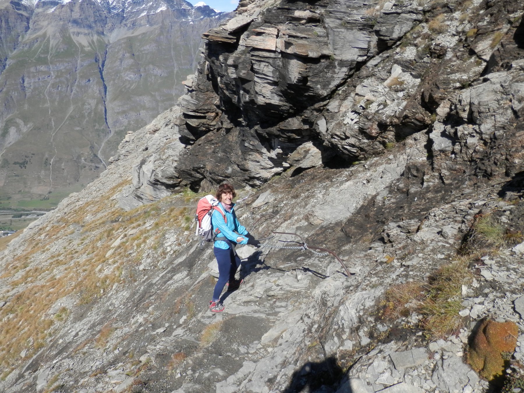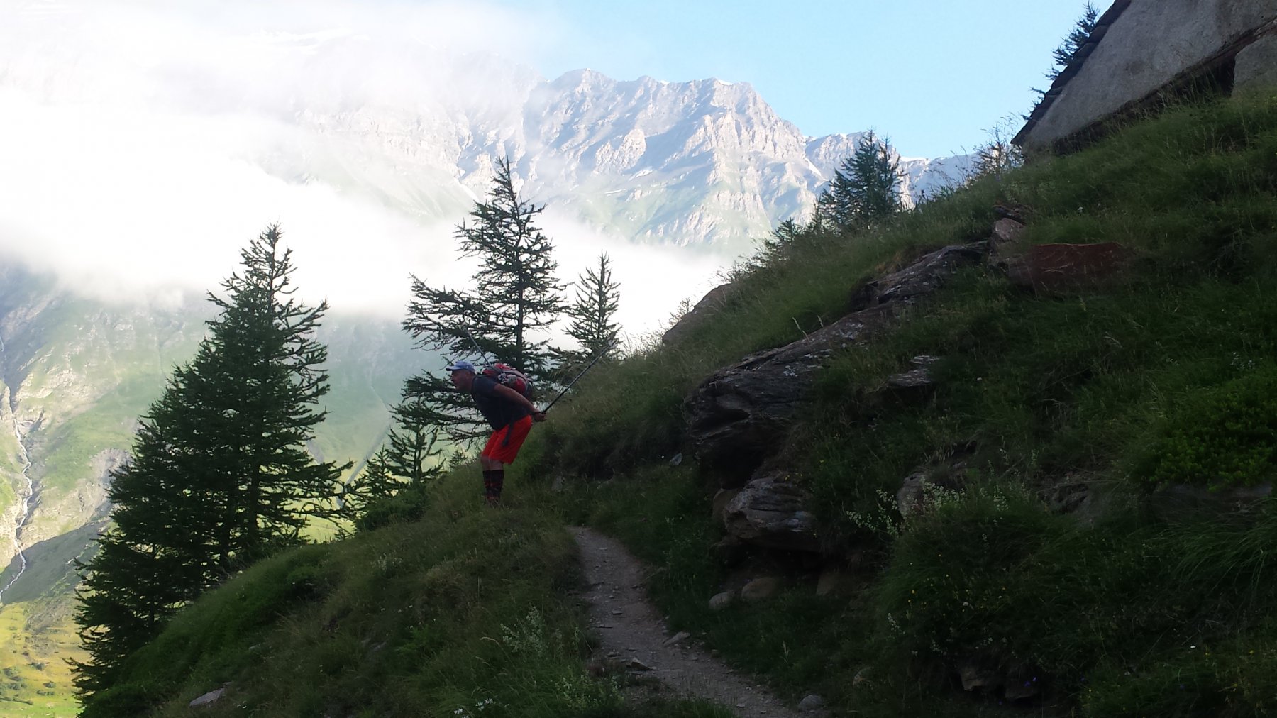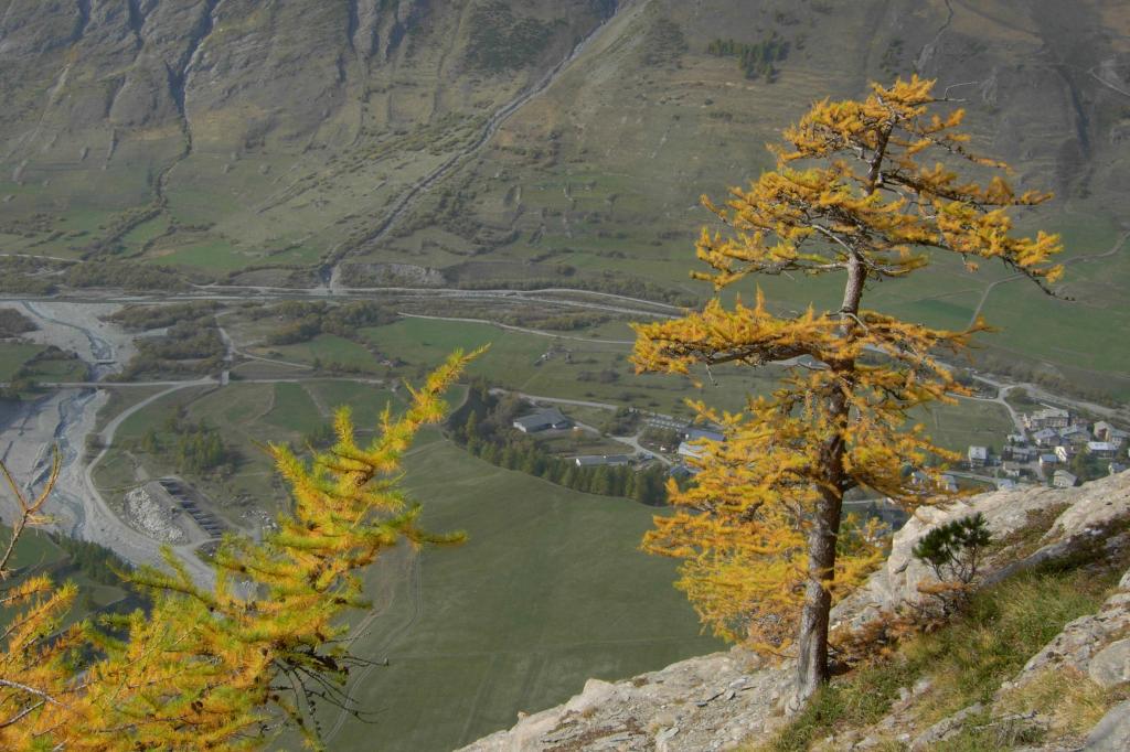 A sinistra del pilone inizia un sentiero abbastanza ripido che sale con diverse svolte nel lariceto, quindi si sposta verso sinistra percorrendo la crestina con splendido panorama aereo verso l’Arc.