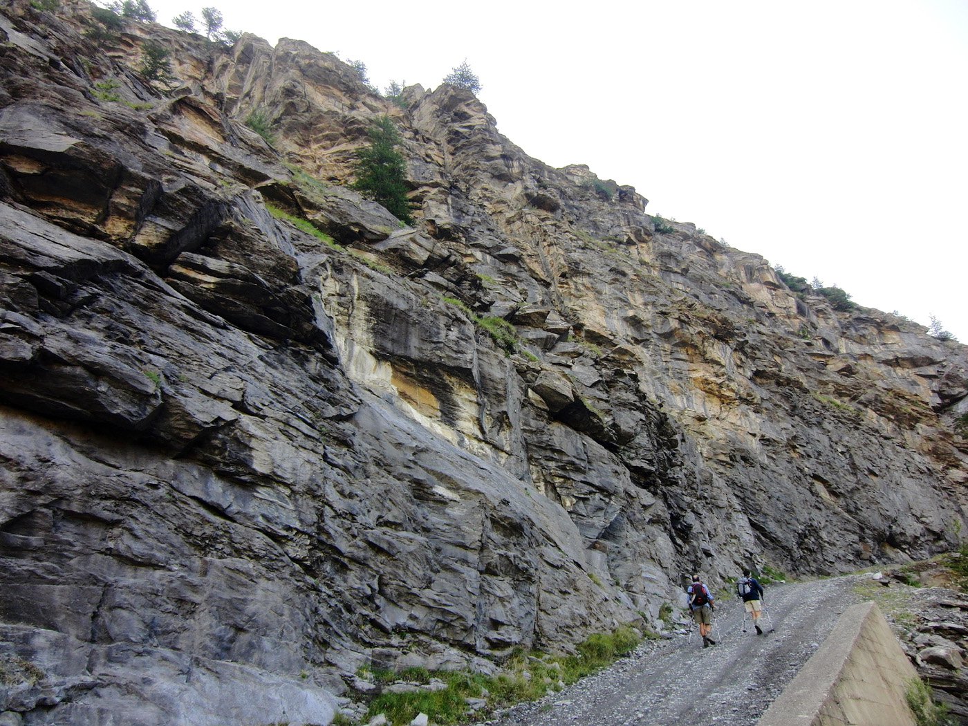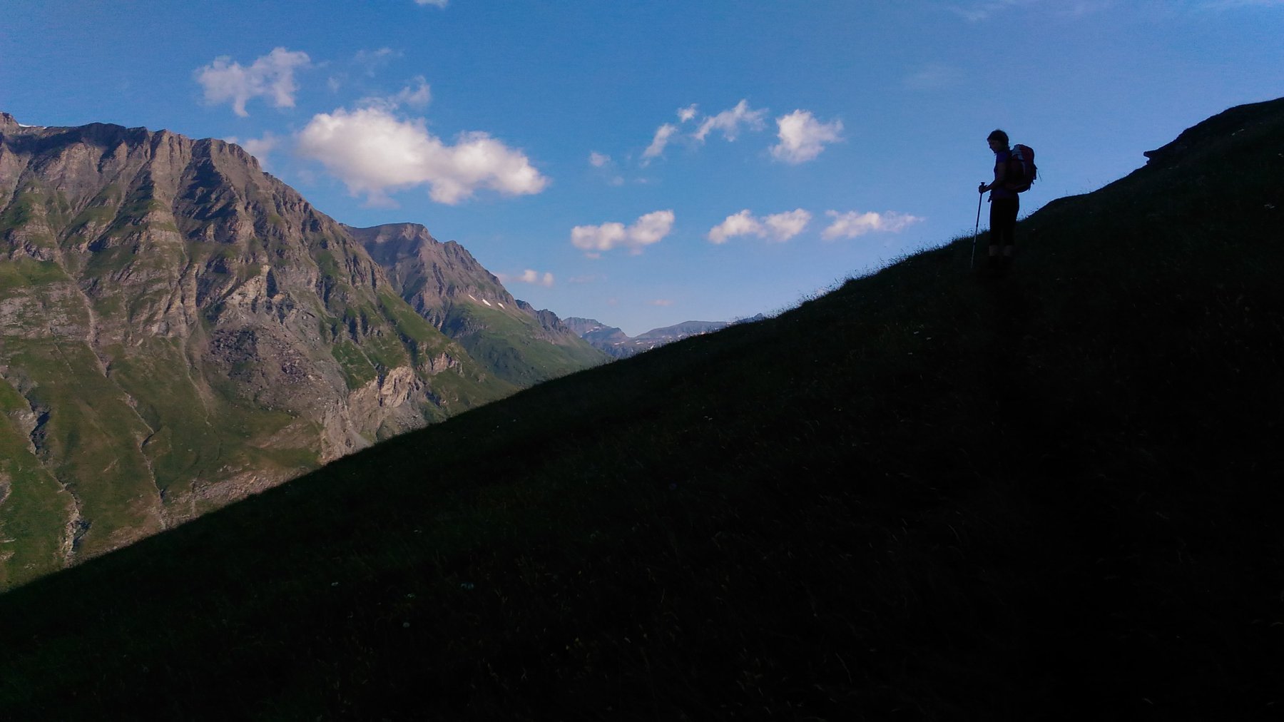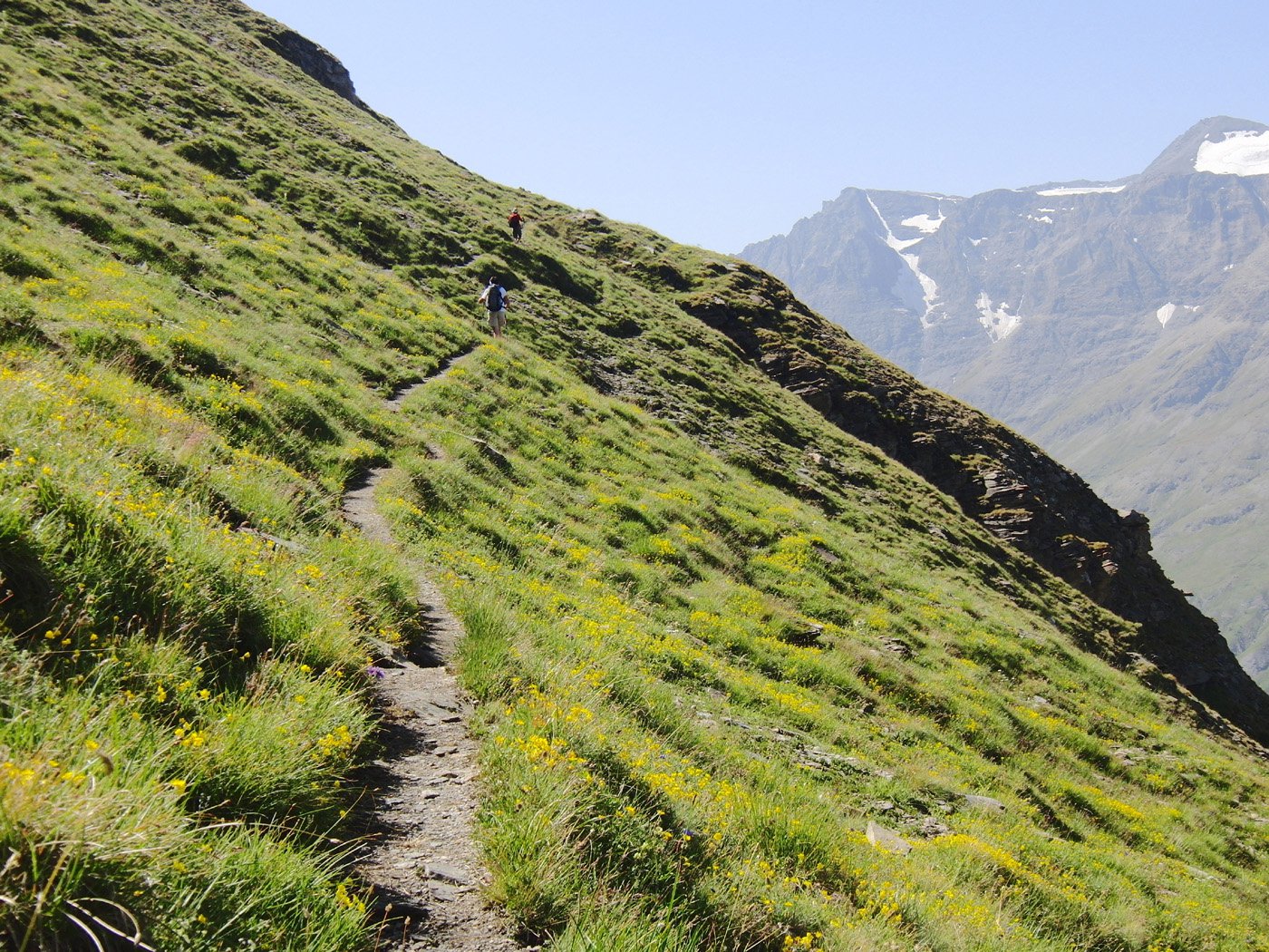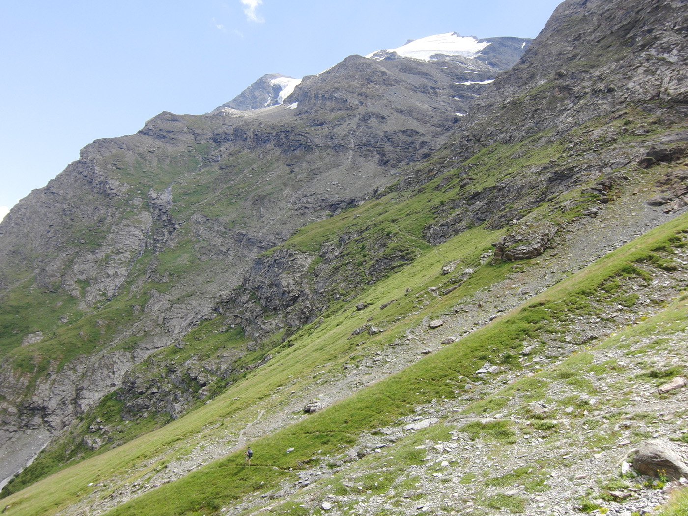 Si giunge ad un breve ripiano (Les Maugnes) quindi si percorrono ampi pendii erbosi con alcune rampe alquanto ripide fino a raggiungere una fascia di saltini rocciosi per evitare la quale il sentiero effettua un lungo traverso a destra.