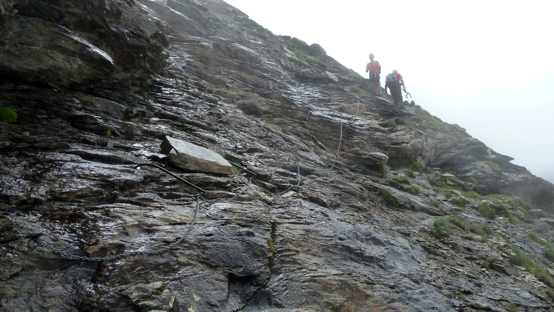 Si prosegue su sfasciumi (la traccia è buona) in un pendio sempre più ripido fino a giungere nei pressi di un saltino roccioso (tratto attrezzato con catena) superato il quale facilmente si perviene all’ampio colletto m. 2.902.