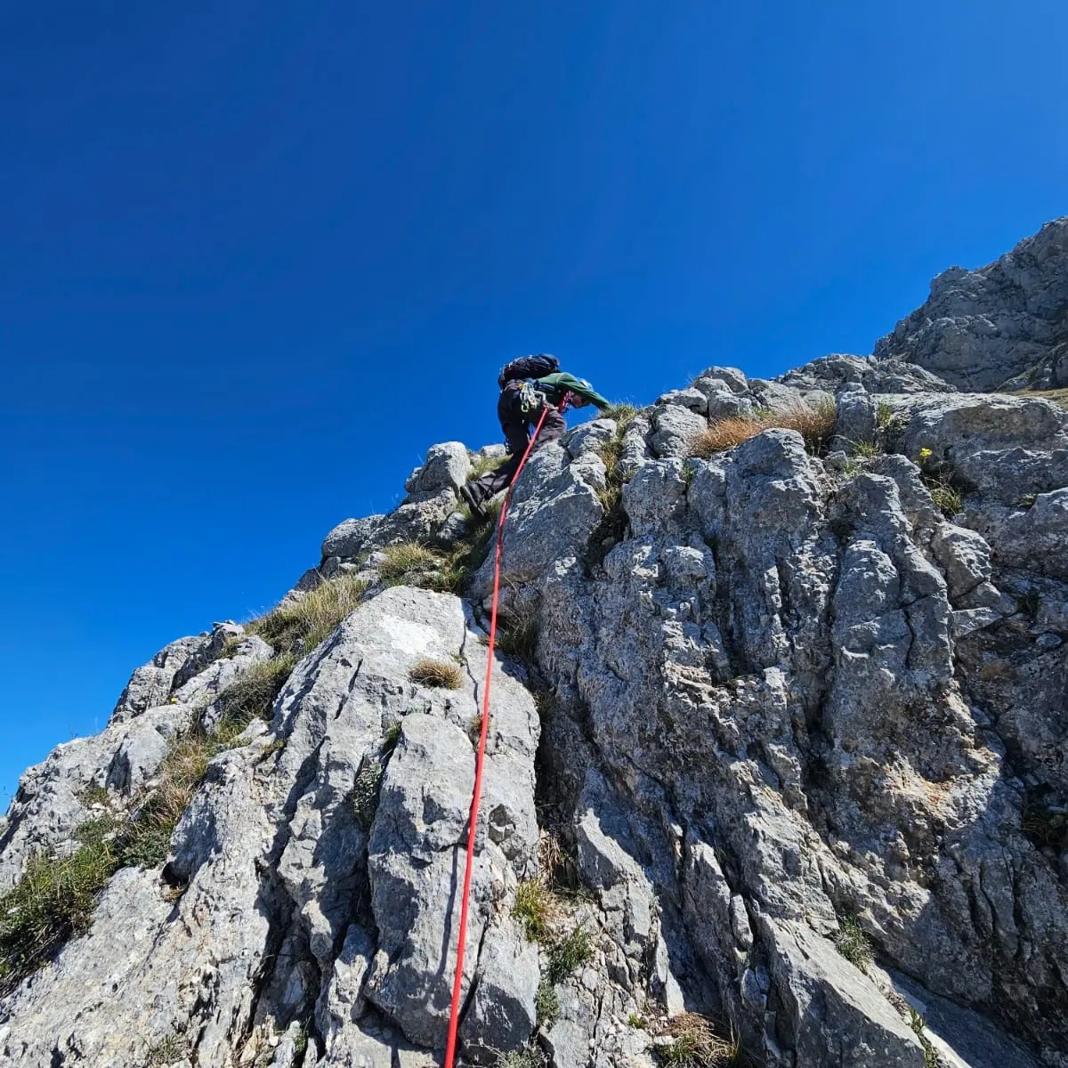 Si segue fedelmente il filo di cresta alternando tratti più impegnativi (III+/IV MAX) a tratti semplici, talvolta su cresta esposta e sottile. Sono presenti spit e chiodi con fettucce lungo la via. La roccia è sempre molto buona. I passi più duri sono quasi sempre aggirabili passando su ripidi prati. Raggiunta l’anticima prosegue cresta molto semplice (I) prima in piano/leggera discesa, poi con ultima salita (2h circa). Discesa continuando dalla vetta per cresta Est su sentiero escursionistico.