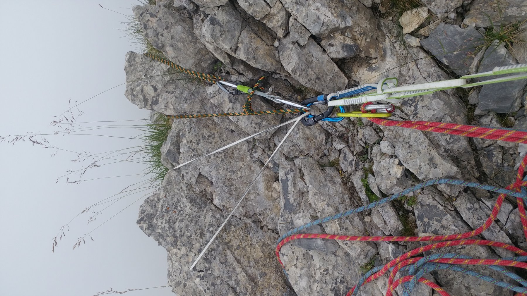 Via marcia dall’inizio alla fine, con rari tratti di roccia discreta. Pochissimi chiodi in loco tranne che su L8. Mi pare di ricordare L1 0 chiodi, L2 2 chiodi, L3 1 chiodo, L4 0 chiodi, L5 2 chiodi, L6 1 chiodo, L7 0 chiodi, L8 5 chiodi, L9 1 chiodo, sosta di L9 e L10 non pervenuta, poi trasferimento che sarebbe L12 fatto in conserva, L13 2 chiodi e 2 spit, poi cresta finale in conserva. Tutte le soste sono comode e ottime a spit 10mm e anelli da collegare.