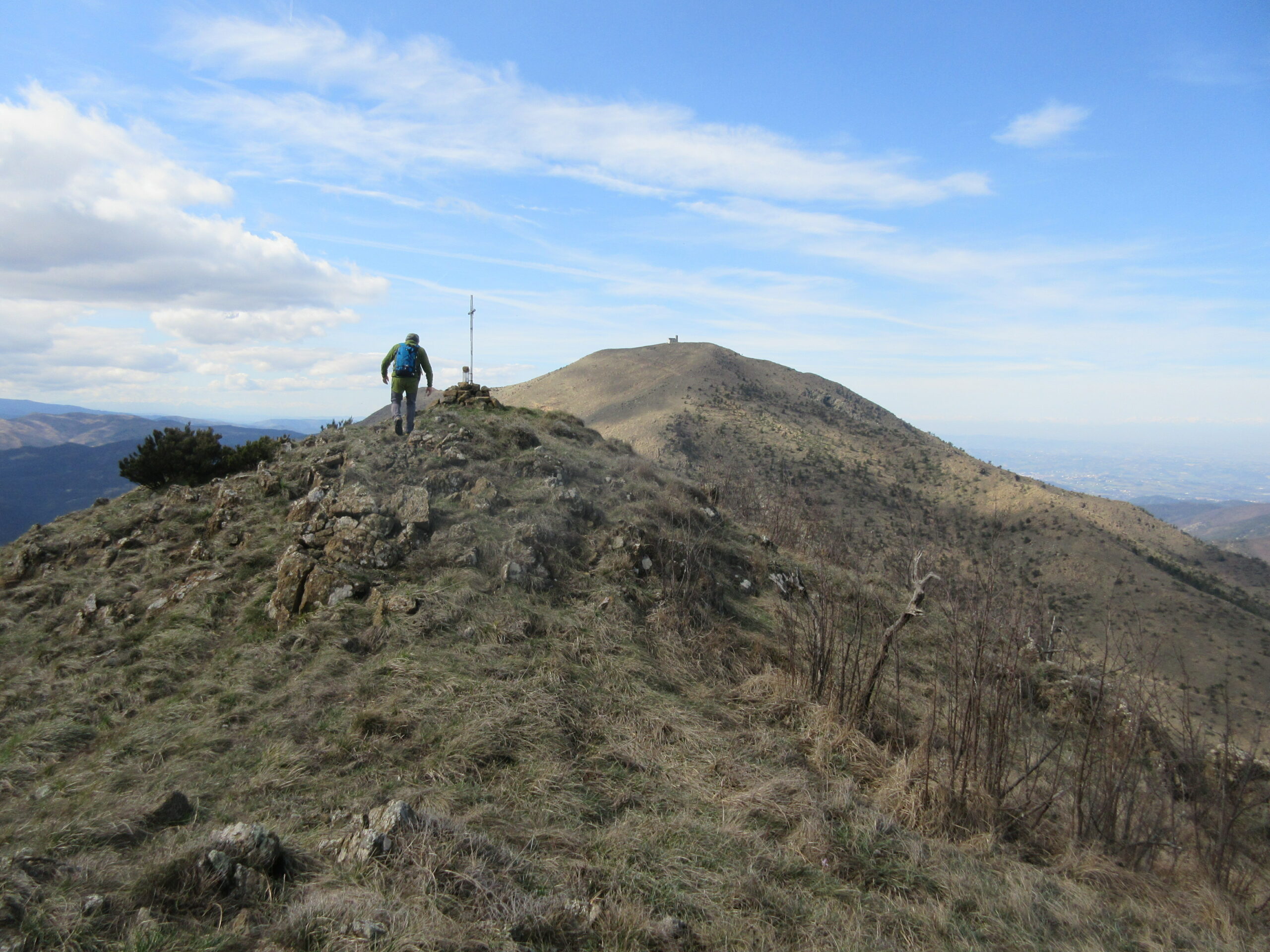 Oltrepassata la spaccatura si piega decisamente a sinistra seguendo il filo di cresta sino al bosco, passi di I° grado. Salire diritto nel bosco sino a un vago colle, si piega a destra, poi subito a sinistra verso I ‘alto ( cordone che penzola da un ramo), si sale ancora il ripido sentiero /traccia sino a un roccione con ometto, lo si oltrepassa tenendo la traccia che sale diritta ( due manate alla roccia), si Continua a salire, ometti, si enta in un boschetto e se ne esce a destra, (direzione Tobbio) ( 45 minuti dal parcheggio ). Uscendo dal bosco dopo 50 metri si tiene la traccia verso I ‘alto a sinistra, ometti, si Continua sul filo di cresta, piu ‘ o meno evidente, ometti, Dopodiche si arriva ad un bel punto panoramico a 360 °, ( 1 ora circa dal parcheggio ) seguiamo la cresta a destra in direzione del Bric della Croce ( senza croce ), si oltrepassa una zona di roccia rotta scalicchiando, e in direzione di cresta si Continua a salire verso destra, sino ad entrare in un boschetto rado, lo si risale, si supera un praticello brullo e con andamento a sinistra si raggiunge il Bric della Croce, ( 1ora e 20 dal parcheggio ) Da qui non ci si puo ‘ sbagliare, si segue la cresta sino al Bric Castiglione, ( 1 ora è 40), si scende in dieci minuti al passo della Dagliola e con altri 20 minuti si arriva al Tobbio. 2 ore e 10 dal parcheggio.