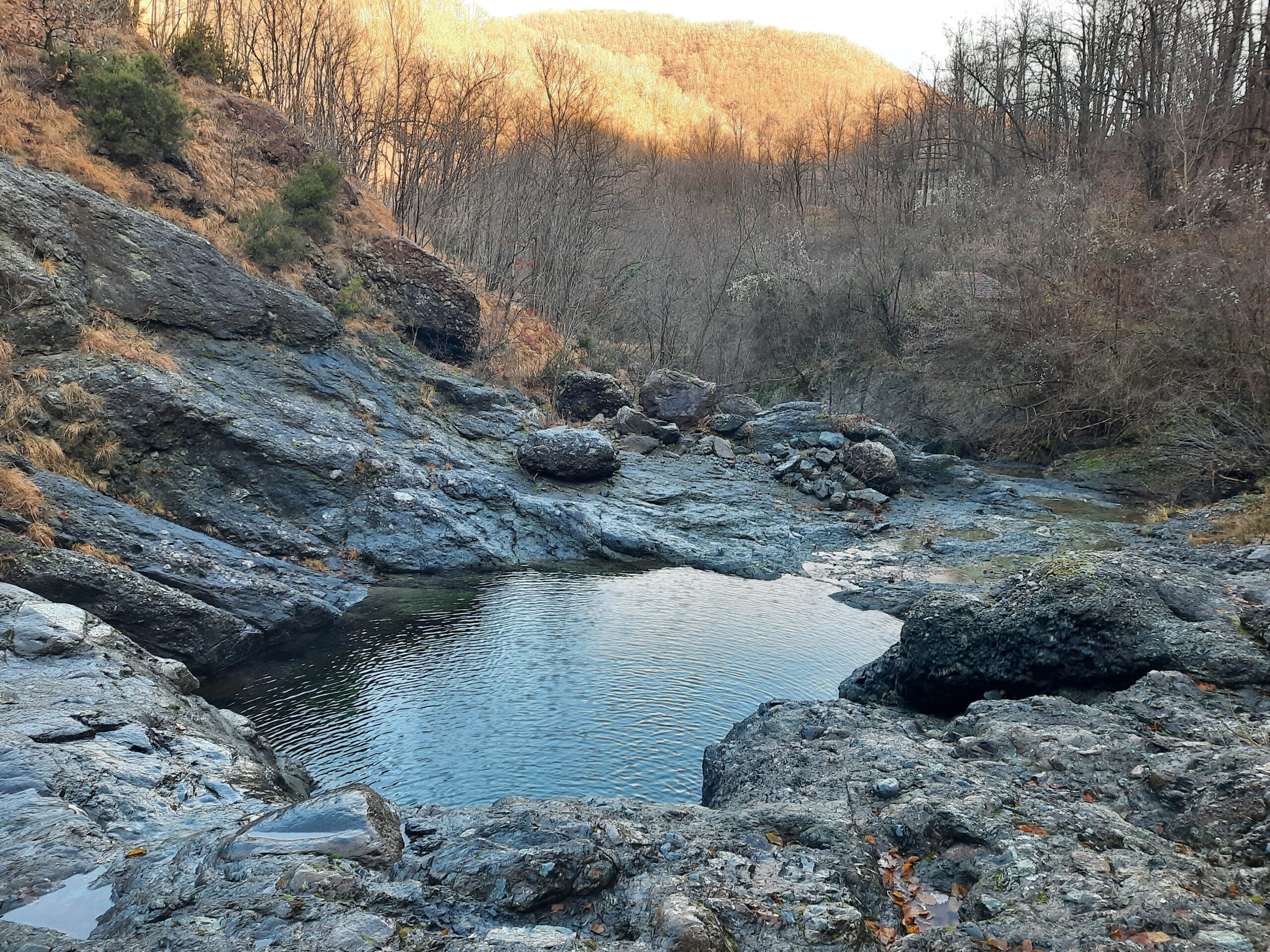 Si parcheggia in piazza Tomaso Gazzolo o Principe Gerolamo de Ferrari. Si torna indietro sui nostri passi sino al ponte, prima di esso si imbocca la strada a destra e la si percorre sino alla fine. Si incontra una sbarra Verde, la si oltrepassa e si cammina in strada carraia privata, in bosco di castagno. Troviamo una casetta bianca e superatala dopo poco si incontra il rio Lavagetta, lo so guada e al primo bivio si tiene la destra, si segue la strada che segue il percorso del ruscello. Dopo poco si raggiunge il lago delle ciocche. ( 20 minuti dal parcheggio ) Trenta metri prima del muraglione di cemento si prende una traccia a sinistra nel bosco. Appena dopo si oltre passa un rigagnolo e si Continua a destra con percorso in salita, ometti, si segue la traccia a sinistra in salita senza mai scendere in direzione del ruscello. Si arriva cosi alla Pietra Spaccata a V, ( 30 minuti dal parcheggio )