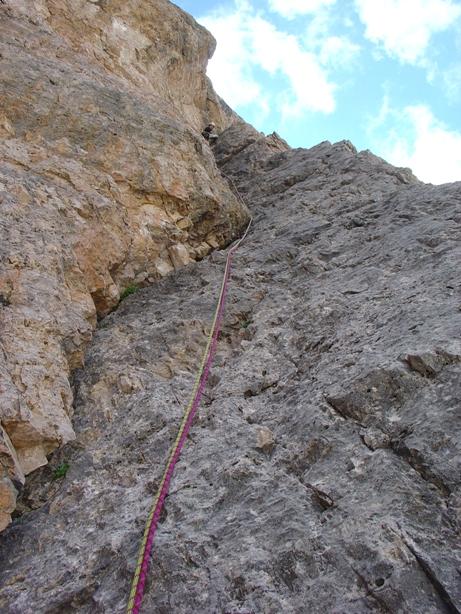 - Tiro 4: salire lungo il diedro. (nel diedro ci sono alcuni fatiscenti vecchi chiodi e cunei di legno. Si Auspica che restino in loco come testimonianza di una storica tecnica di chiodatura. 5+