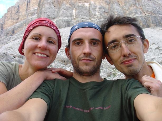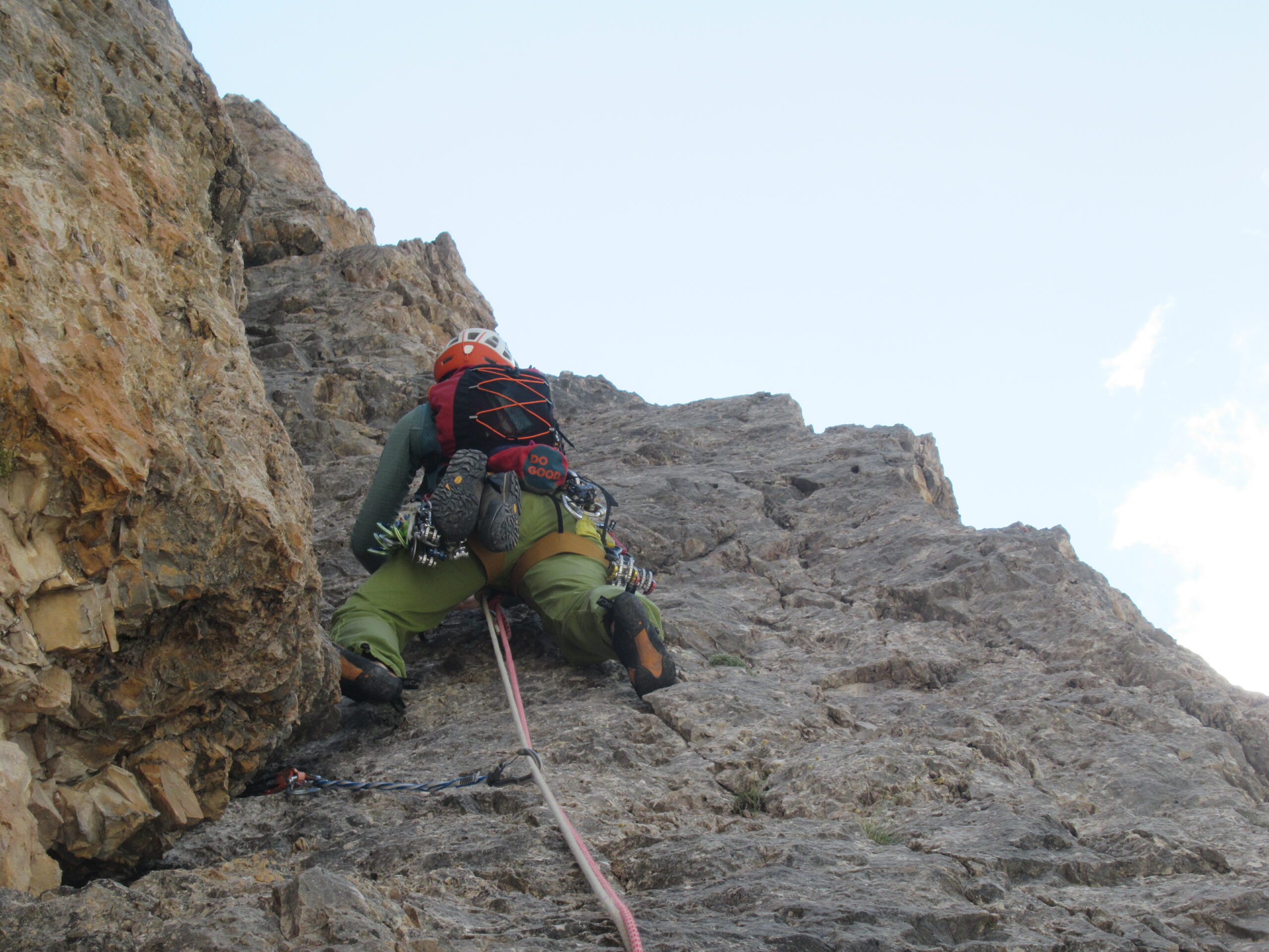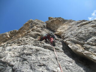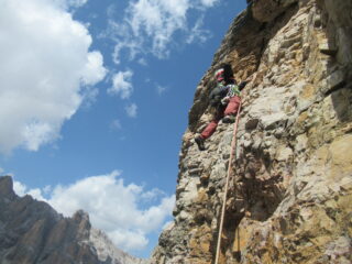 - Tiro 1: salire (cordino rosso) per parete nera-grigia fino ad una grossa cengia detritica (5+)