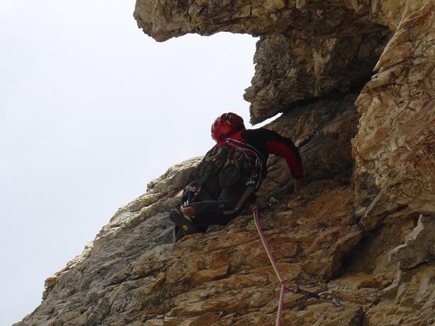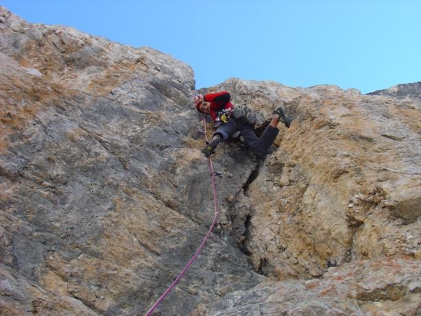 - Tiro 5: una fessura strapiombante ci permette di raggiungere un comodo punto di sosta. Passaggio chiave della via: 6a+ oppure A0.