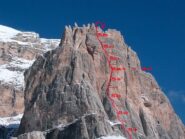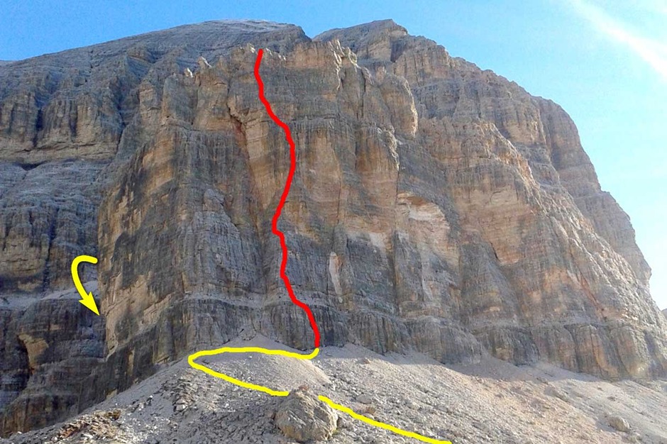 Questa volta la linea corre lungo la parete sud-ovest del Castelletto (Tofana di Rozes) ed ha il passaggio chiave di 6a (superabile in Ao) su una fessura strapiombante a circa metà via.