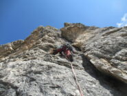 - Tiro 2: una fessurina porta sotto ad un piccolo tetto: superarlo e tenersi sulla destra, per evitare 4m di roccia instabile. Proseguire per belle placche leggermente appoggiate (5c)
