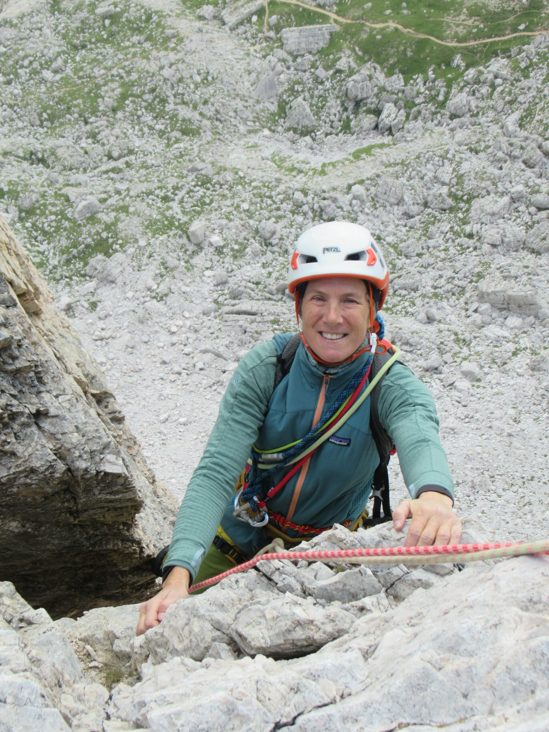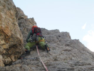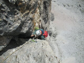 - Arrivati alla forcella dei Col dei Bos, continuare lungo il sentiero 402 fino alle trincee militari. Arrivati circa sotto la verticale della linea di salita, reperite una traccia che faticosamente conduce all'attacco salendo fra grossi detriti e ravaneti.