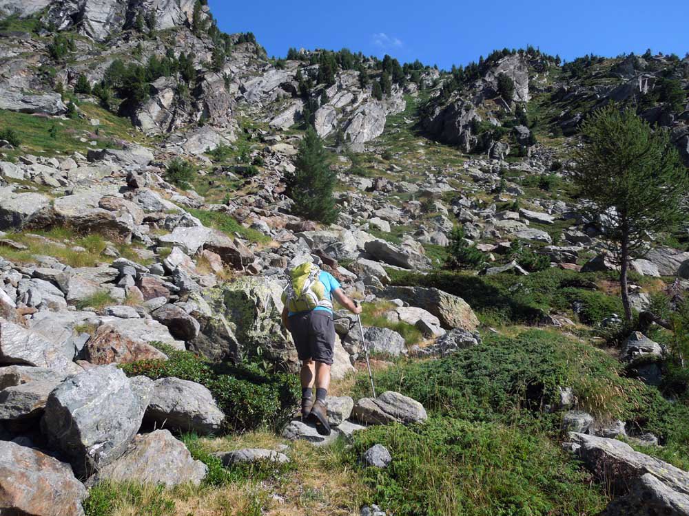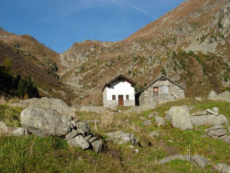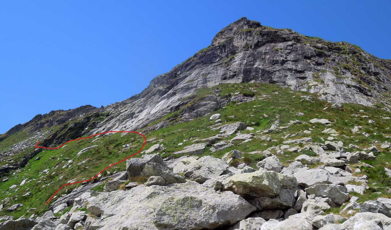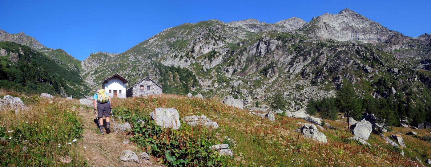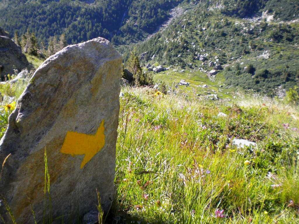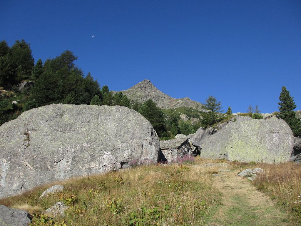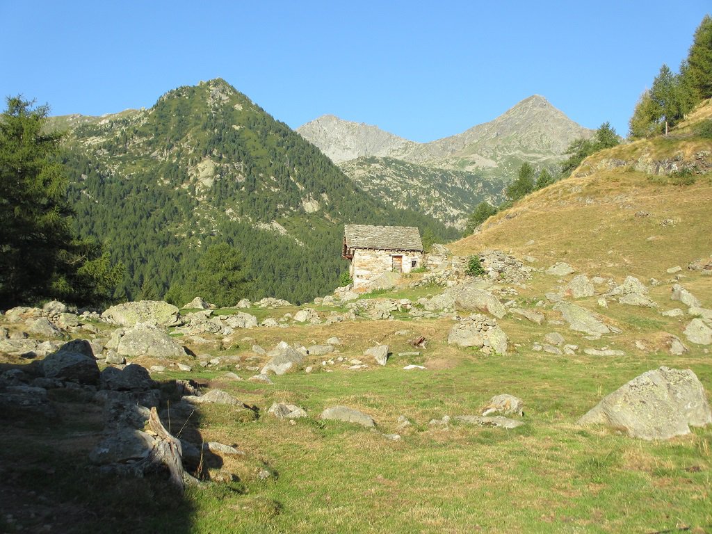 Si prosegue a monte dell’alpeggio, sempre su sentiero ben segnalato, in direzione ovest, raggiungendo in breve un ruscello che sgorga dalla montagna (ultima acqua che si incontra), e quindi si riprende a salire per magri pascoli su terreno abbastanza ripido.