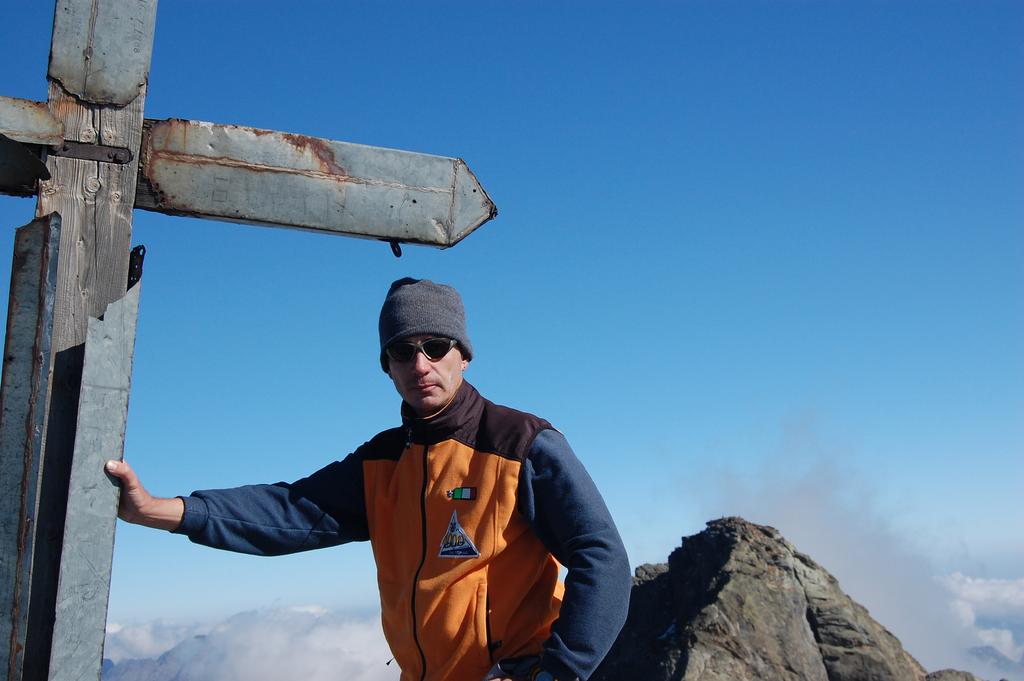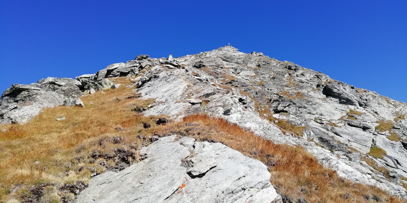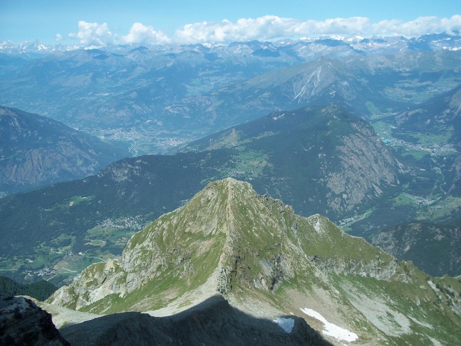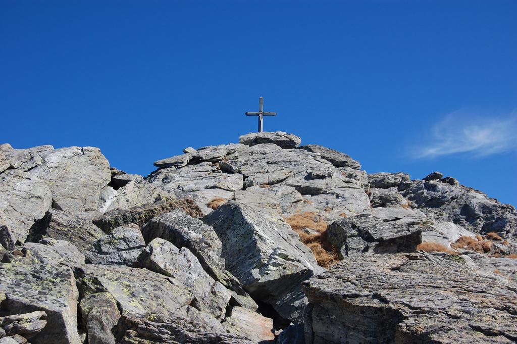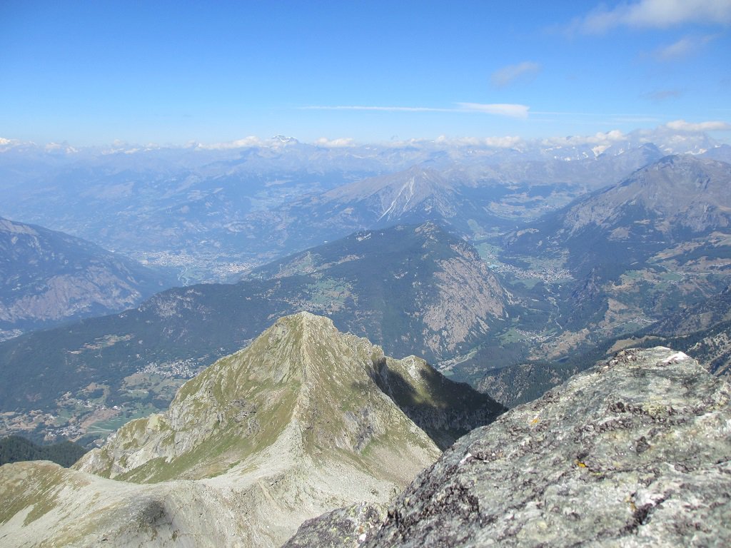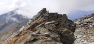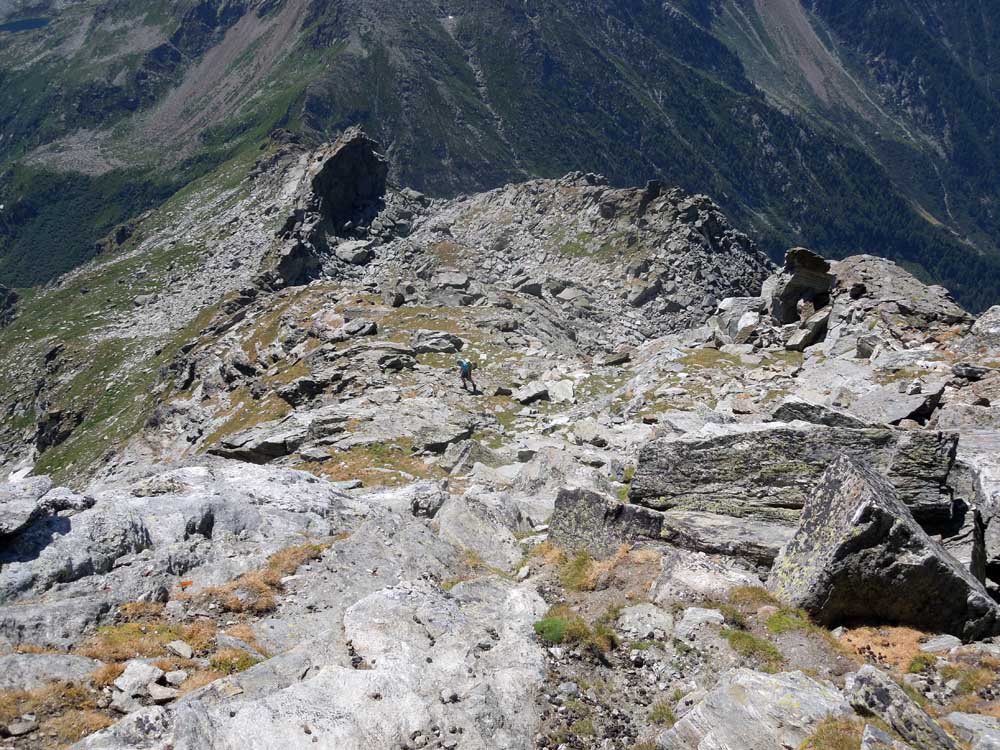 Ora il percorso si mantiene in cresta, per un primo breve tratto leggermente aerea, tra tracce e roccette, e poi decisamente più comoda e larga. Si alternano tratti di sentiero ad altri con roccette e detriti, raggiungendo una spianata pochi metri sotto la cima. Si superano le roccette finali che non destano preoccupazione fino all’aerea vetta (attenzione al baratro sul versante Val d’Ayas).