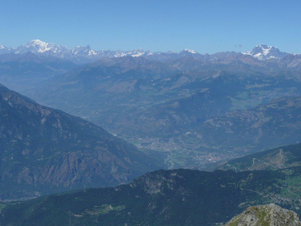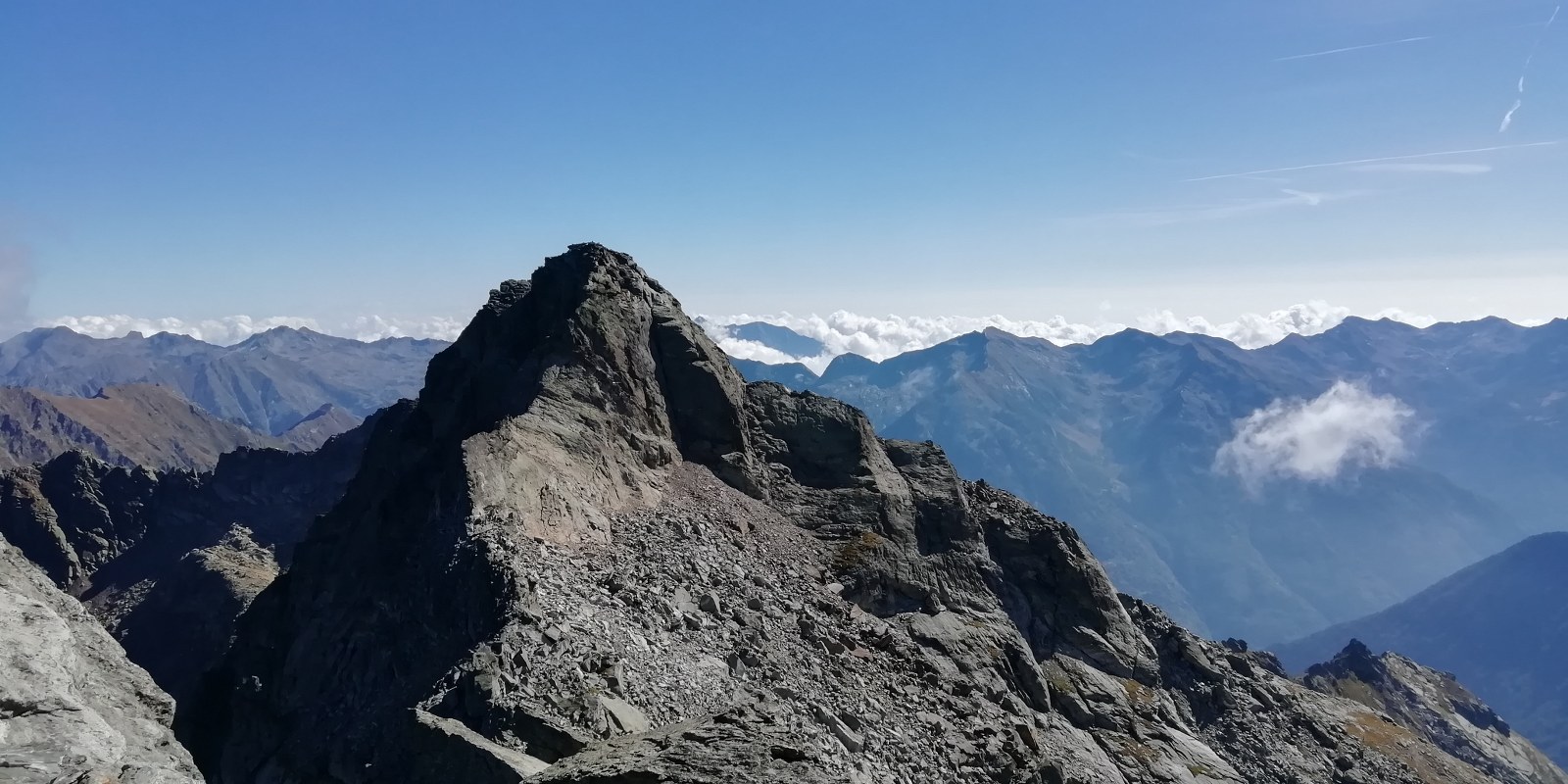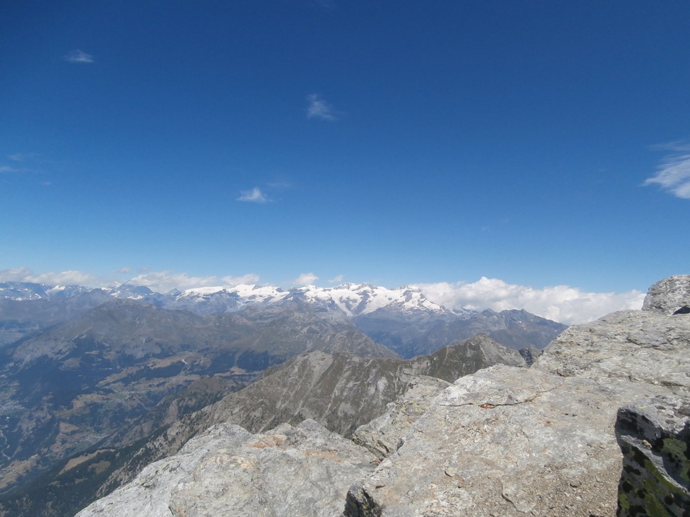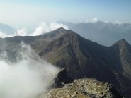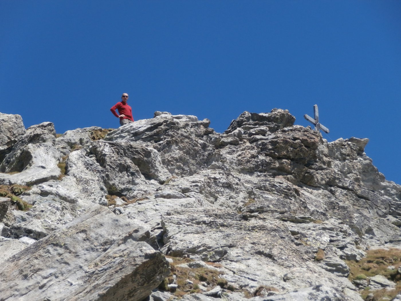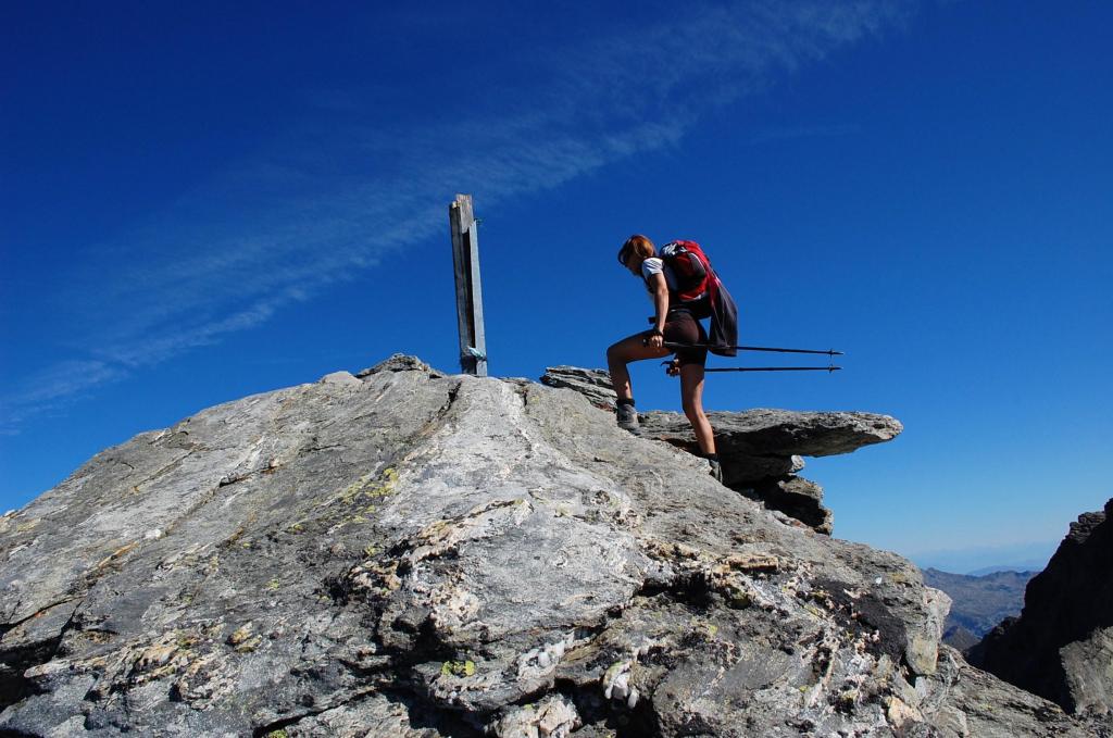 Ora il percorso si mantiene in cresta, per un primo breve tratto leggermente aerea, tra tracce e roccette, e poi decisamente più comoda e larga. Si alternano tratti di sentiero ad altri con roccette e detriti, raggiungendo una spianata pochi metri sotto la cima. Si superano le roccette finali che non destano preoccupazione fino all’aerea vetta (attenzione al baratro sul versante Val d’Ayas).
