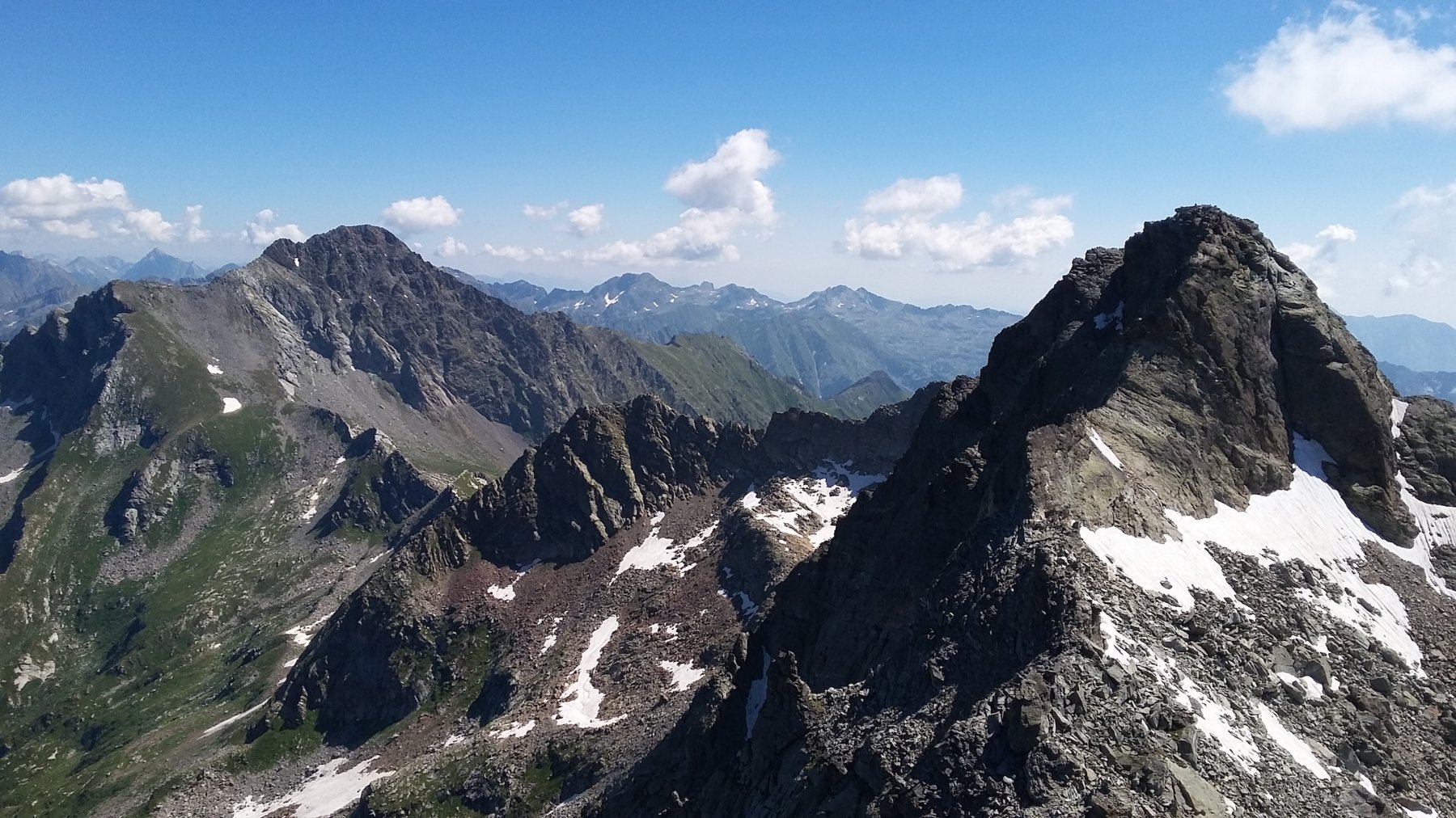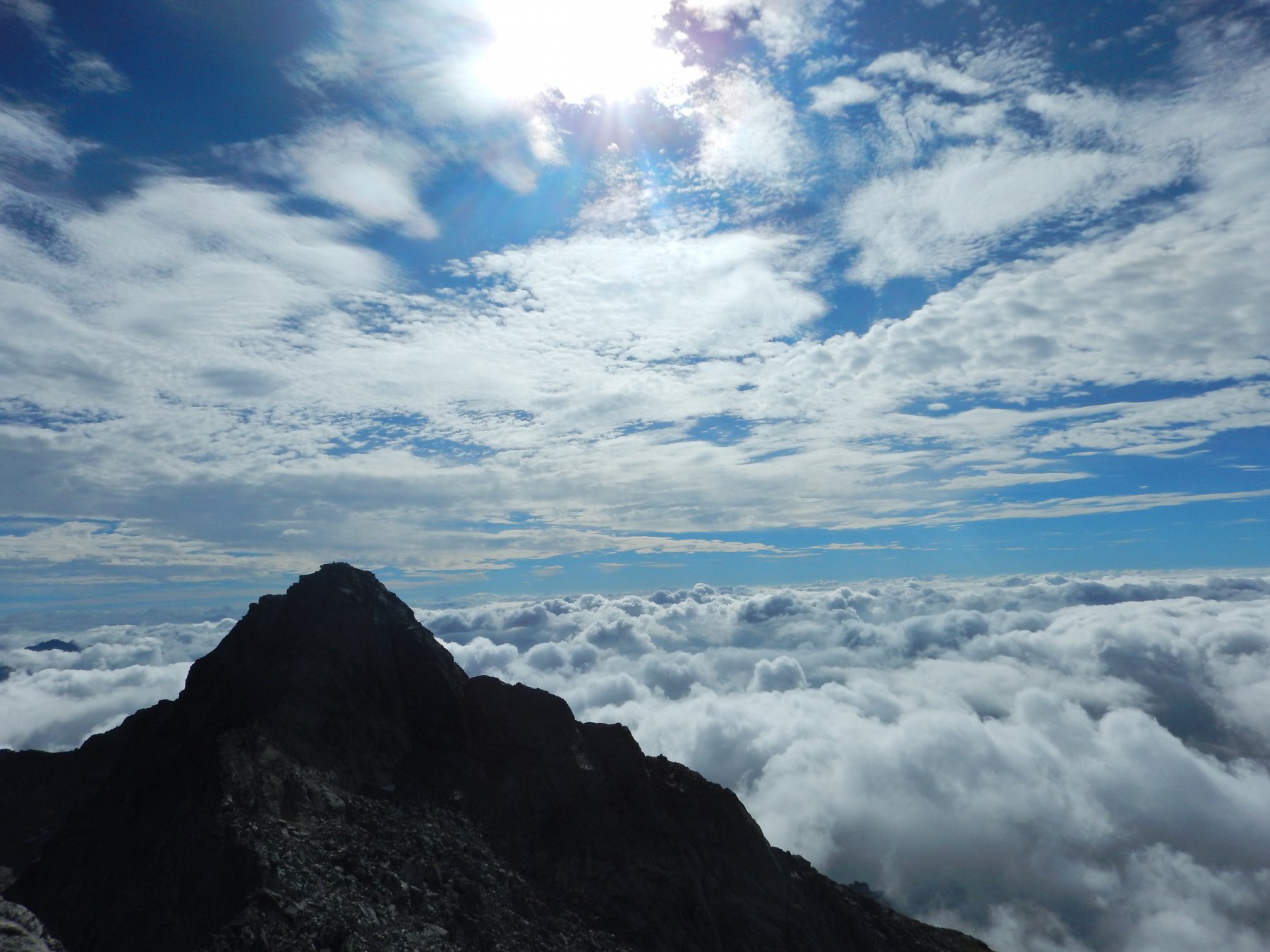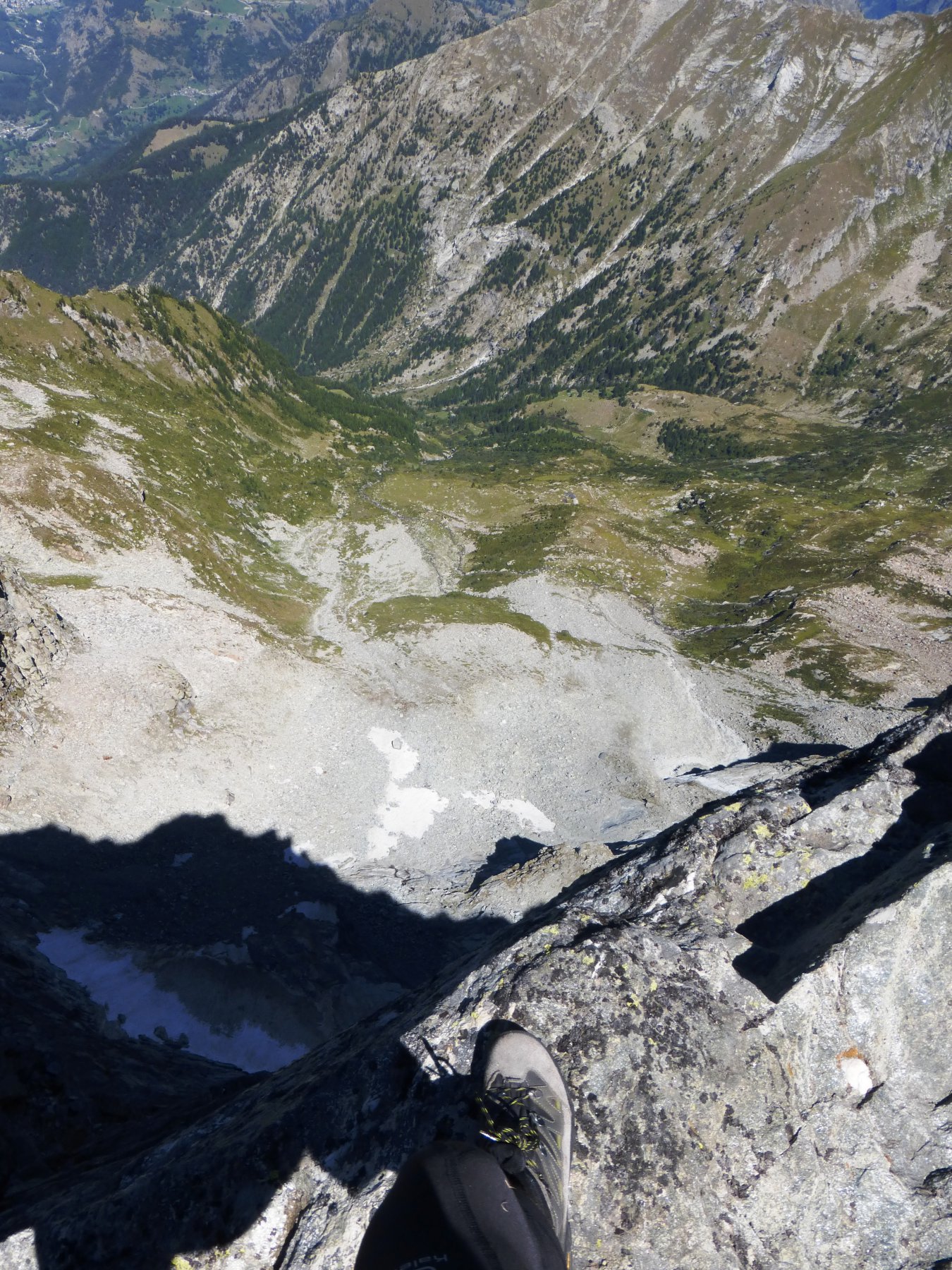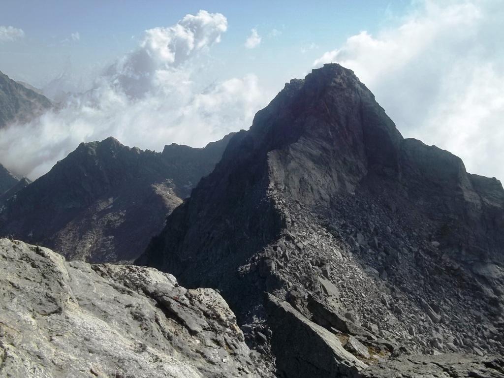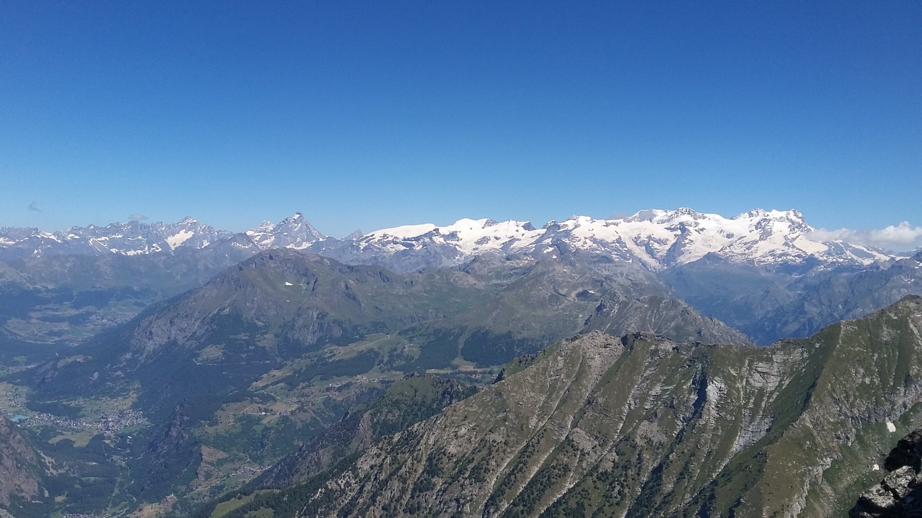 Ora il percorso si mantiene in cresta, per un primo breve tratto leggermente aerea, tra tracce e roccette, e poi decisamente più comoda e larga. Si alternano tratti di sentiero ad altri con roccette e detriti, raggiungendo una spianata pochi metri sotto la cima. Si superano le roccette finali che non destano preoccupazione fino all’aerea vetta (attenzione al baratro sul versante Val d’Ayas).