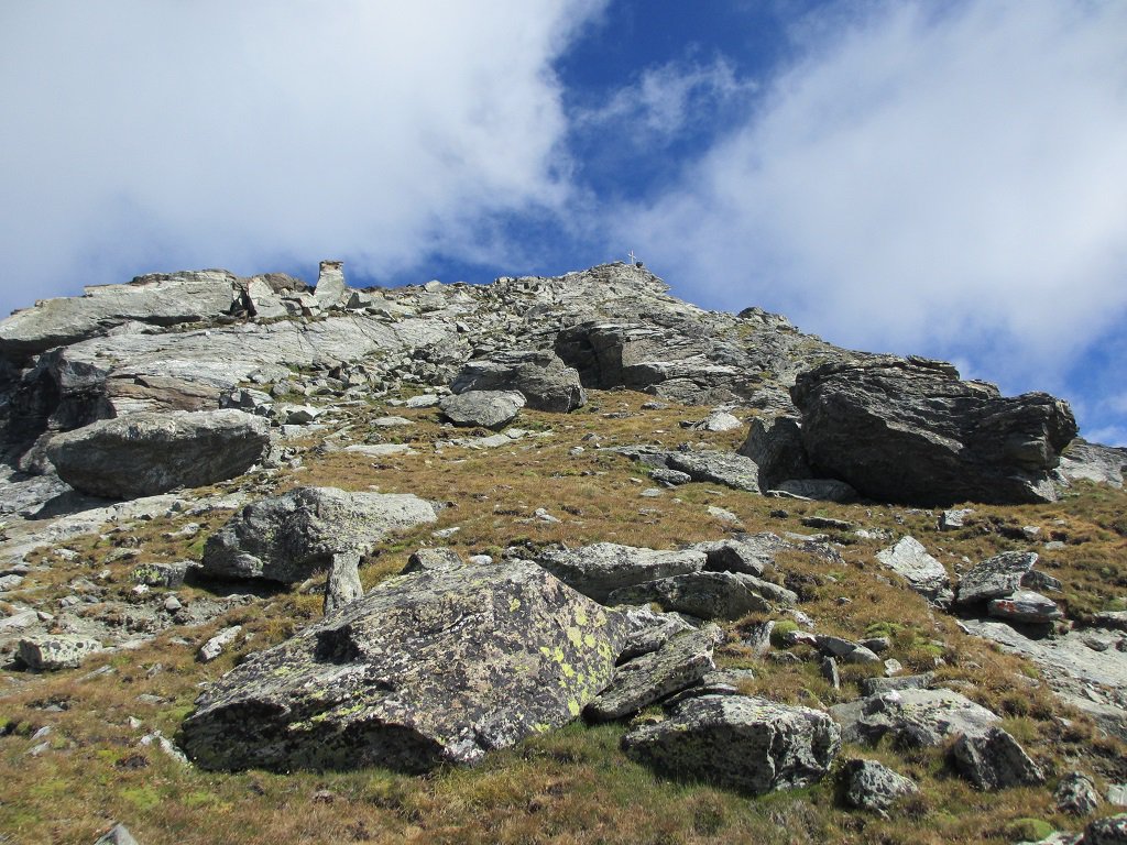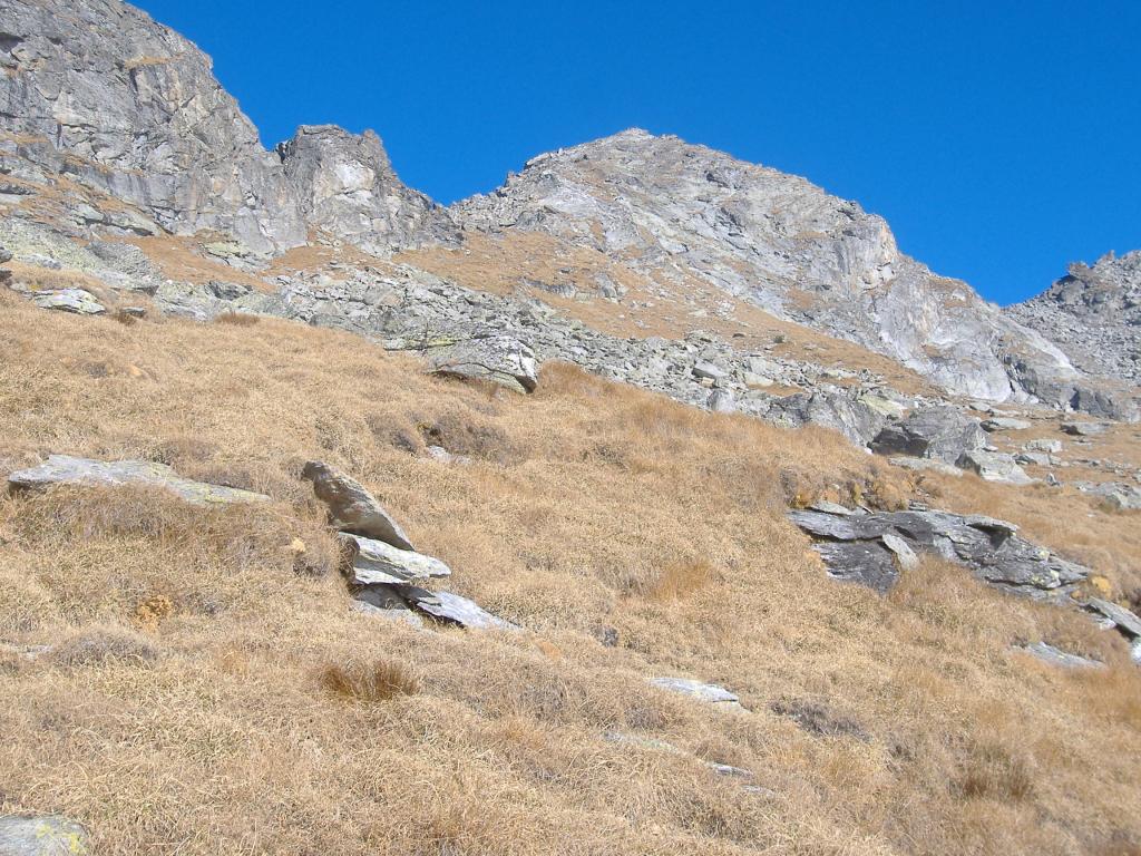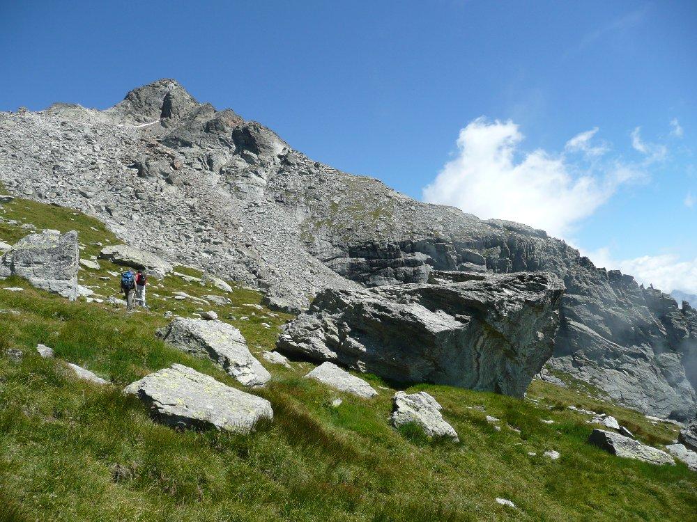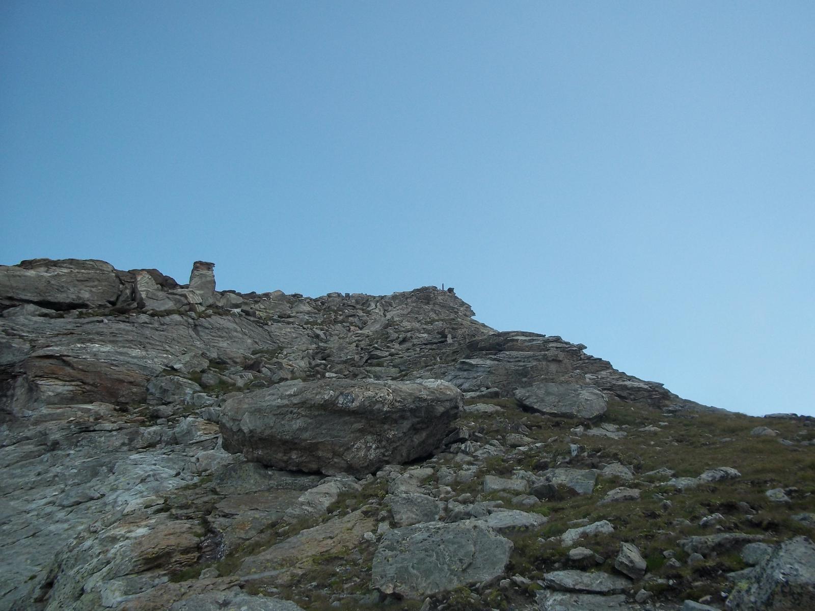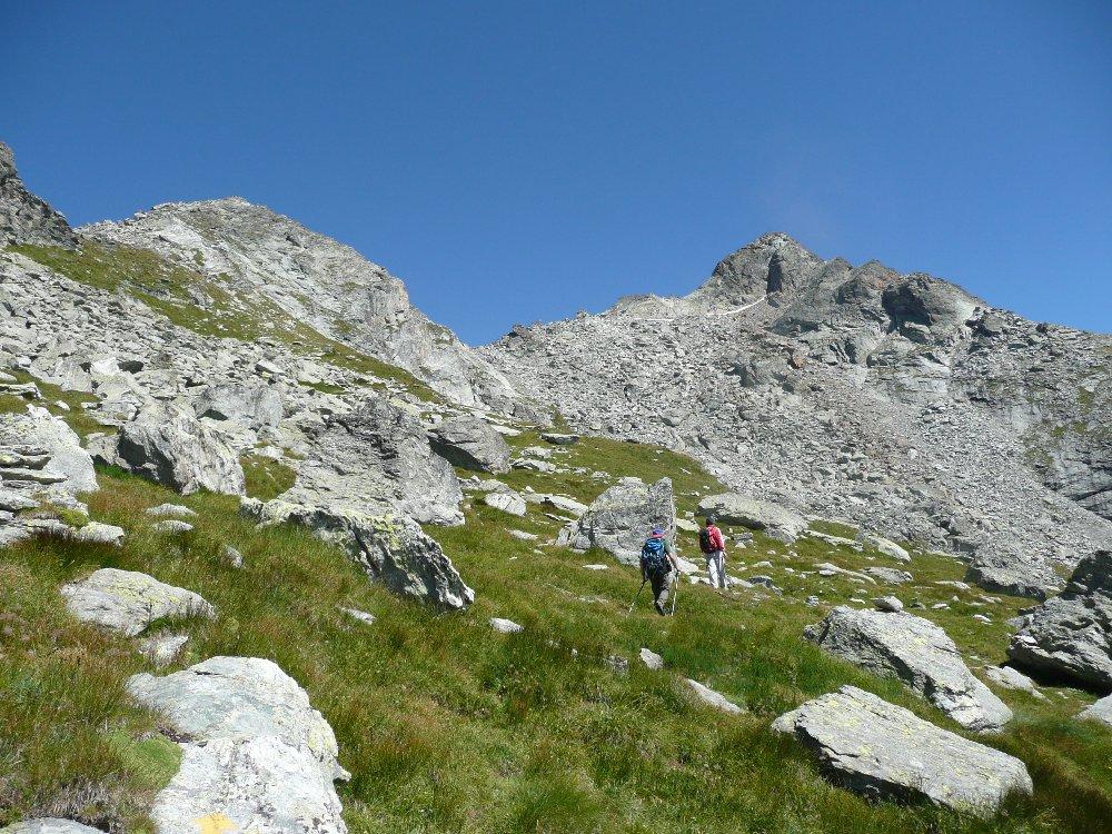 Si prosegue su un bell’altopiano di massi ed erba, in direzione della cima (nord) sempre più vicina. Il sentiero diventa nuovamente più ripido 50 m sotto il filo di cresta, che si guadagna per tracce; si esce ad un colletto sulla cresta a circa 2800 m, a monte della Becca di Dondeuil.