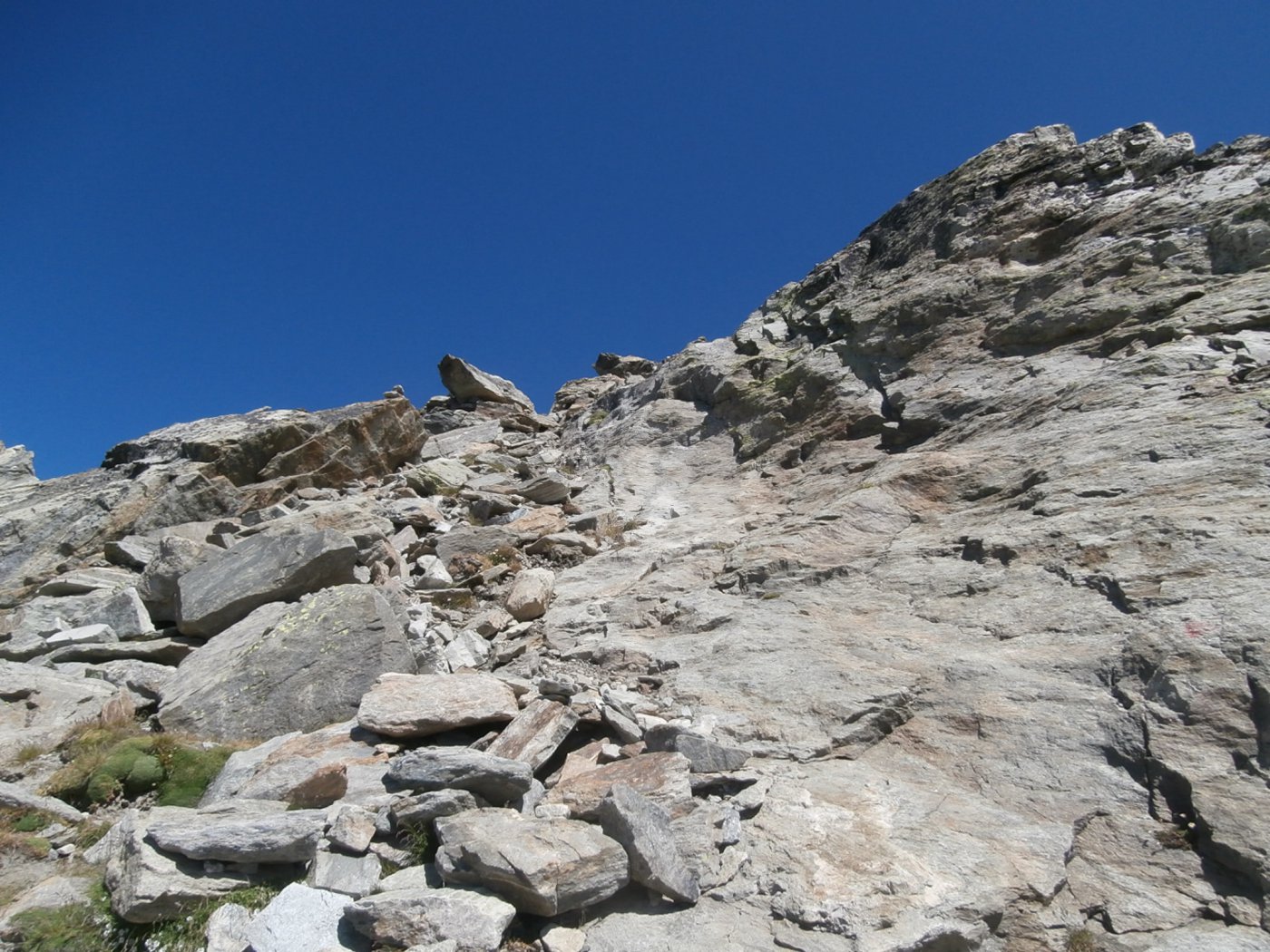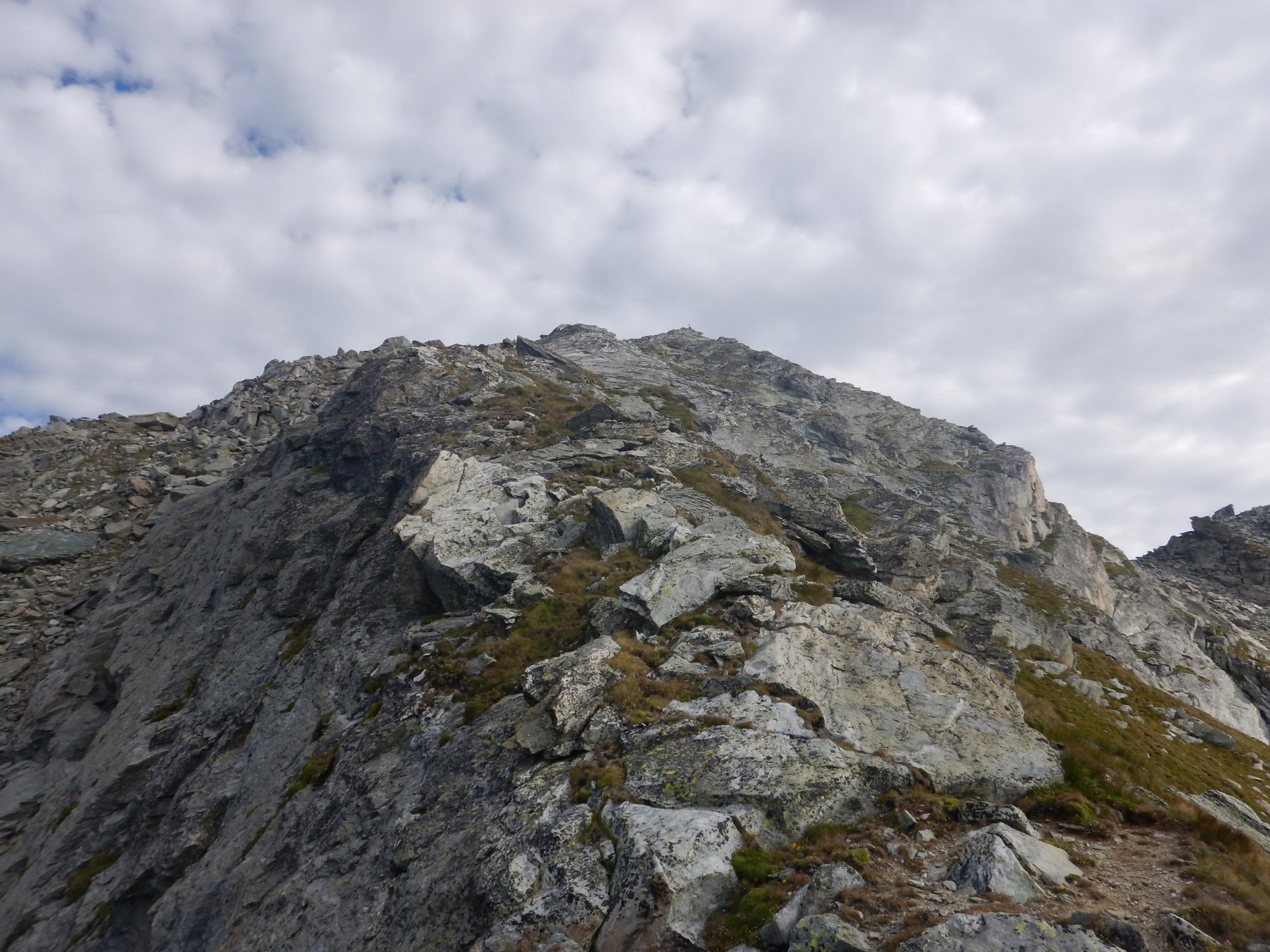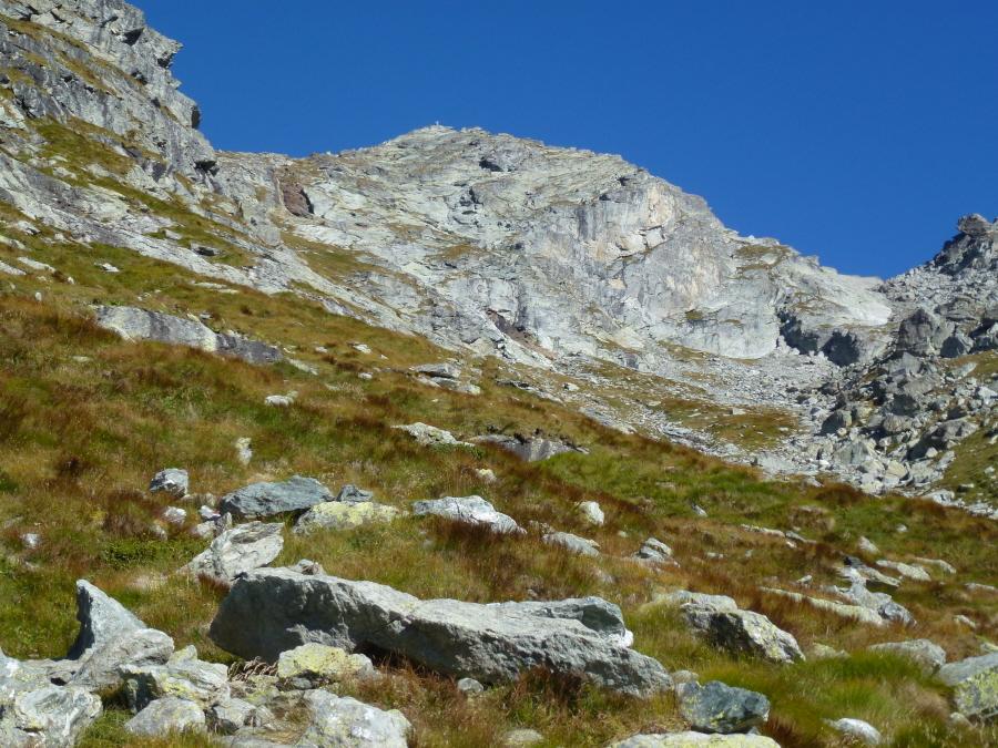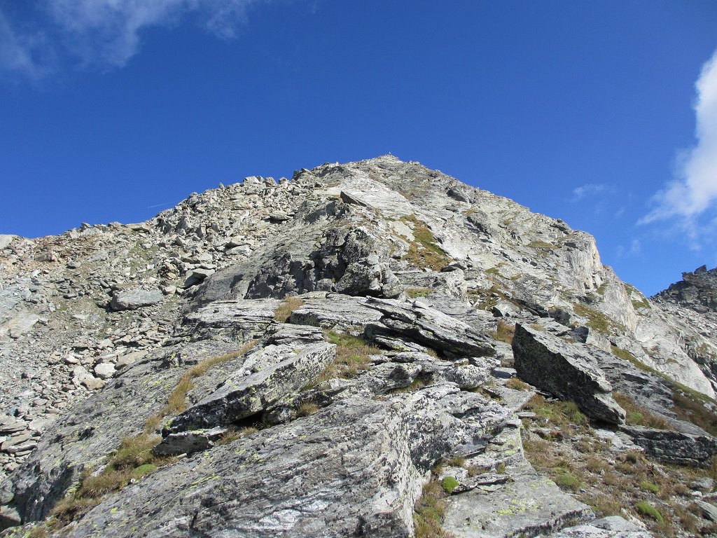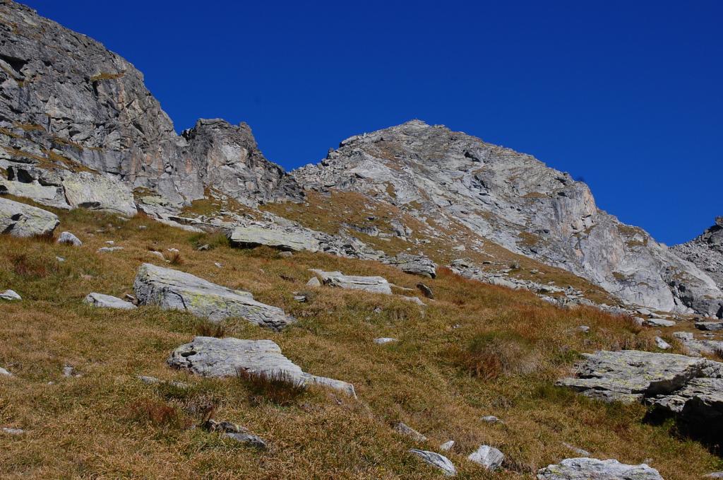Si prosegue su un bell’altopiano di massi ed erba, in direzione della cima (nord) sempre più vicina. Il sentiero diventa nuovamente più ripido 50 m sotto il filo di cresta, che si guadagna per tracce; si esce ad un colletto sulla cresta a circa 2800 m, a monte della Becca di Dondeuil.