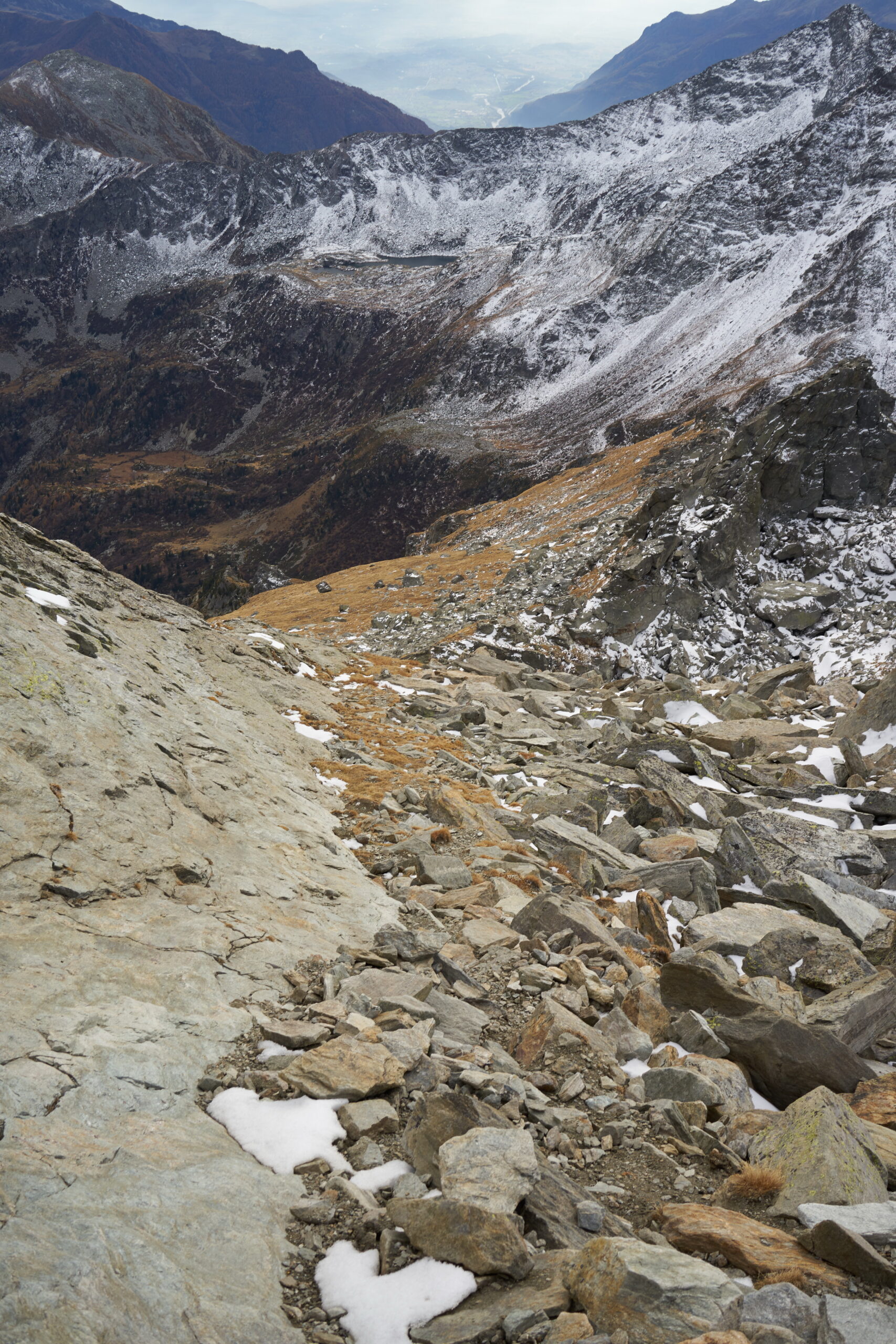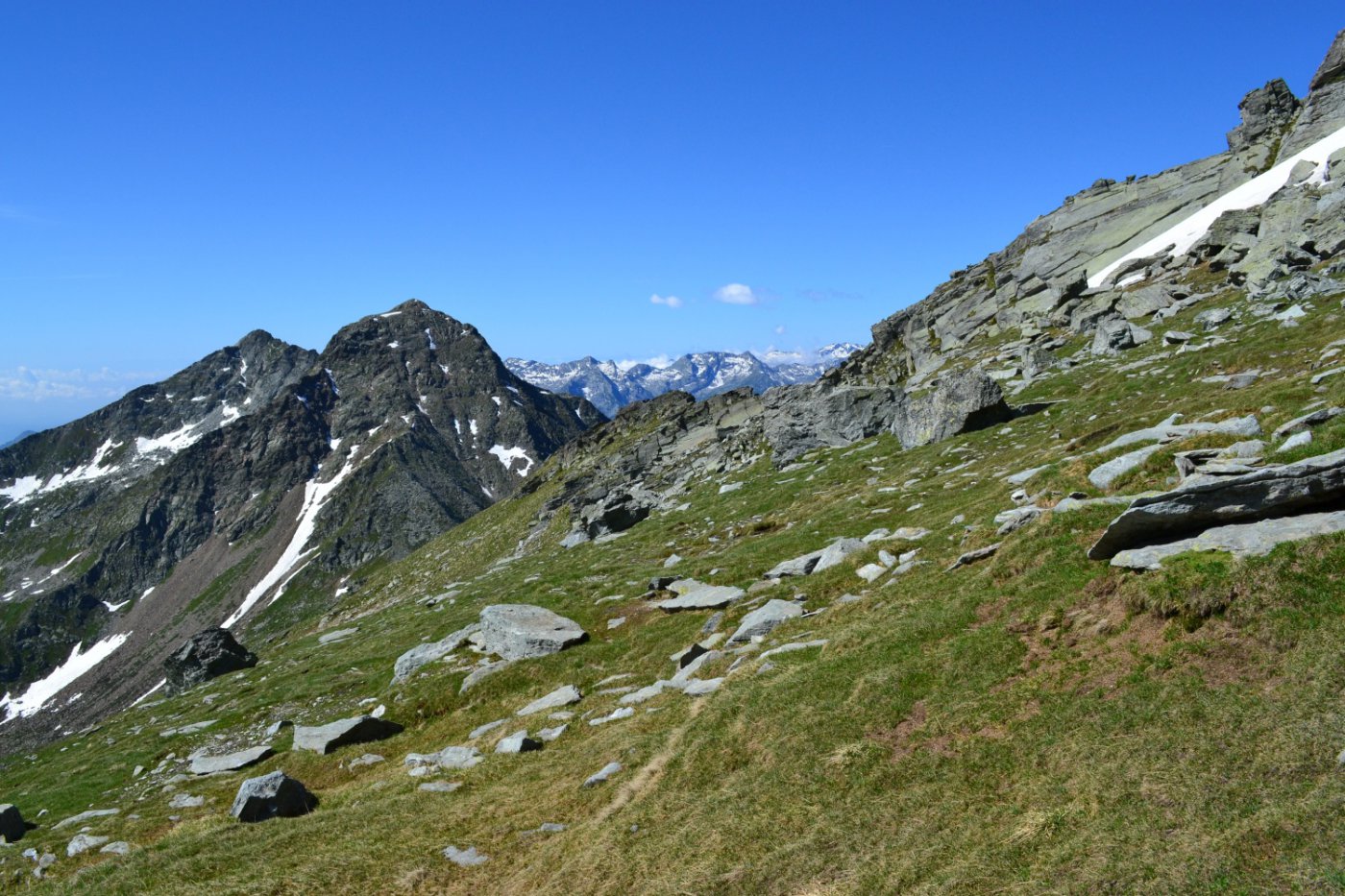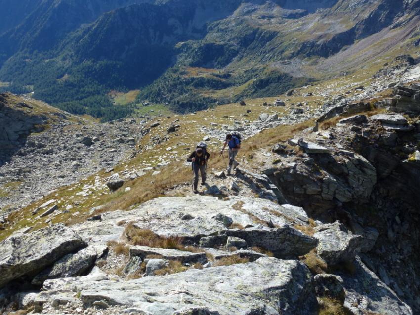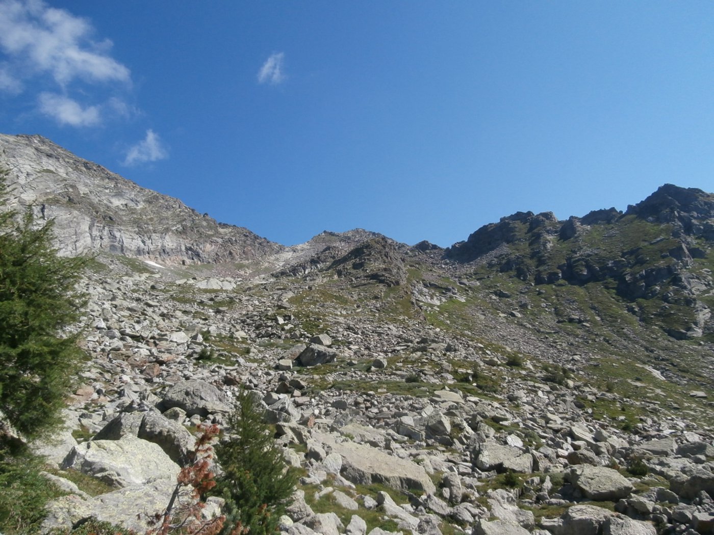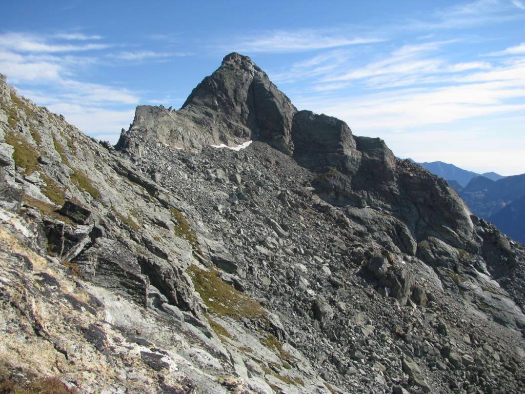 Si prosegue su un bell’altopiano di massi ed erba, in direzione della cima (nord) sempre più vicina. Il sentiero diventa nuovamente più ripido 50 m sotto il filo di cresta, che si guadagna per tracce; si esce ad un colletto sulla cresta a circa 2800 m, a monte della Becca di Dondeuil.