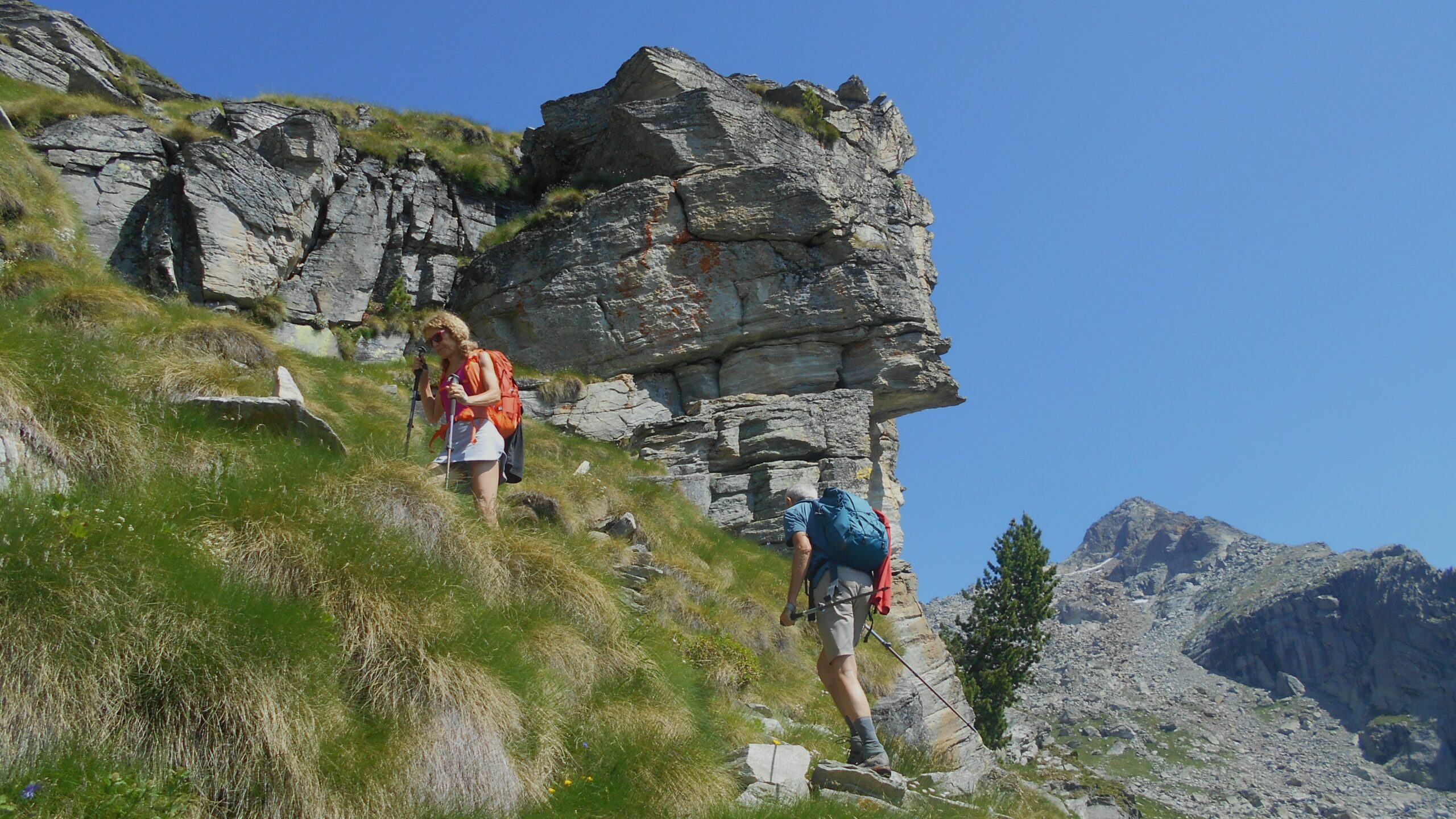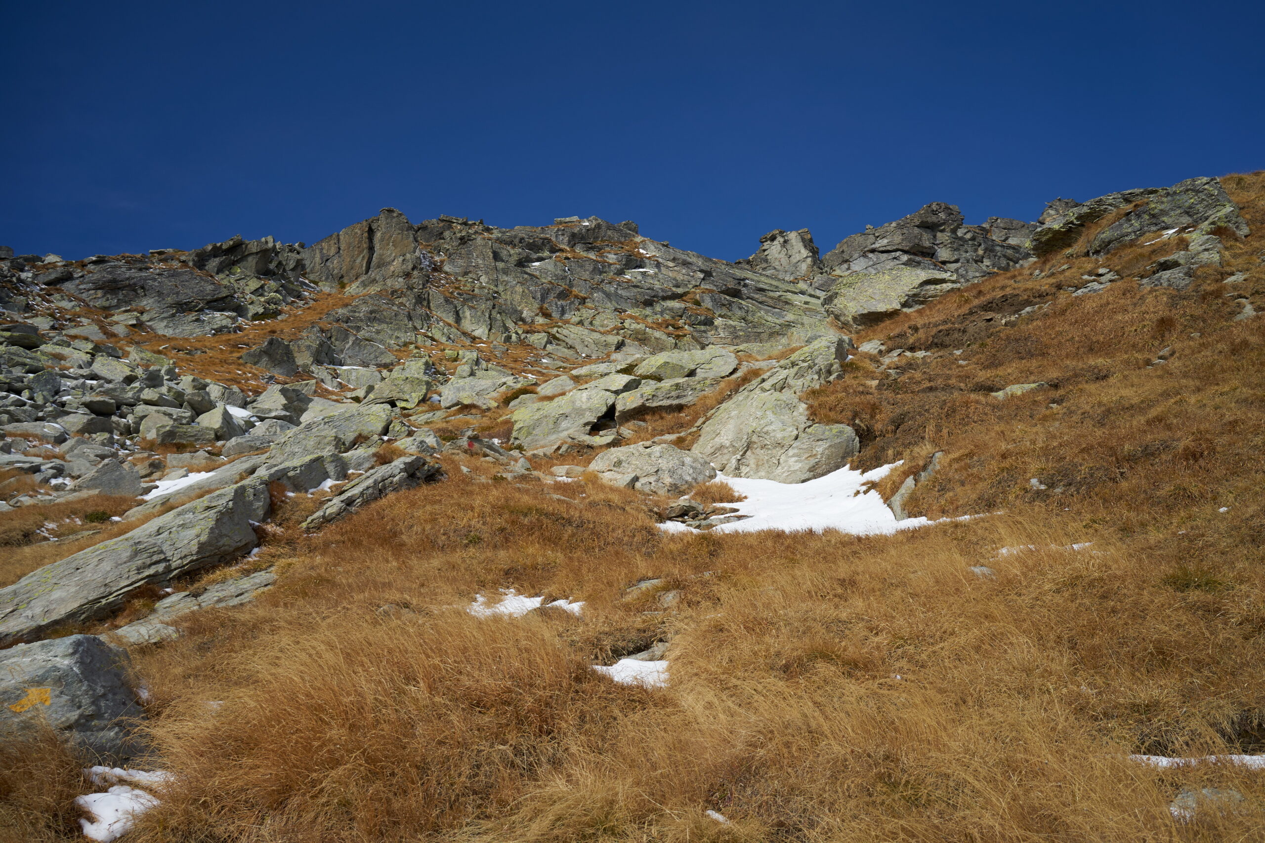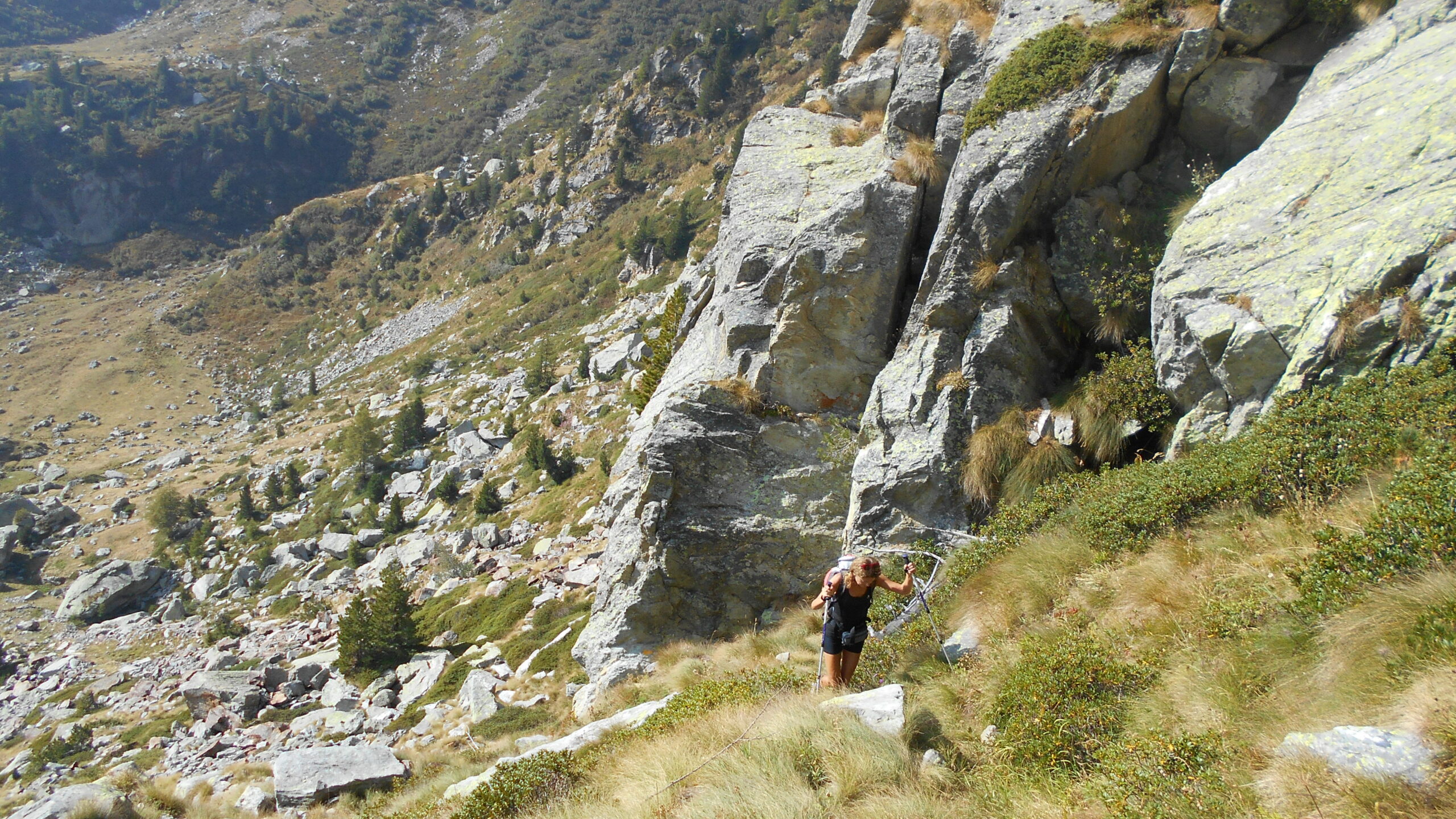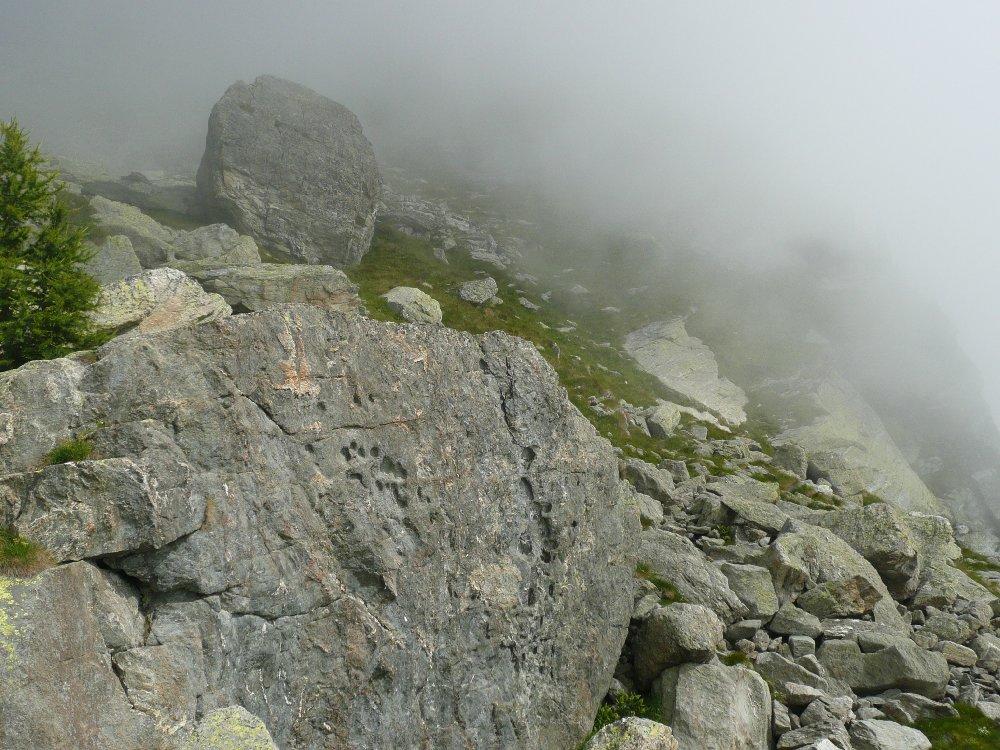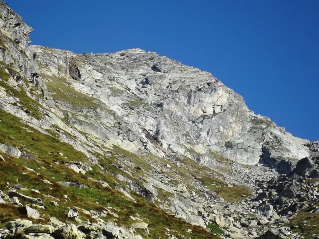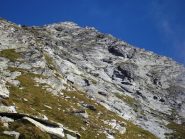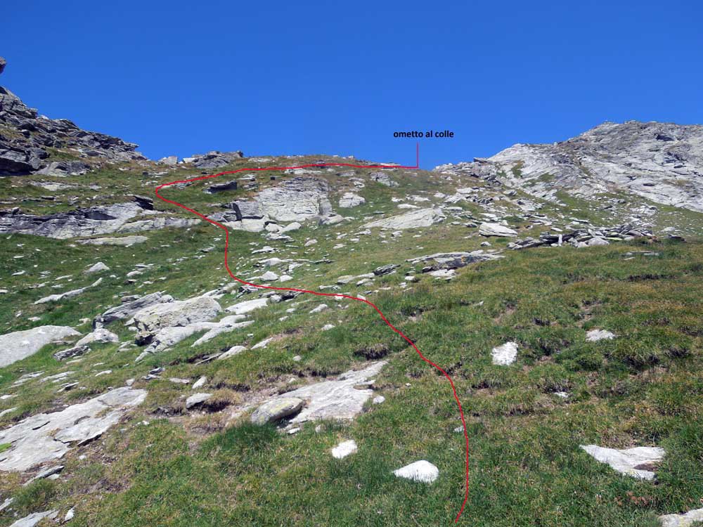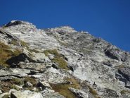 Giunti sotto una parete rocciosa, la si aggira spostandosi verso sinistra per poi percorrerla dall’alto. Qui si incontra il sentiero proveniente dal Colle Dondeuil.