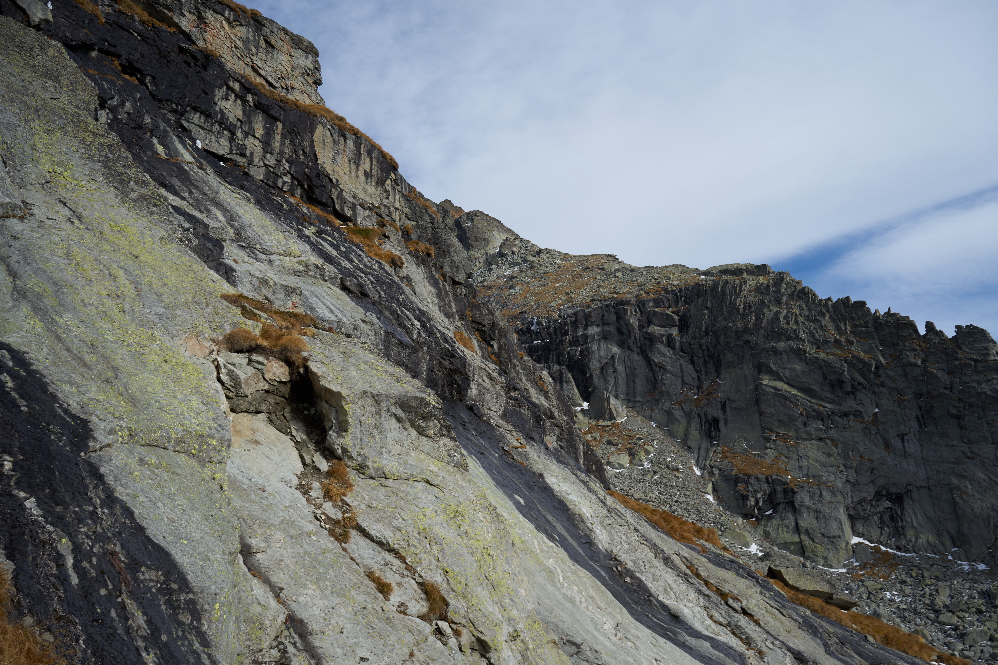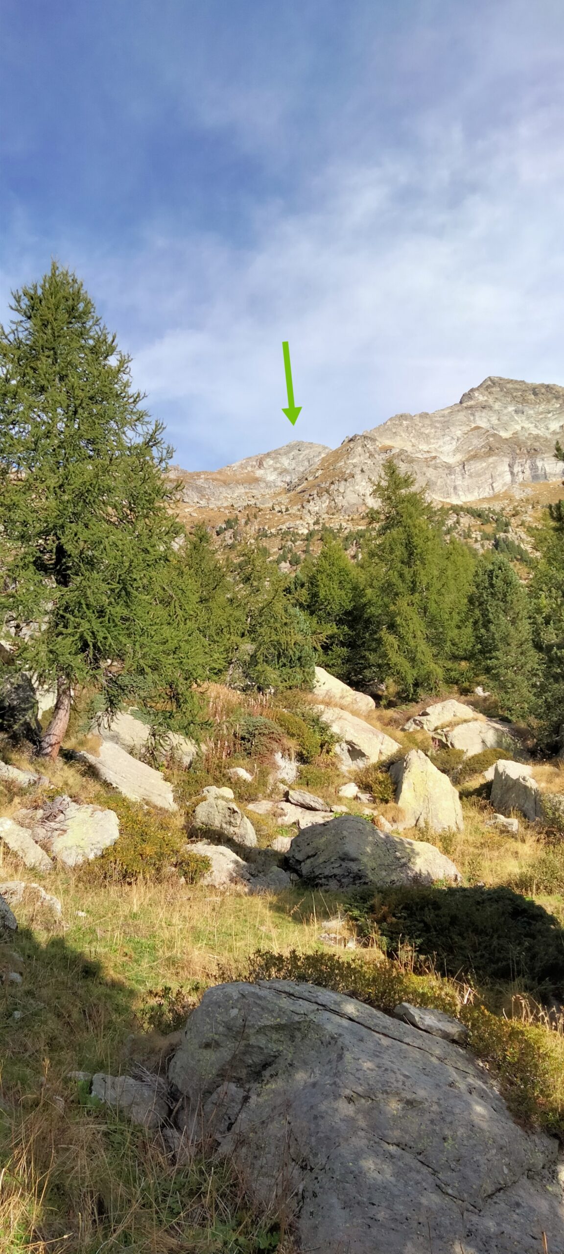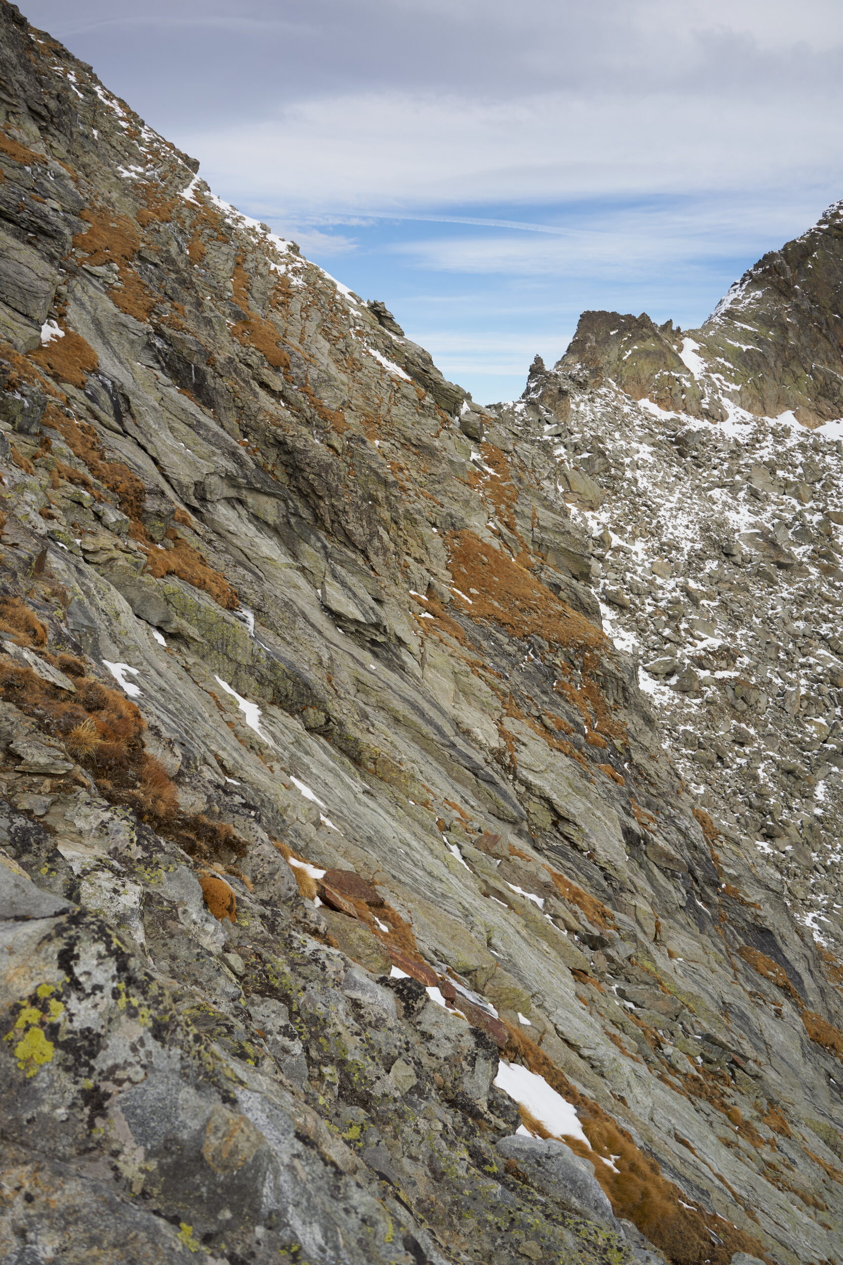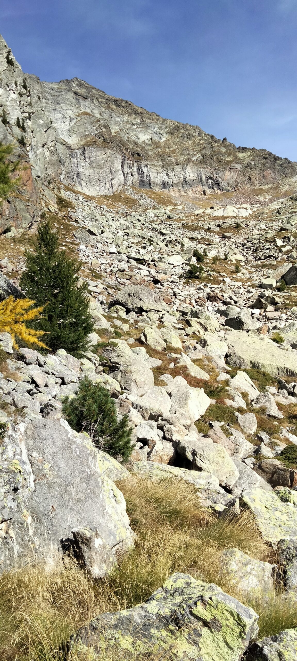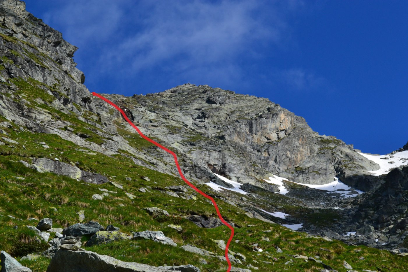 Giunti sotto una parete rocciosa, la si aggira spostandosi verso sinistra per poi percorrerla dall’alto. Qui si incontra il sentiero proveniente dal Colle Dondeuil.