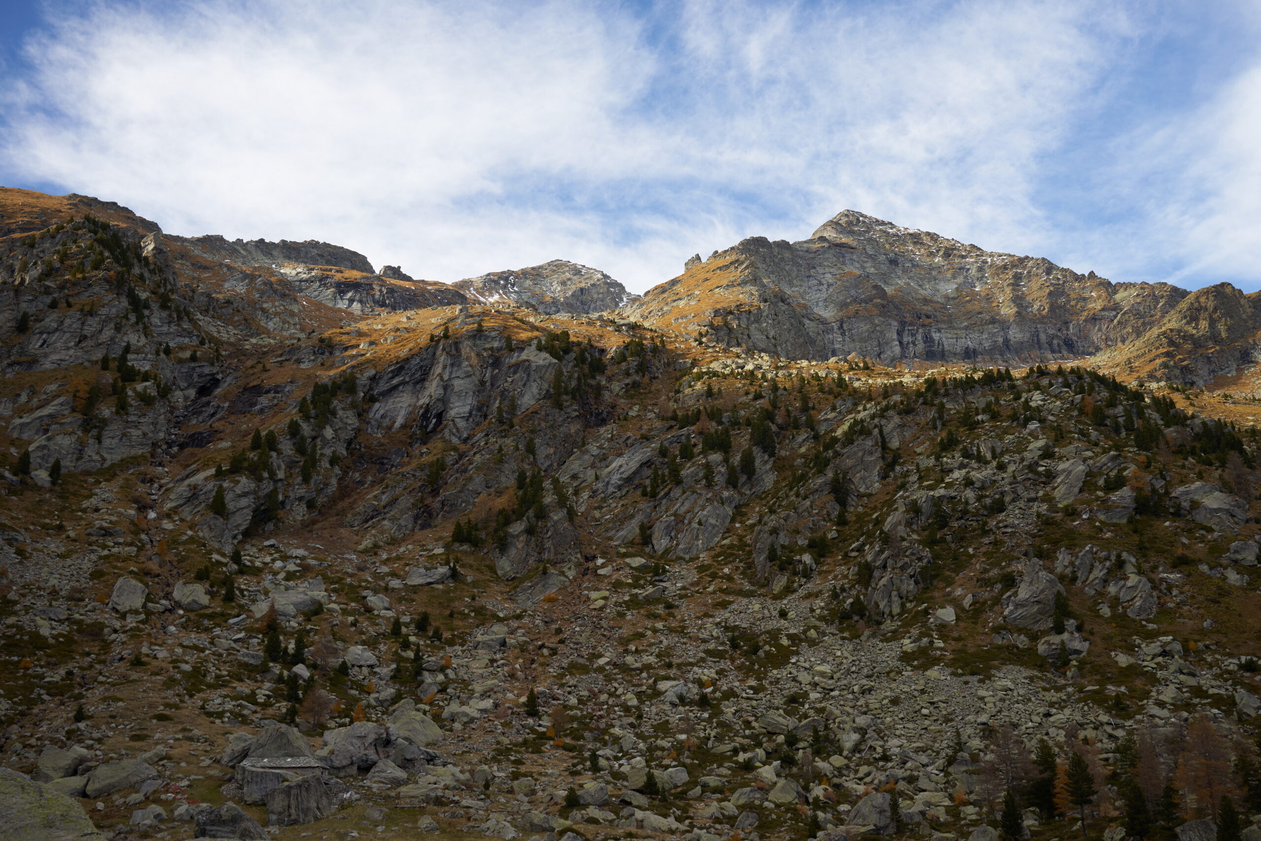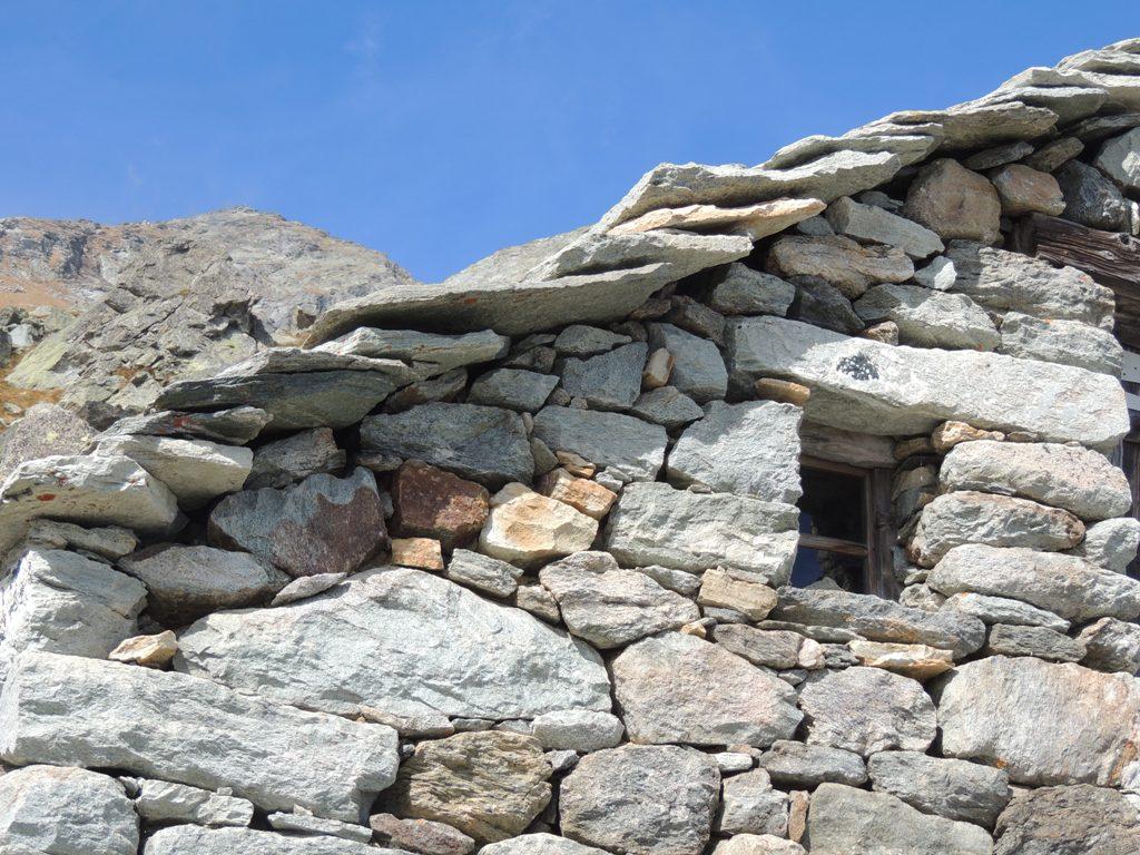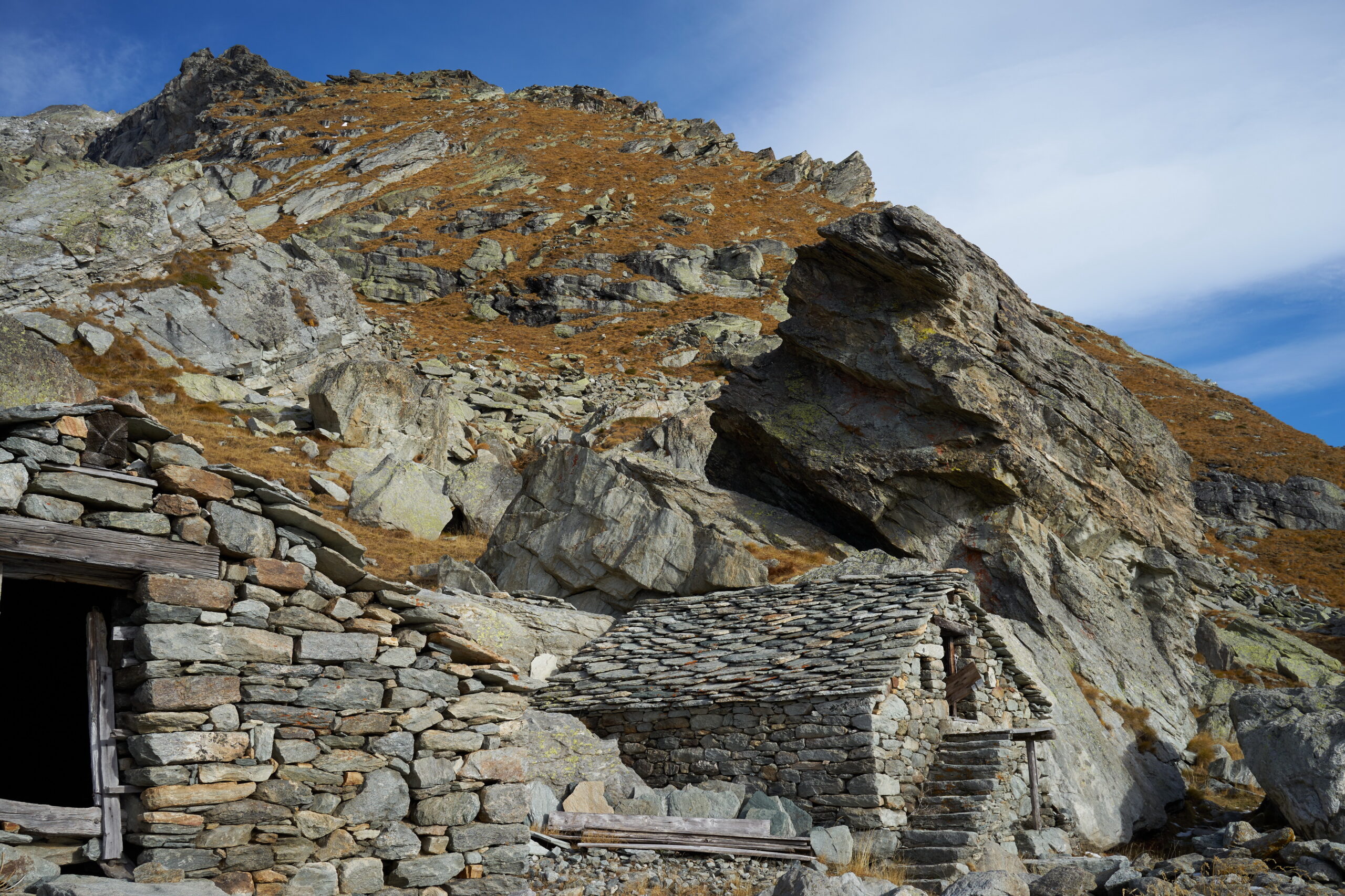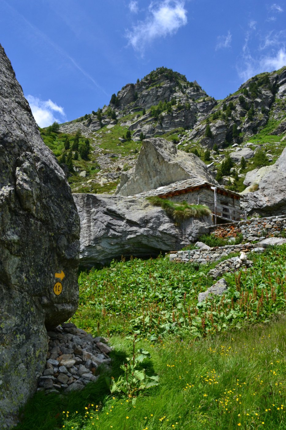 B (diretta) – Da Munes si lascia la traccia per il Col Dondeuil, e si piega di 90° verso destra, passando a destra del caratteristico alpeggio posto sotto un enorme masso. Il sentiero per un tratto poco marcato, attraversa una piccola pietraia e poi si infila in uno stretto canalino di erba e arbusti; la traccia sempre evidente è piuttosto ripida ed esile, la vegetazione talvolta infastidisce un po’. Dopo circa 200 m di dislivello si esce dal canale e si piega progressivamente a sinistra, sino a toccare l’Alpe Vlou Superiore 2368 m, situata in un posto estremamente selvaggio.