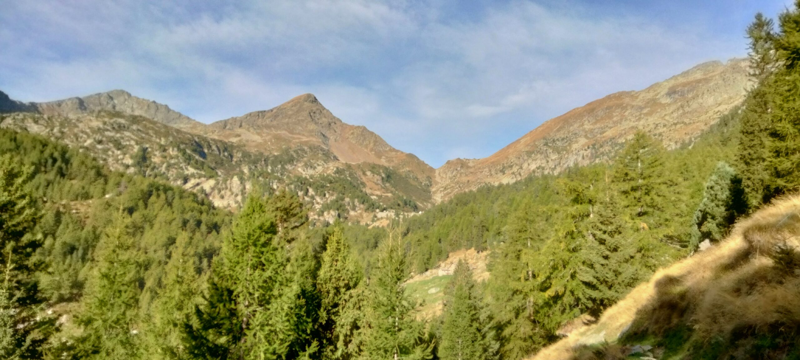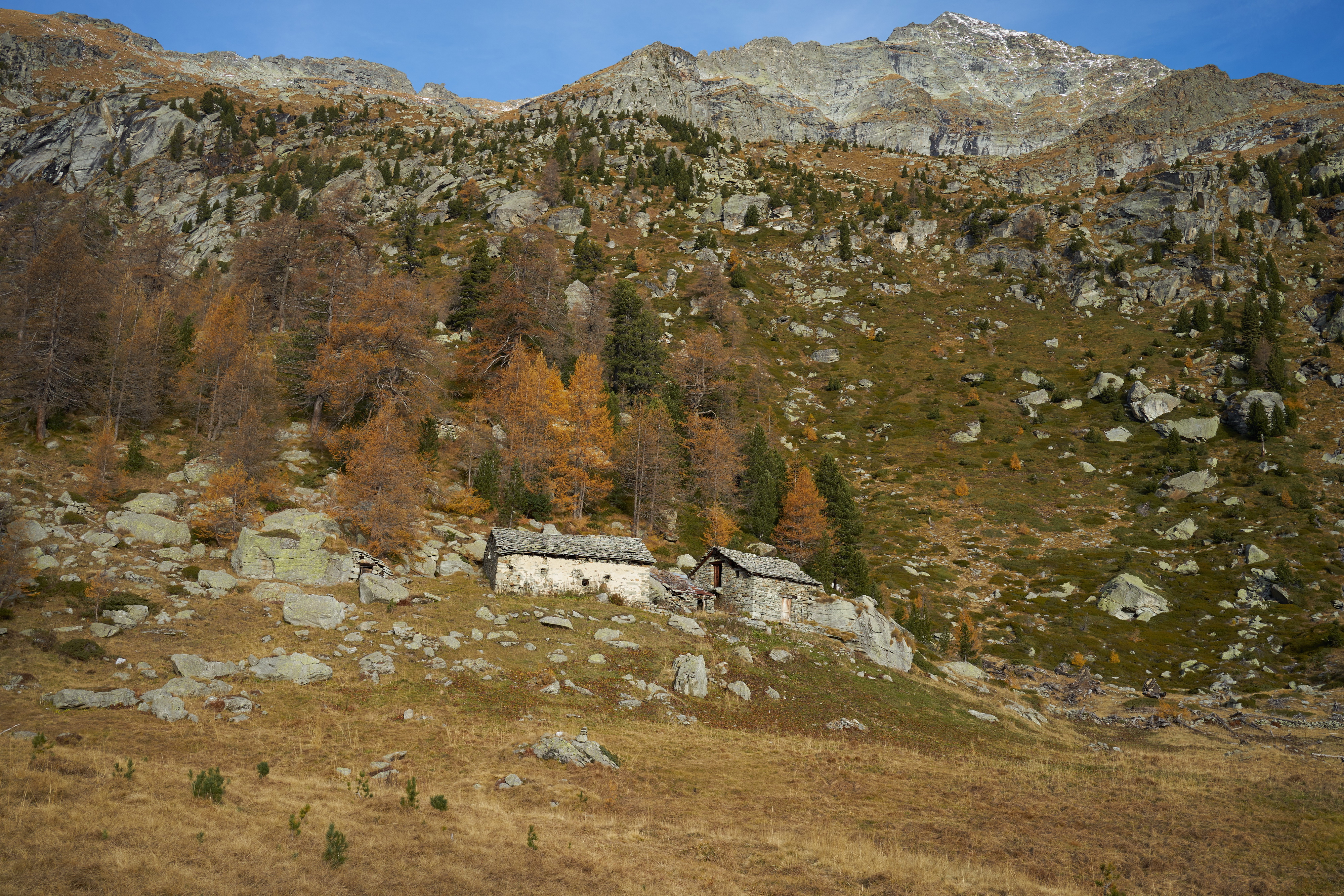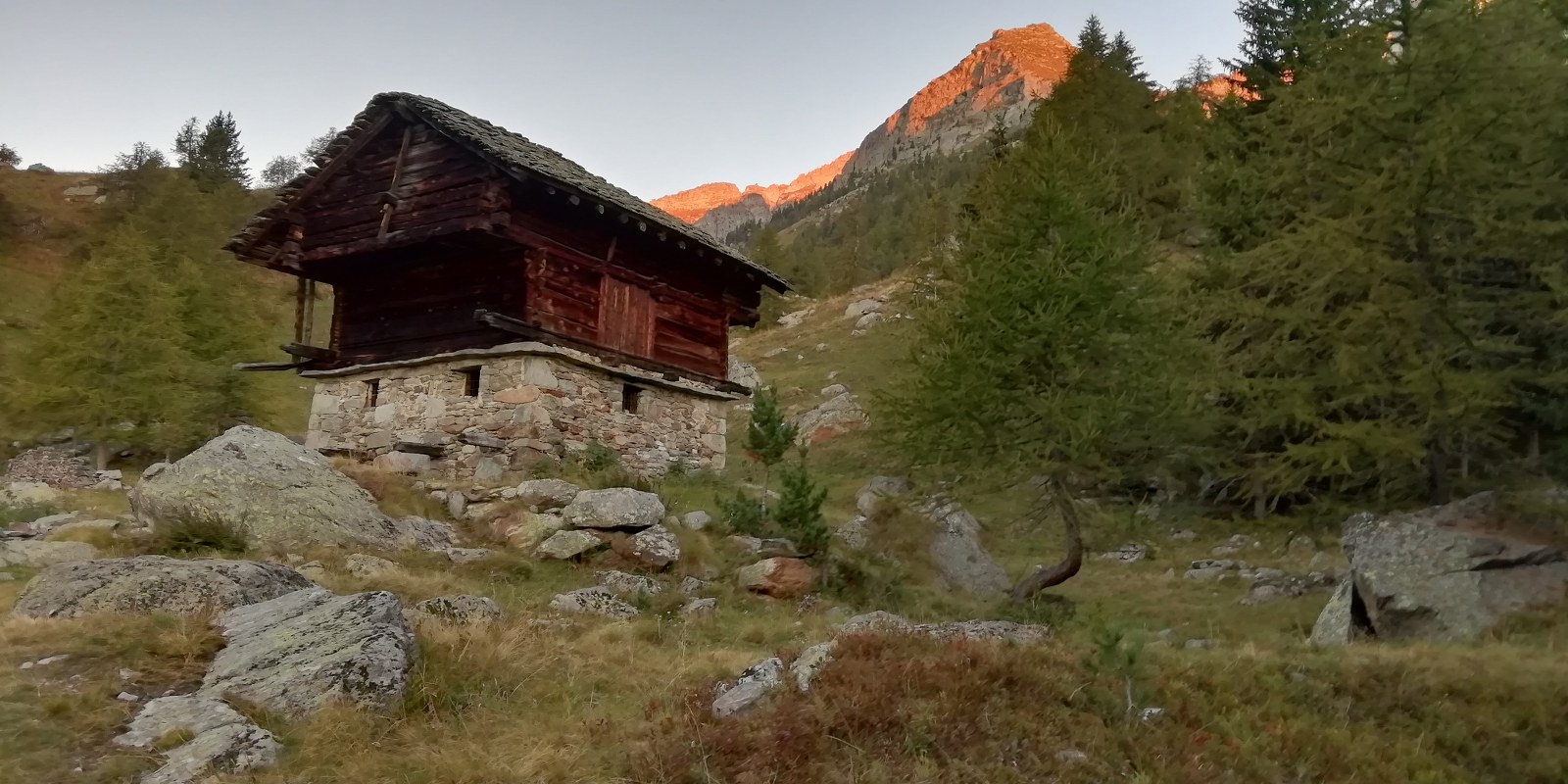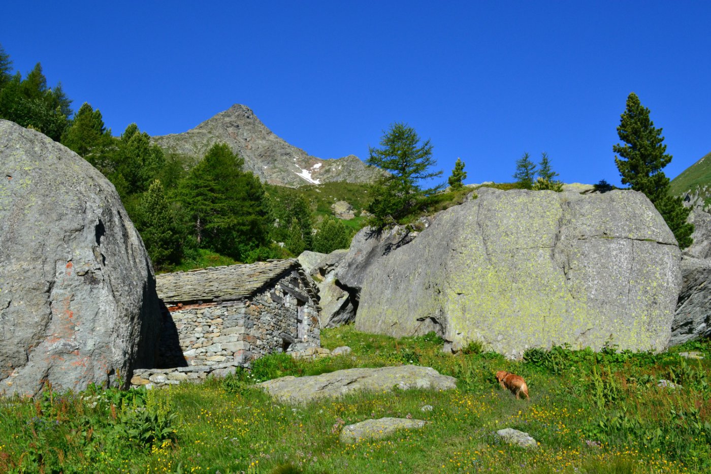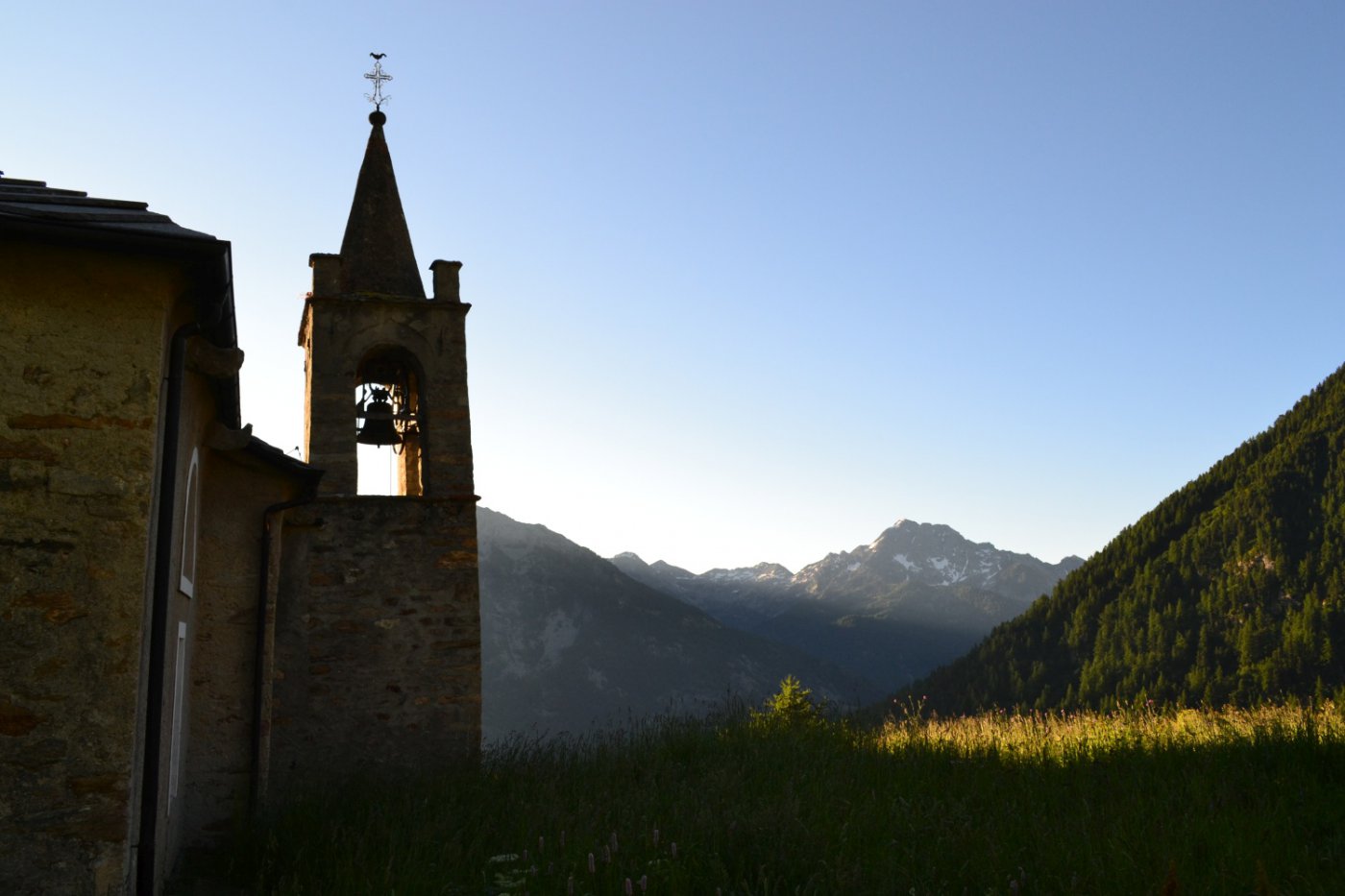 Qui si apre un vallone stupendo, si prosegue verso sinistra seguendo il sentiero 1C-GSW superando delle baite meravigliose, finchè si entra nel bosco sempre su ottima mulattiera. Il percorso ora è molto dolce, e per circa 40′ non si compie molto dislivello. A Mettiu 1894 m si incontra un ponticello che permette di passare sulla sponda opposta del ruscello, e quindi tramite altro ponte poco oltre si riprende a salire un dosso fino al bel pianoro pascolivo di Munes 2021 m con la cappella Madonna delle Nevi.