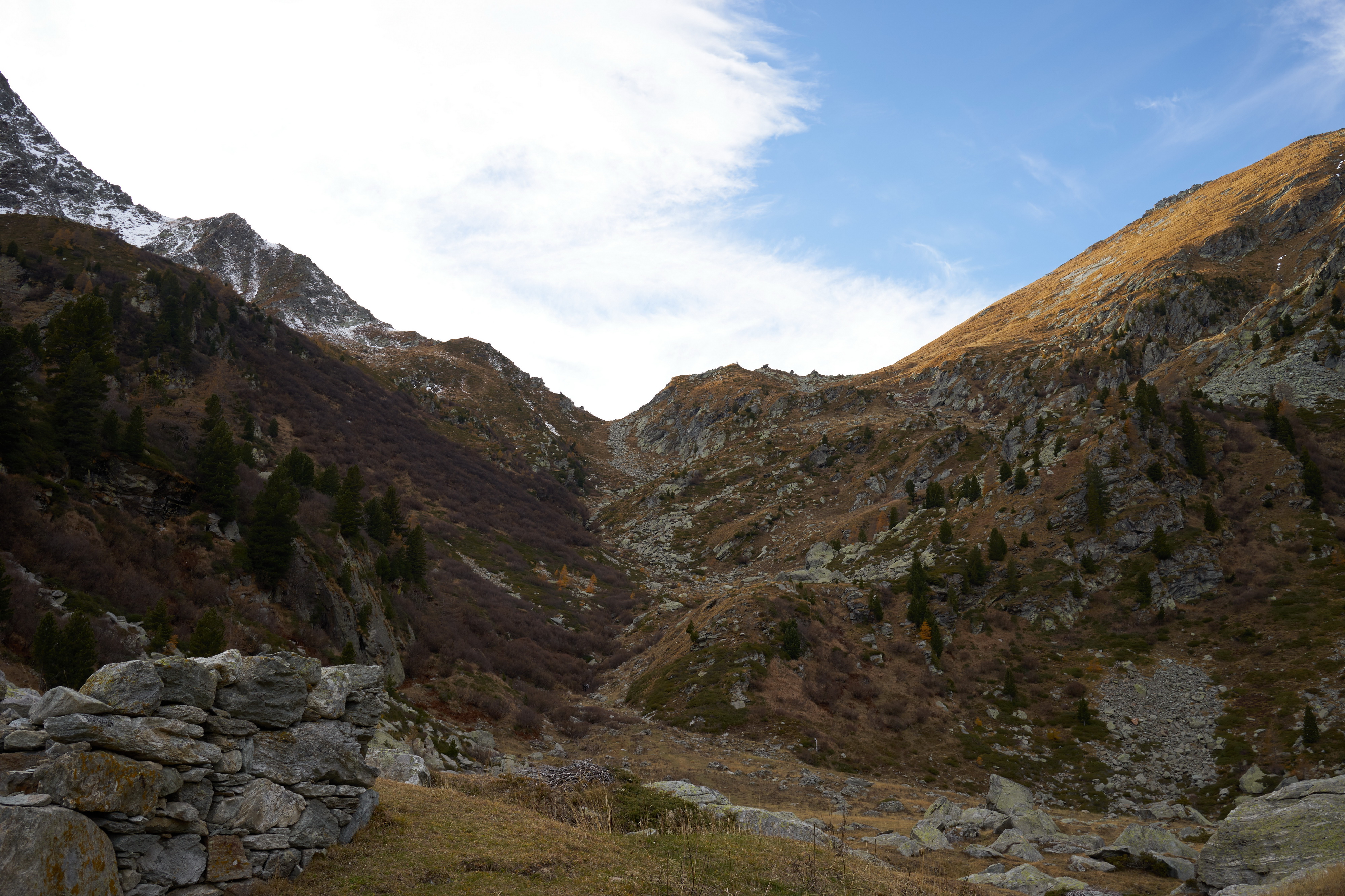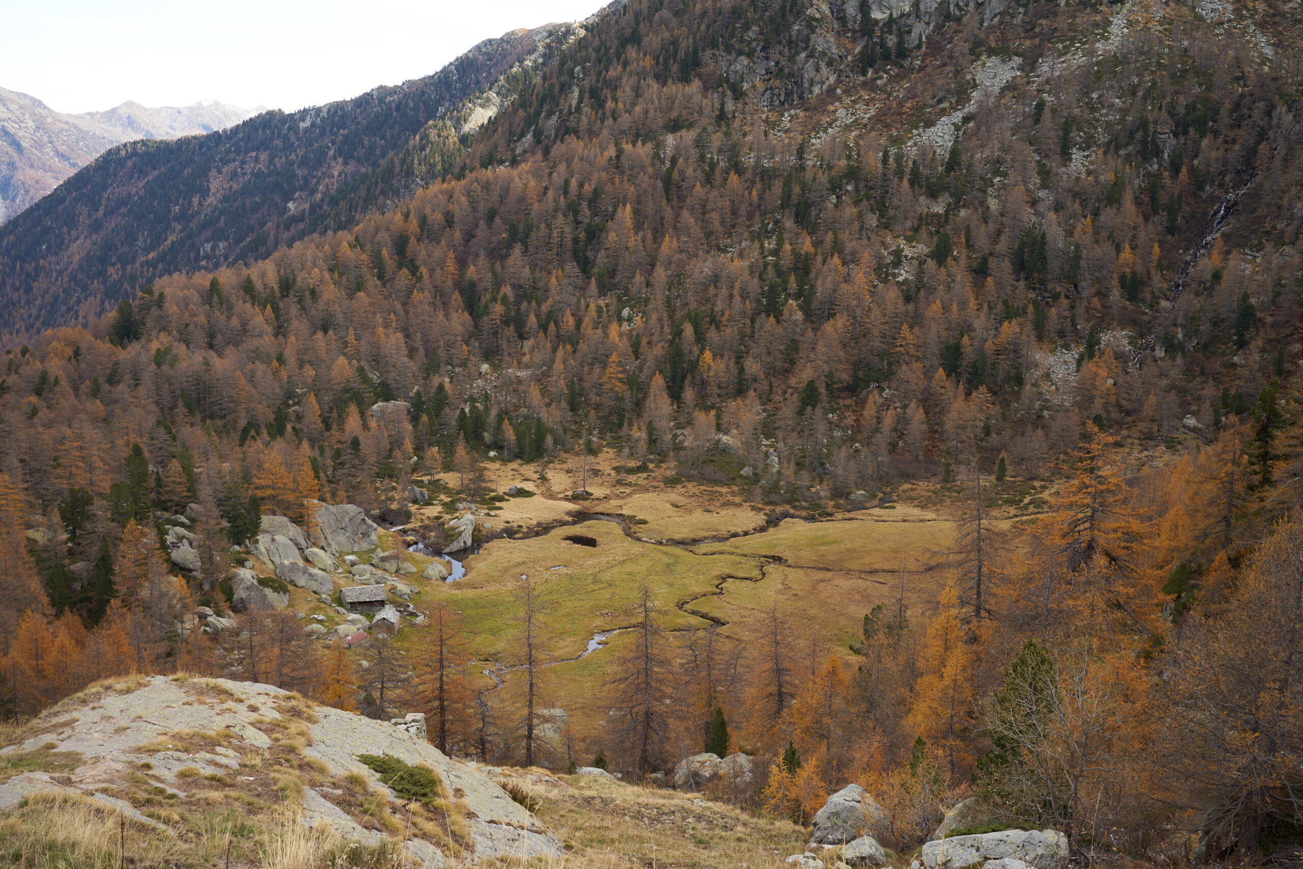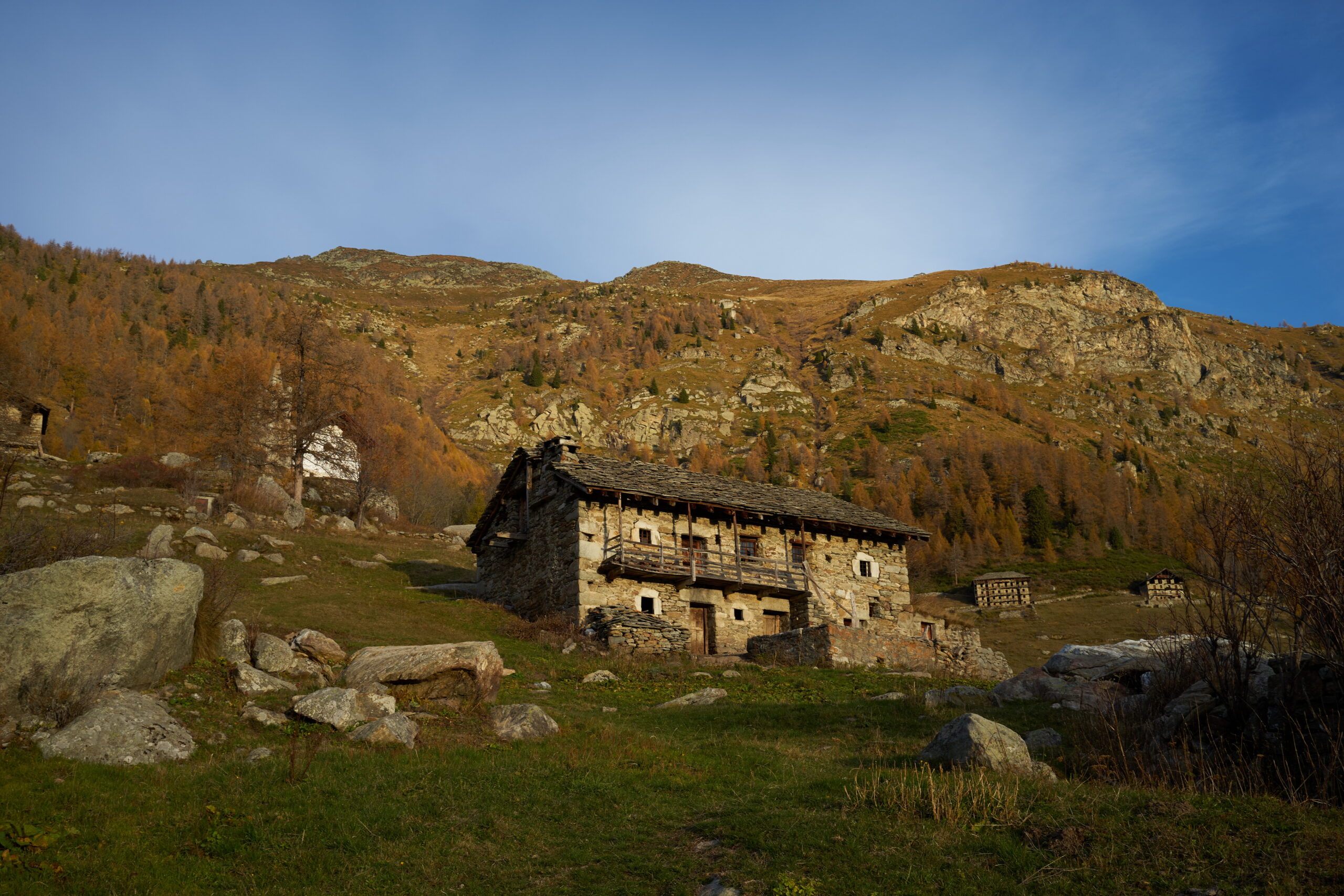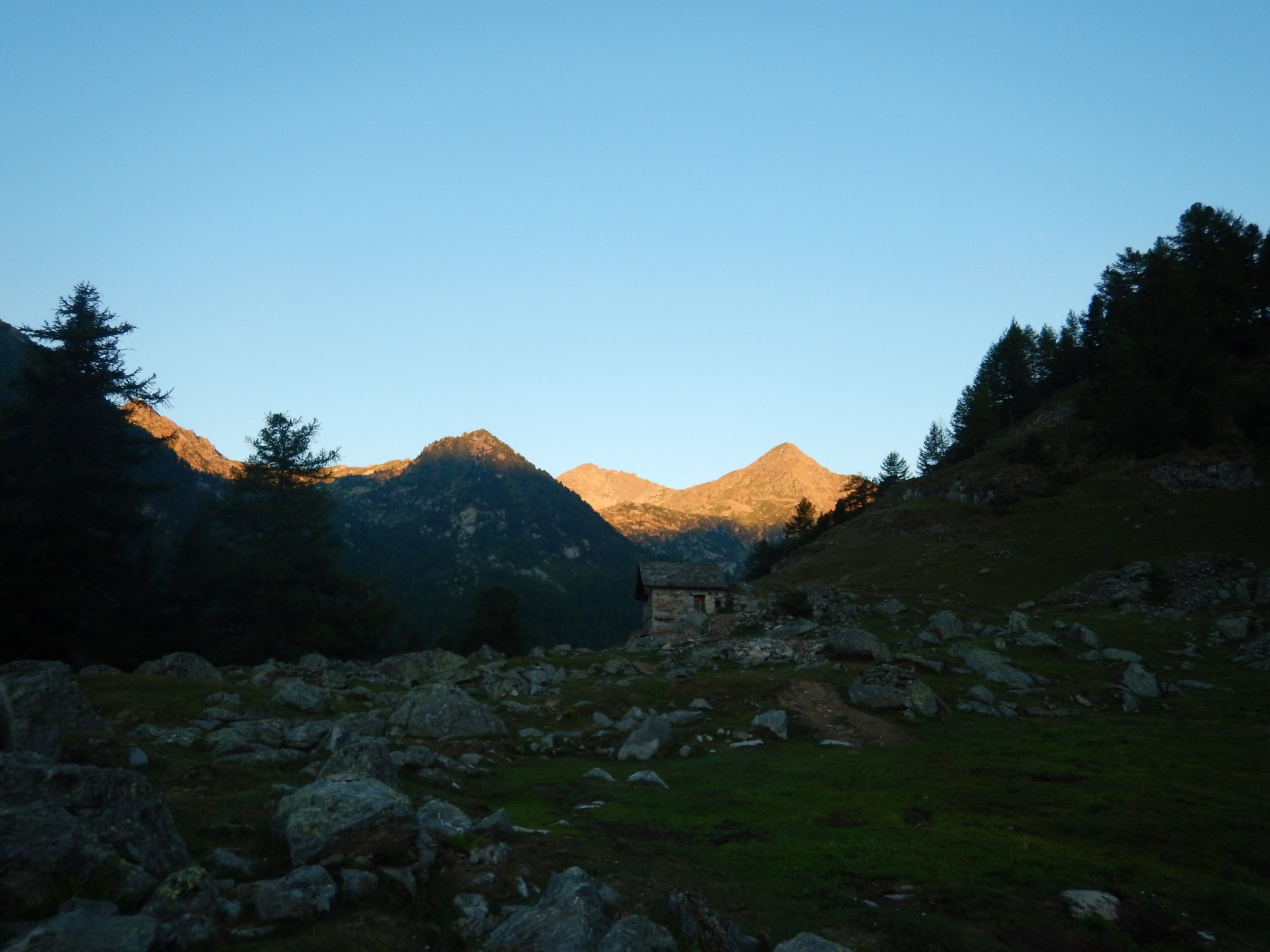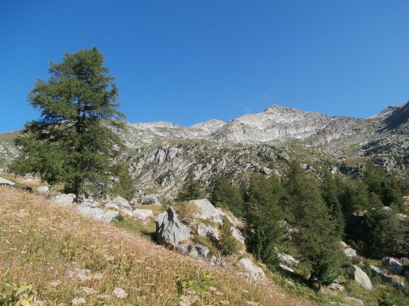 Qui si apre un vallone stupendo, si prosegue verso sinistra seguendo il sentiero 1C-GSW superando delle baite meravigliose, finchè si entra nel bosco sempre su ottima mulattiera. Il percorso ora è molto dolce, e per circa 40′ non si compie molto dislivello. A Mettiu 1894 m si incontra un ponticello che permette di passare sulla sponda opposta del ruscello, e quindi tramite altro ponte poco oltre si riprende a salire un dosso fino al bel pianoro pascolivo di Munes 2021 m con la cappella Madonna delle Nevi.