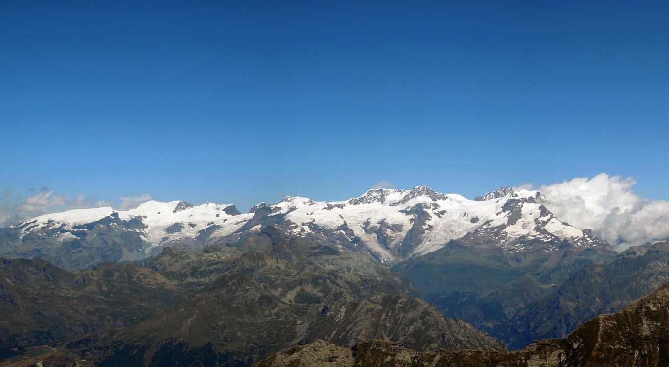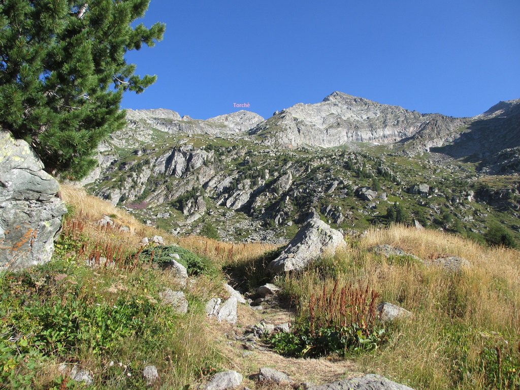 A (lunga) – Si prosegue seguendo il sentiero che risale il vallone fino al suo termine, e che culmina con il Colle Dondeuil 2342 m. Poco prima del colle si stacca a destra una traccia segnalata, che con andamento a mezza costa sotto il filo di cresta, in direzione nord porta verso la Becca Torchè, incrociando a circa 2700 m il sentiero 1C della seconda variante.