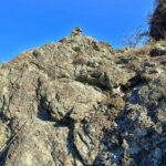La via degli 8 Stambecchi punta invece diritta ad un’evidente dietro liscio e verticale con sulla parete 2 grossi bolli gialli (licheni). Raggiungere il diedro, poi arrampicarsi alla sua sinistra (parete abbastanza verticale) in leggera diagonale per circa 5 m lungo un gradino di roccia/erba stando ben in equilibrio fino a dove la balza di roccia successiva si abbassa (prese svase in mano) e si riesce a salirci con passo deciso (IV). La si percorre ora verso destra per 5 m fino a passare al risalto successivo più basso e facile da salirci (III+) raggiungendo in breve l’ampia cengia su cui approntare una sosta su un grosso masso (20m circa) – in questo tratto ho potuto posizionare 1 solo friend essendo tutto svaso e senza fessure.