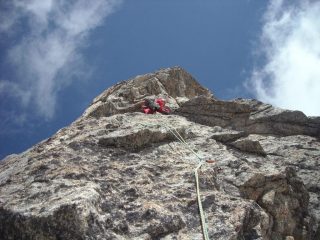 Scendere ad un netto intaglio, salire a sinistra una breve fessura sovrastata da una piccola nicchia con un masso incastrato (cuneo di legno), oltrepassare la nicchia, salire una breve placca a lame e sostare su comoda cengia. - Lunghezza 10 e 11, II, I, 80 m: