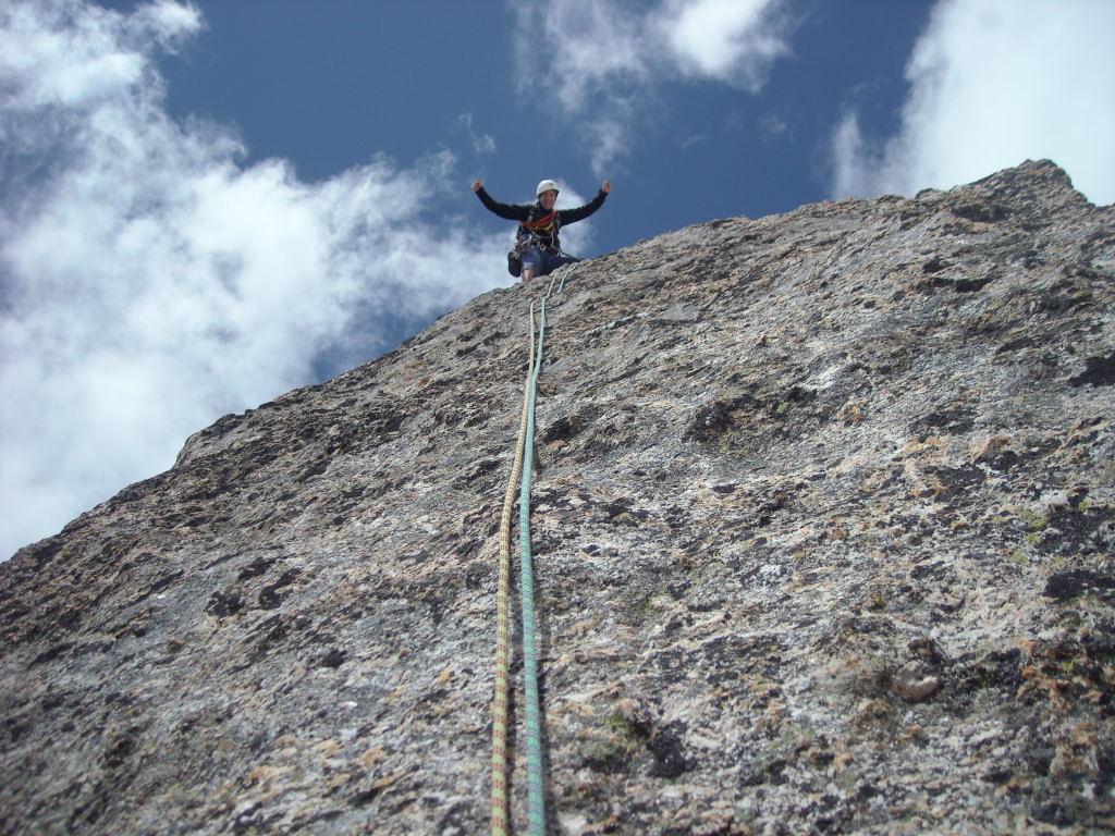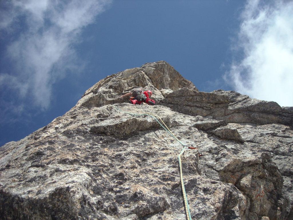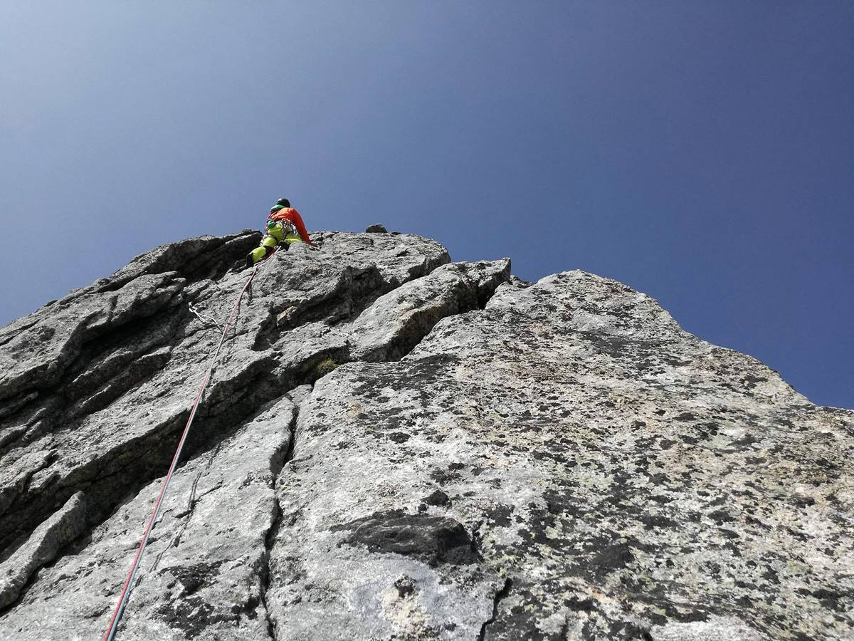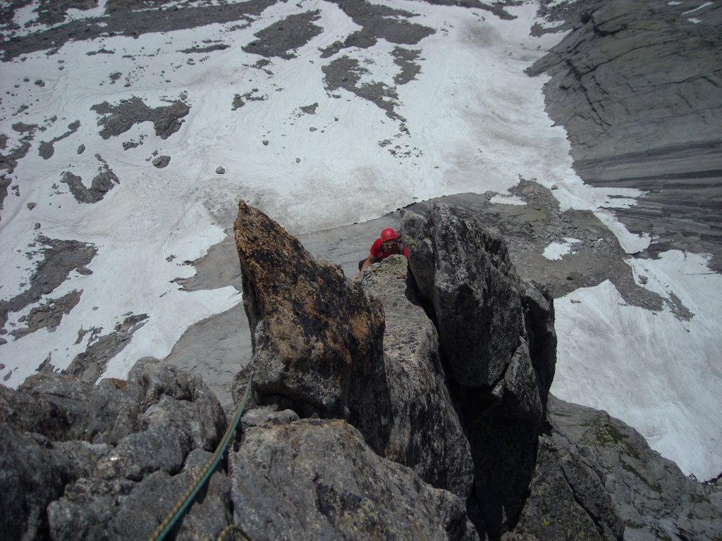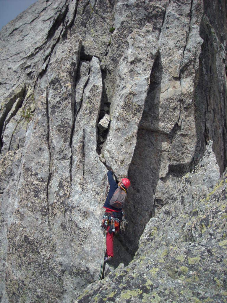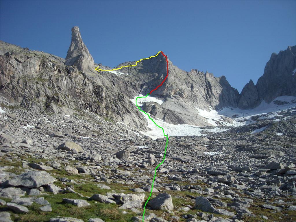 Salire sul filo dello spigolo per qualche metro, uscire a sinistra su comoda cengia, percorrerla fino alla base di un diedro, scalarlo riguadagnando il filo dello spigolo, proseguire aggirando sulla destra un grosso masso (attenzione a qualche zolla erbosa) e sostare alla base di un ripido salto verticale di roccia gialla e nera dove iniziano le difficoltà. - Lunghezza 4, V, V+, 25 m: