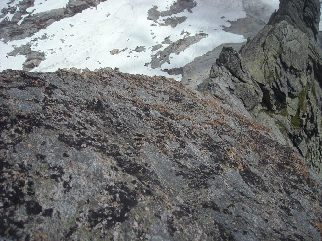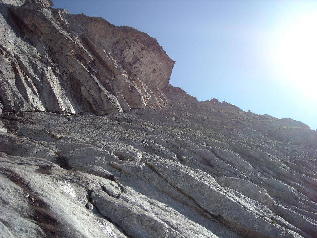 Salire un paio di metri, raggiungere l’ampia fessura che percorre la placca da sinistra a destra, seguirla fino a che si esaurisce sul filo dello spigolo, aggirare sulla sinistra un masso e sostare alla base di una ripida placca gialla. - Lunghezza 8, V, 10 m: