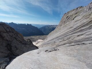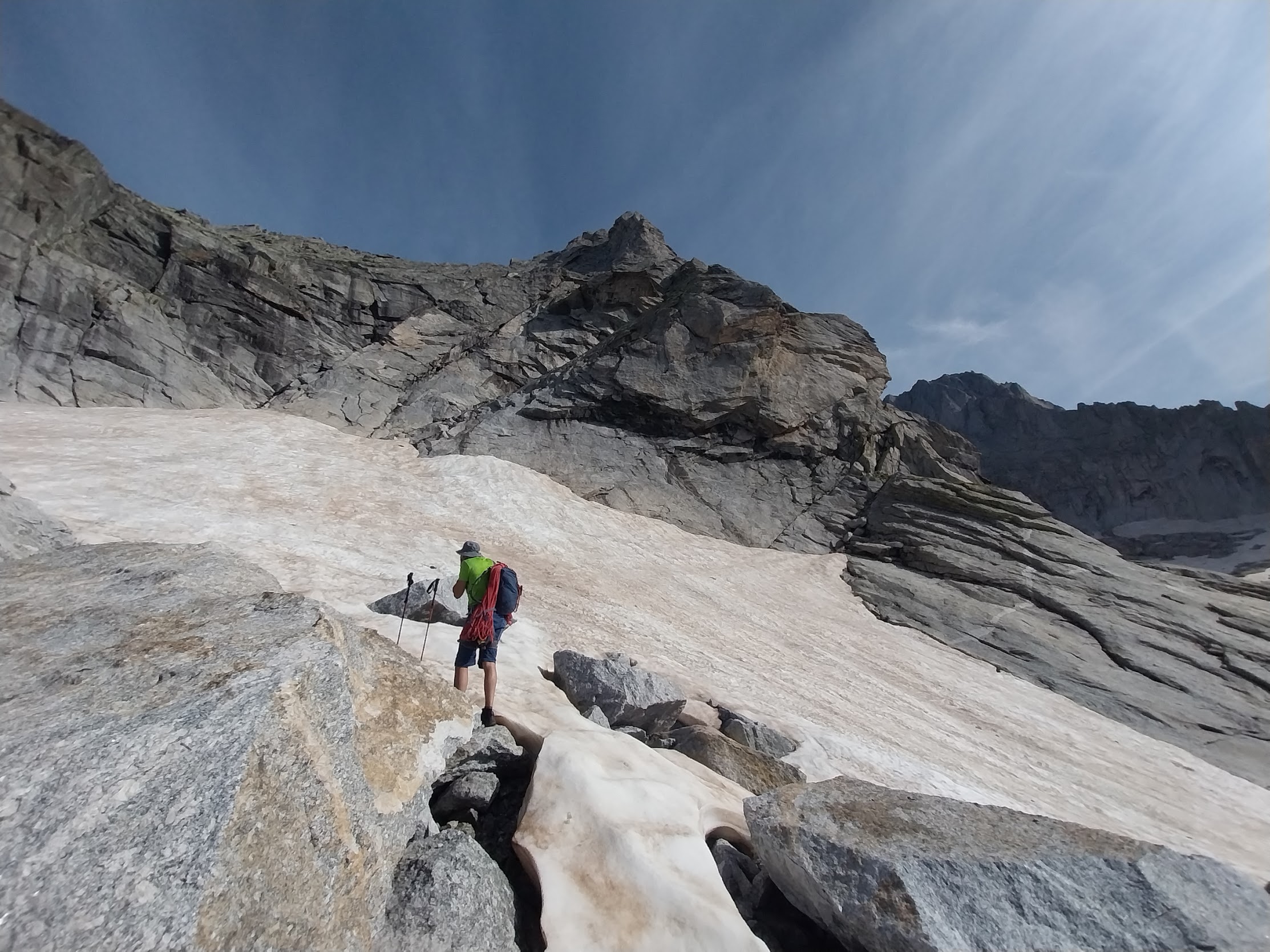 La discesa viene effettuata lungo la cresta Sud-Ovest, via normale di salita alla Punta Torelli.