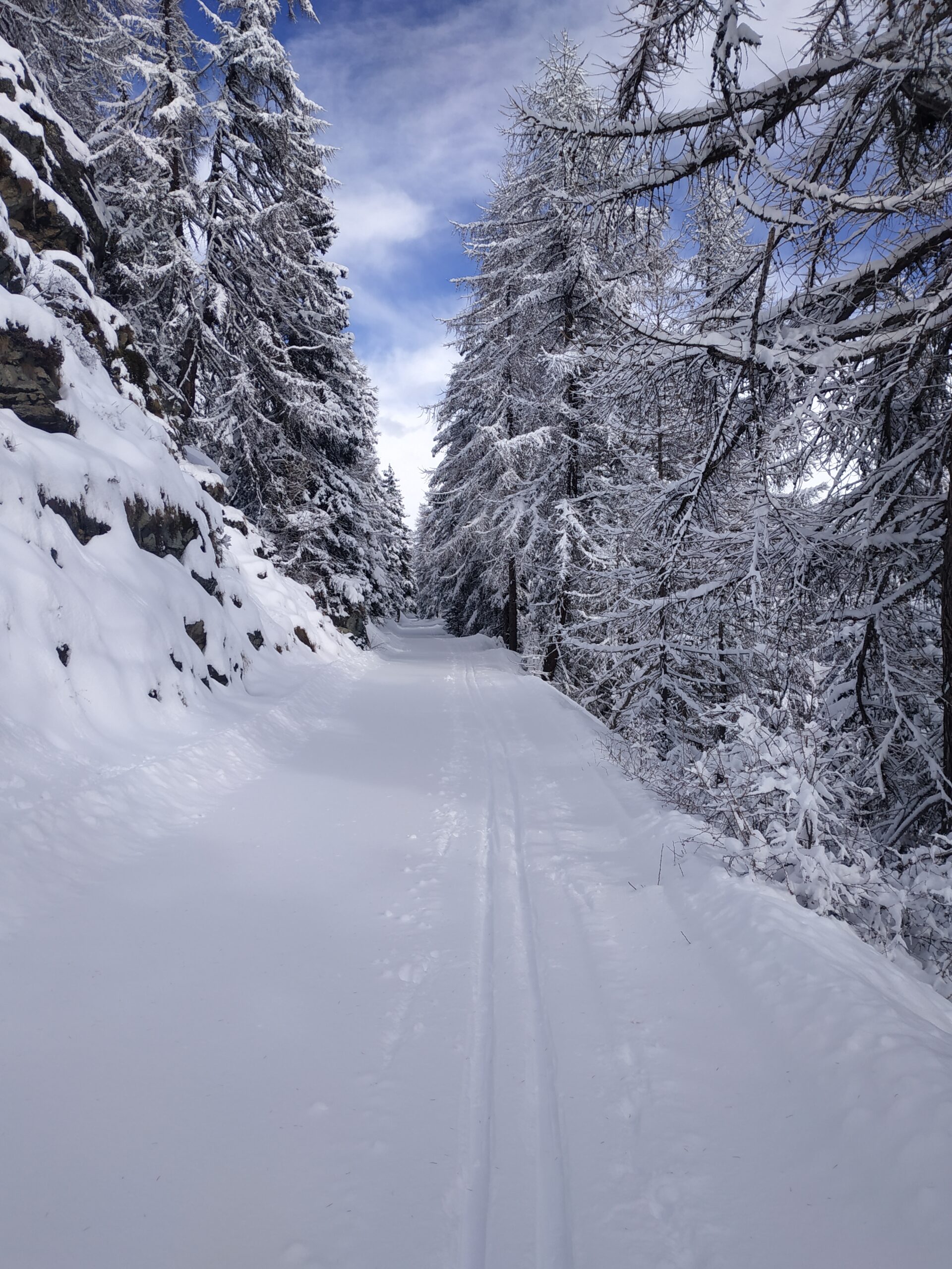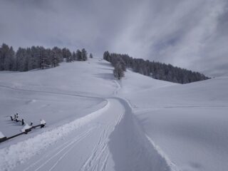 Maisonette: (km. 3 – 7,5 -10) itinerario divertente e tecnico, adatto agli amanti dello skating più esigenti e del classic, ma fattibile anche dagli sciatori “escursionisti”. Da Plan Proriond, Bar lo Vierdzà, salire brevemente nel bosco in direzione ovest e, al bivio, piegare a destra e scendere fino a fiancheggiare la pista di discesa. Piegare a destra in un sottopasso e proseguire ripassando vicino al parcheggio di Plan Proriond. La pista si inoltra nel bosco con lunghi tratti molto facili, poi offre una serie di tornanti tecnici per uscire ai ai 1774 metri del Col des Bornes, molto panoramico che rappresenta anche il giro di boa per l’anello dei 7.5 km. Si scende ancora fino alla radura tra i boschi di Champlong e di Paquier, reperendo il collegamento che scende a Verrayes (consigliato a chi ha gamba e fiato!). Se si rientra, si sale con costate pendenza nel bosco e si ritorna al Col Des Bornes (tracciato di 10 km); si prosegue a doppio senso e si va a sinistra a un bivio in leggera ascesa, seguendo la bella pista di rientro