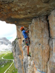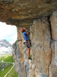 - L3: bella fessura leggermente diagonale a sinistra in cima alla quale si traversa con passaggio molto aereo ed estetico a sinistra seguendo con le mani la fessura orizzontale sotto il grande tetto alla fine del quale si risale di alcuni metri fino ad una comoda sosta ( IV + poi IV; alcuni vecchi chiodi, chiodo cementato alla sosta – 30 metri) (possibilità di dividere il tiro con una sosta sotto il tetto);