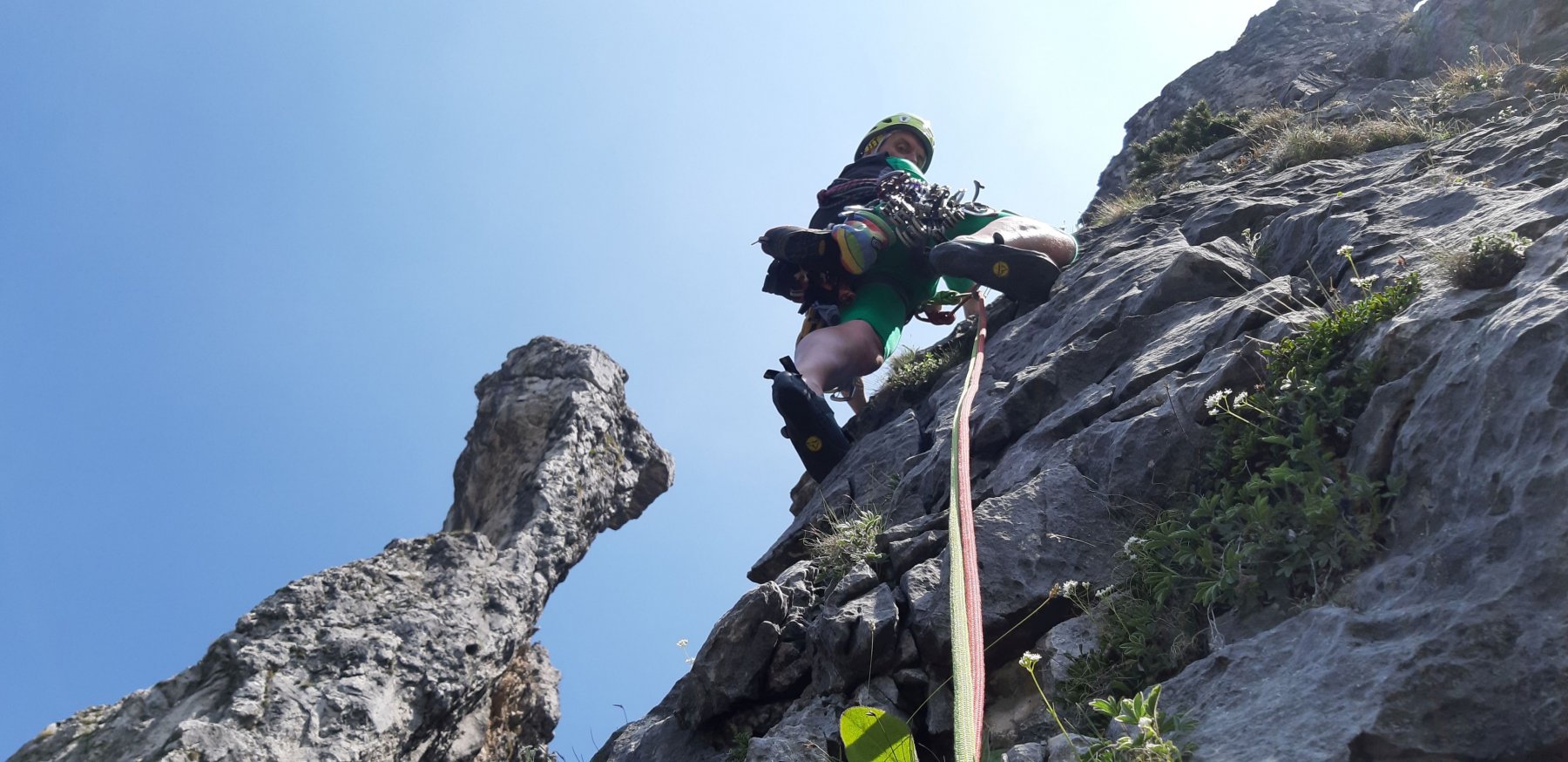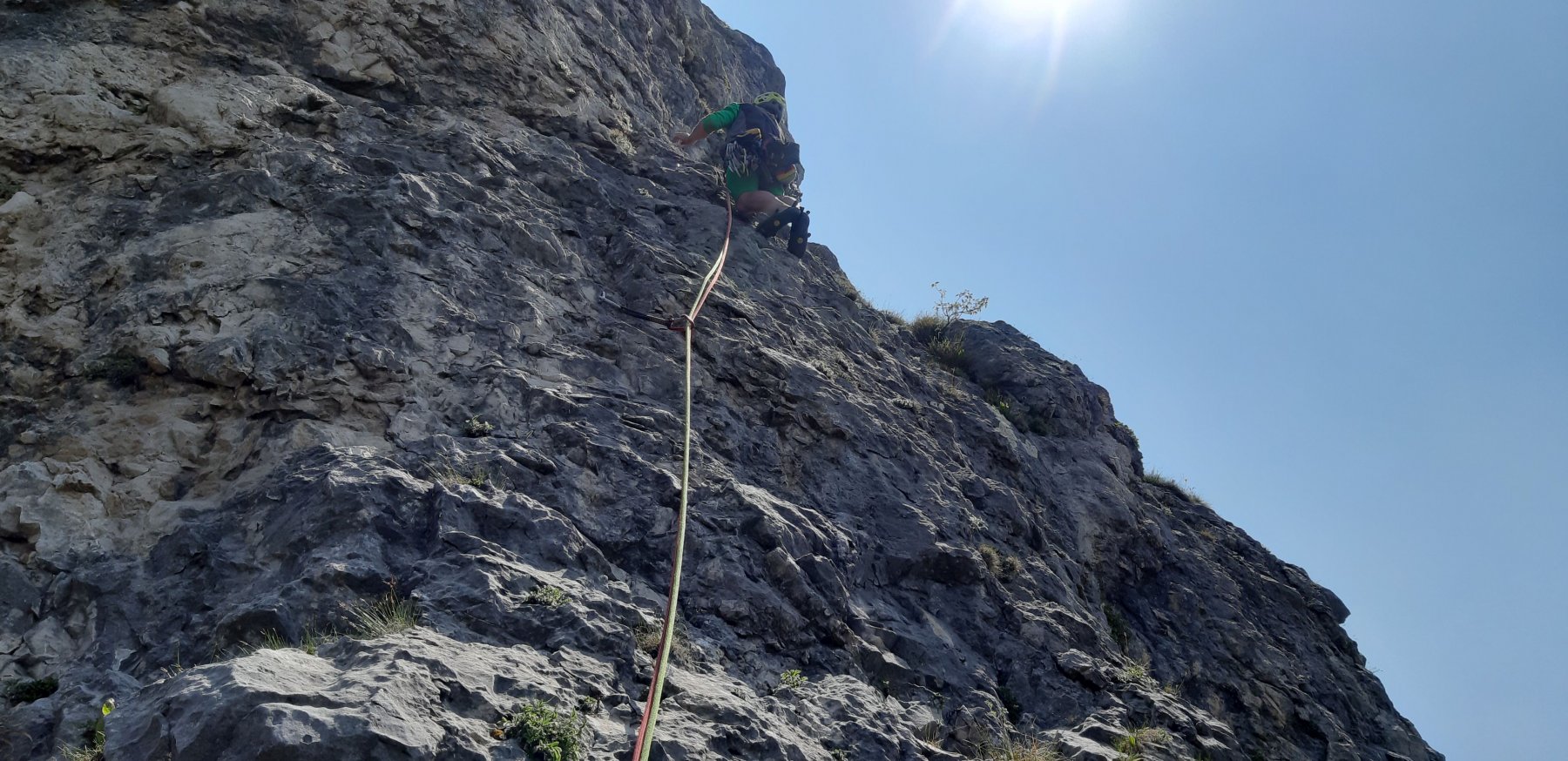 - 2° tiro : passo iniziale atletico, ora per rocce ben appigliate fino alla sosta. 20 Mt, IV+