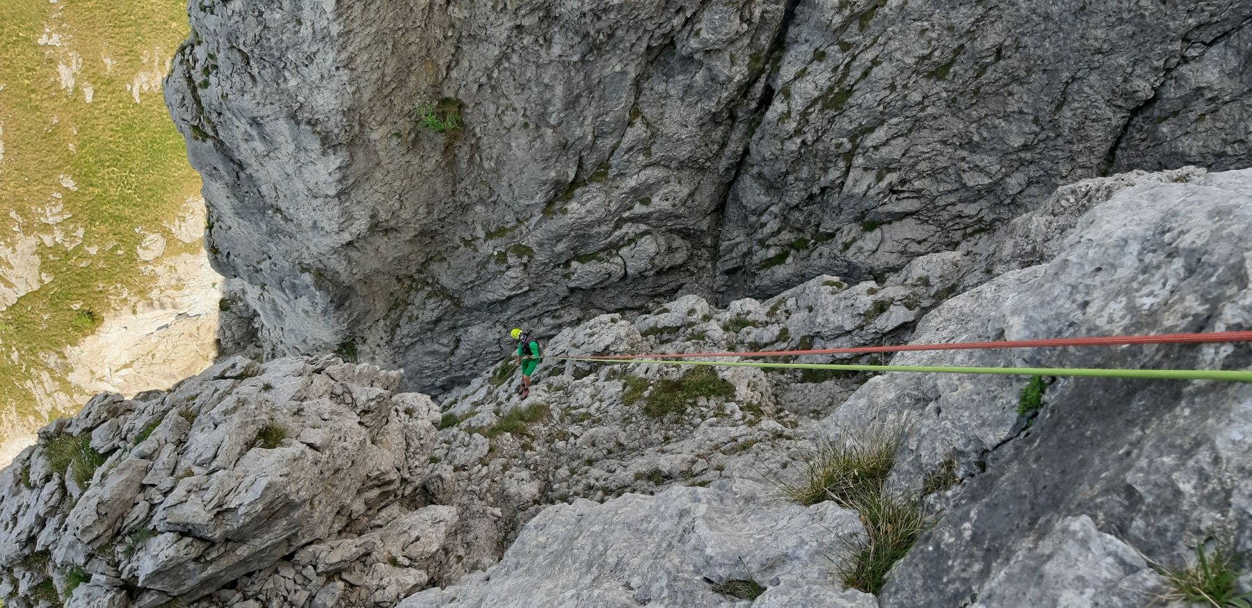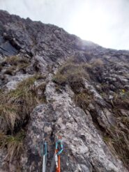 - 1° tiro : obliquare a destra prendere lo spigolo, seguirlo fino a raggiungere una cengia erbosa, traversare a destra fino alla fine della cengia e alzarsi facilmente raggiungendo il comodo pulpito dove si sosta. 30 Mt, V-