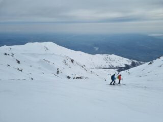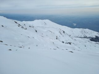 Discesa (ore 12). La neve si presenta ormai perfettamente assestata e portante su tutto il percorso, fuori dal bosco. Tant’è che, nonostante immagino che ci sia stato poco rigelo, visto la copertura nuvolosa e il clima mite, non si sprofondava affatto. Scesi con visibilità discreta (sole velato, ma il nero della pianura fa molto contrasto), su neve mollata il giusto, nonostante l’orario. Per l’ultimo tratto nel bosco, io, come al solito, ho prediletto un po’ di ravanaggio nel bosco (dove la neve non è portante), mentre I miei soci sono più comodamente scesi sulla stradina.