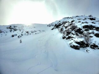 In cima freddo e nuvolo, optiamo per una discesa diretta verso il Monte Rasca dove troviamo inaspettatamente bella polvere ed esce una bella linea…