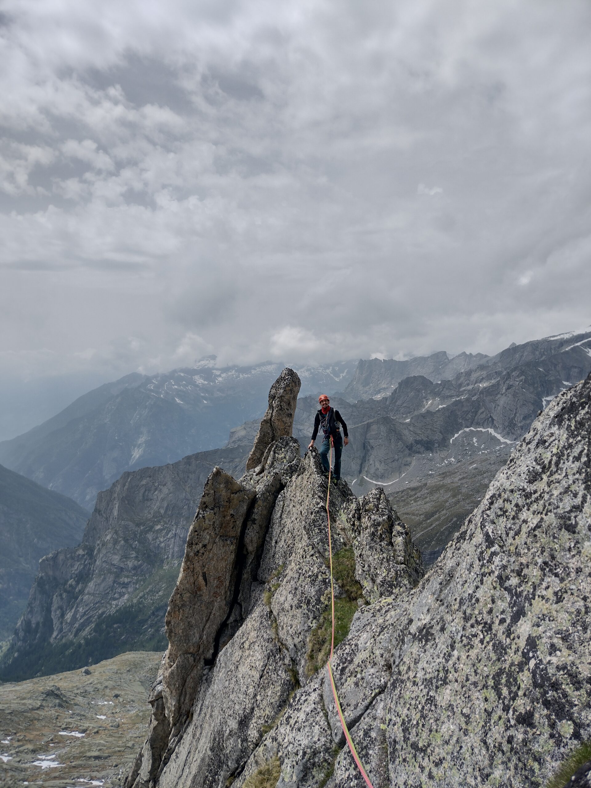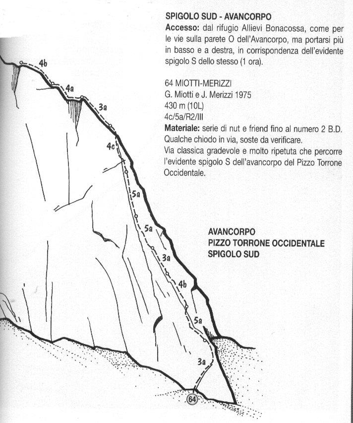 Accesso: dal rif. Allievi, seguire il sentiero Roma in direzione del rif. Ponti. Abbandonarlo prima che inizi a scendere e salire in direzione del vallone glaciale fra la Rasica e il torrone Occidentale. Dirigersi poi verso l’evidente spigolo (1h).