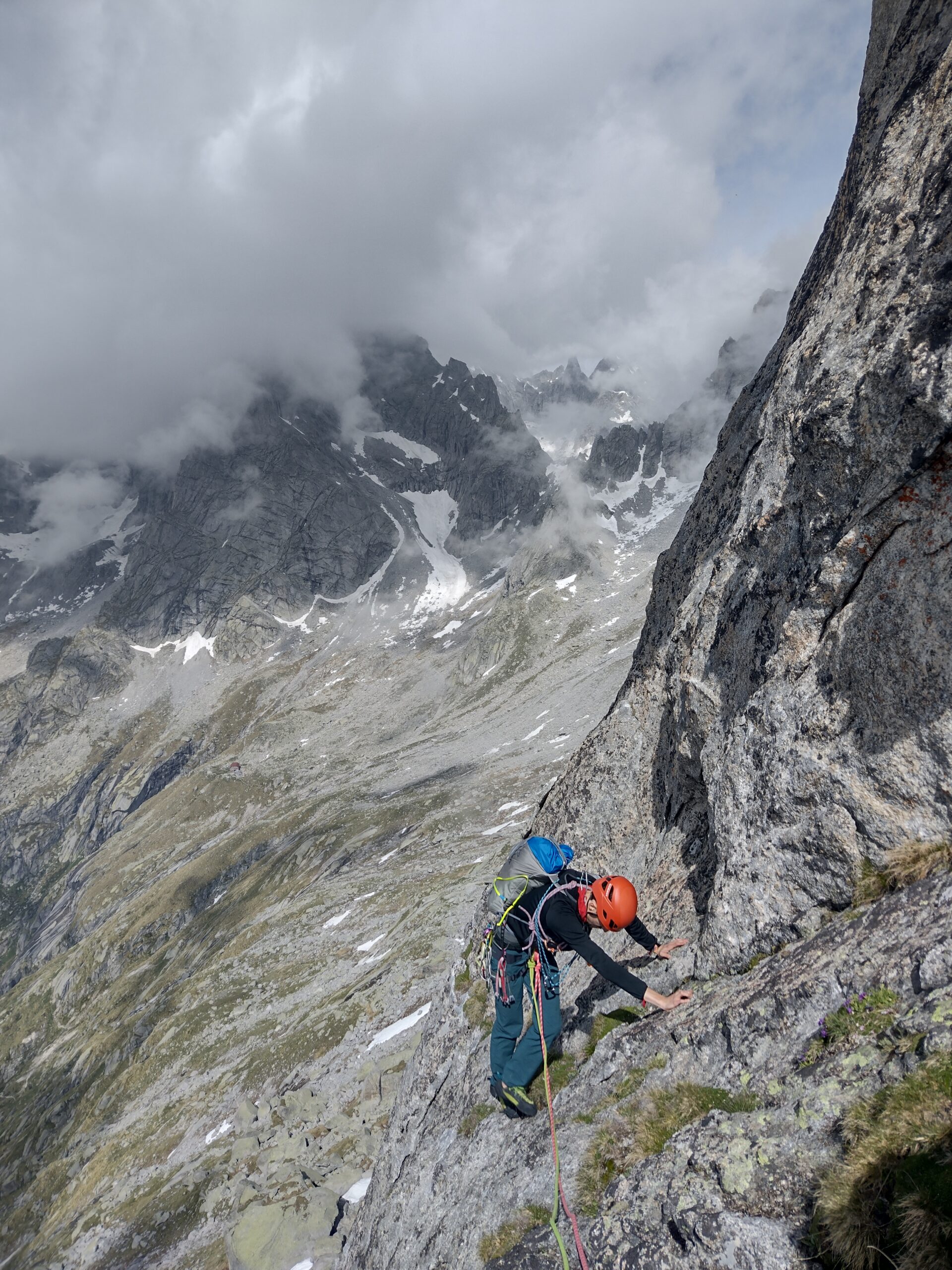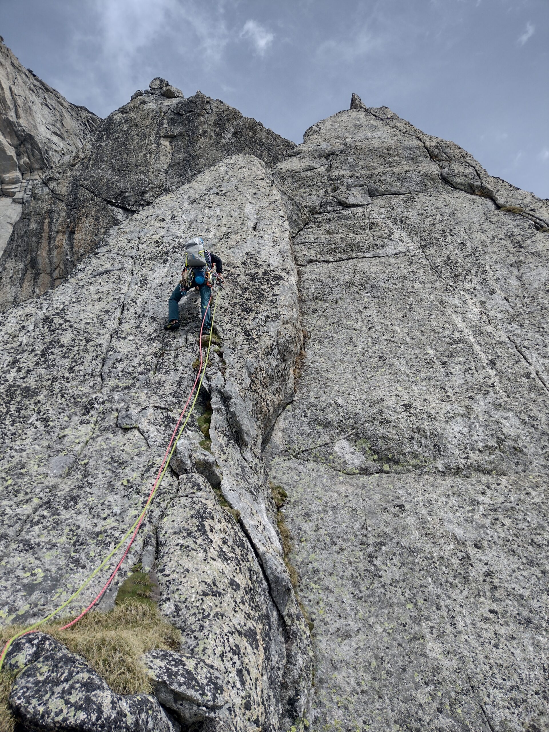 Attacco: a sinistra dello spigolo, per una evidente rampa ascendente verso destra.