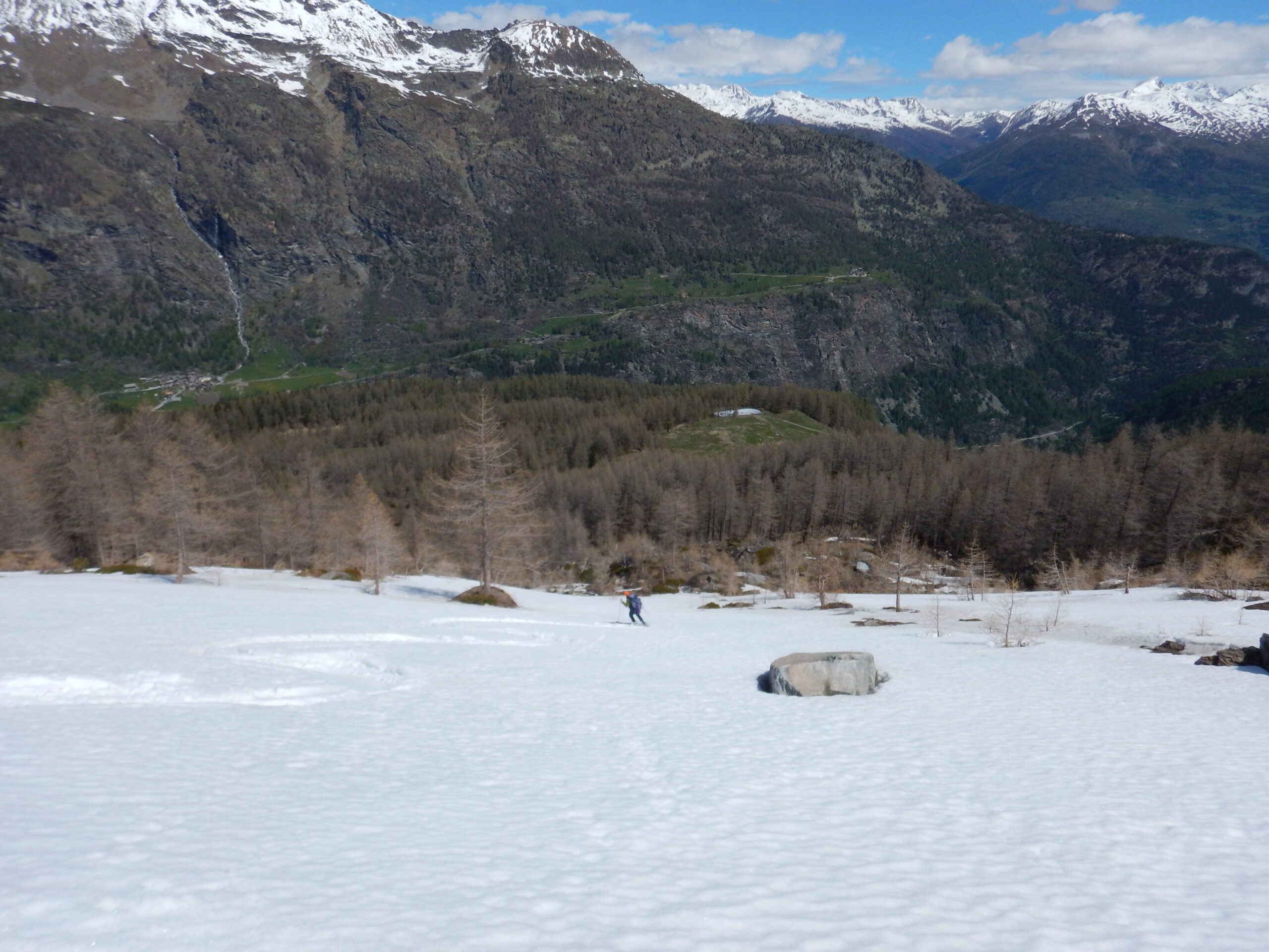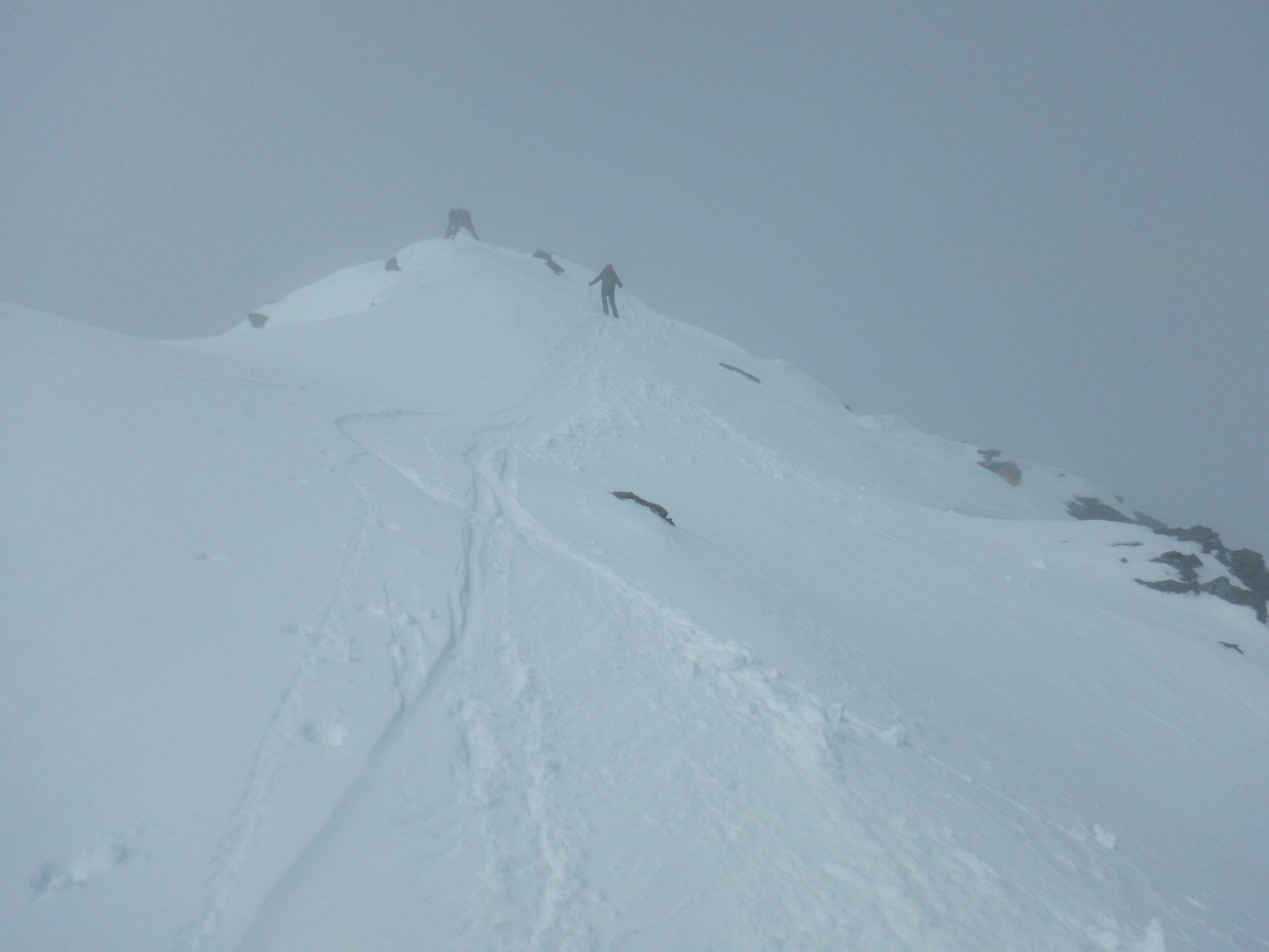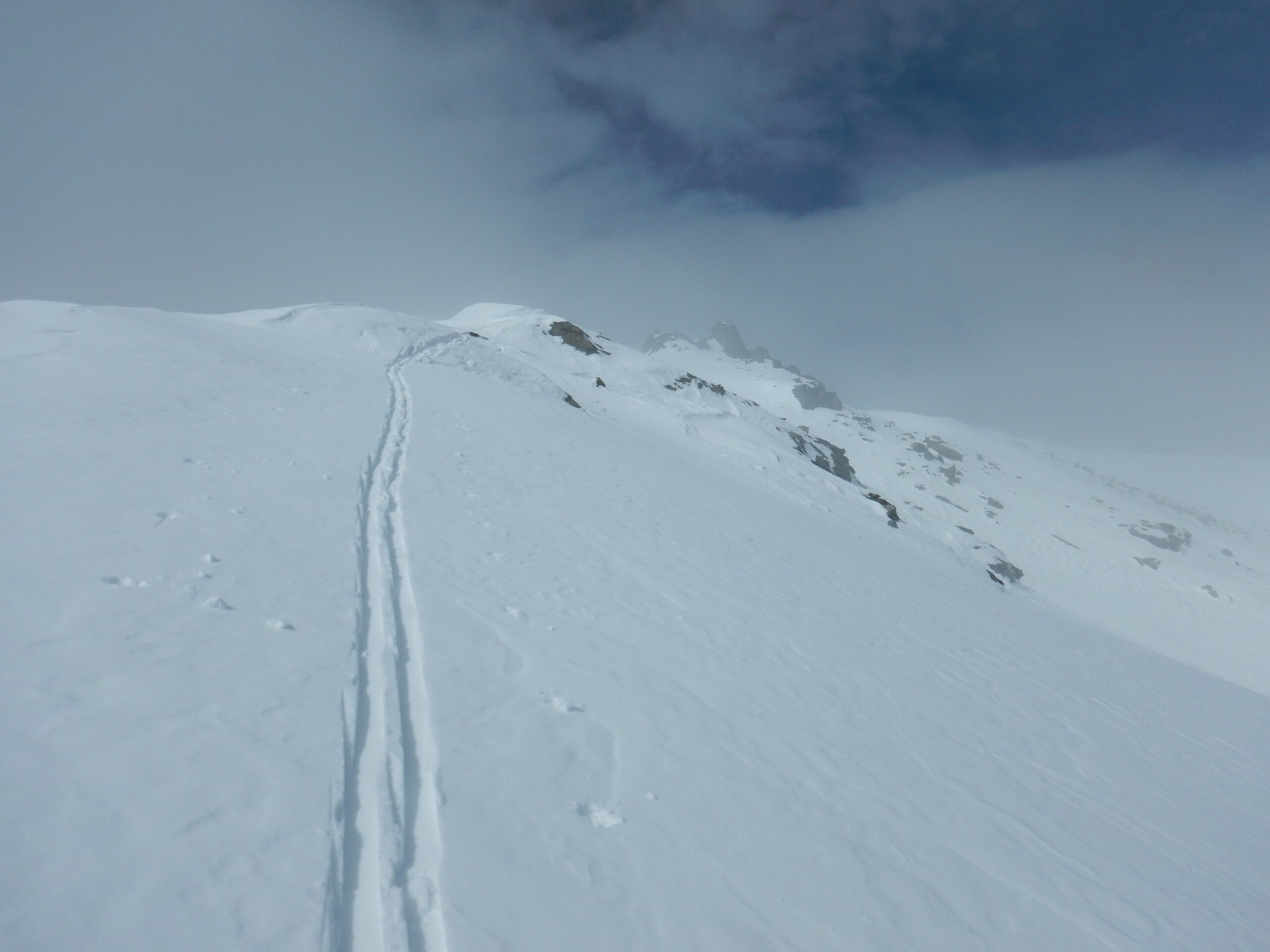 Si portano gli sci per il bel sentiero fino a sopra Boregne, verso 2000 metri, poi innevamento continuo. Rigelo assente fino in vetta, per sicurezza fatto il canale con i ramponi. In vetta nuvola che copriva il panorama. Discesa molto sopra le aspettative, con bella farinosa nella parte alta, morbida nel canale e ancora bella fino a Boregne.