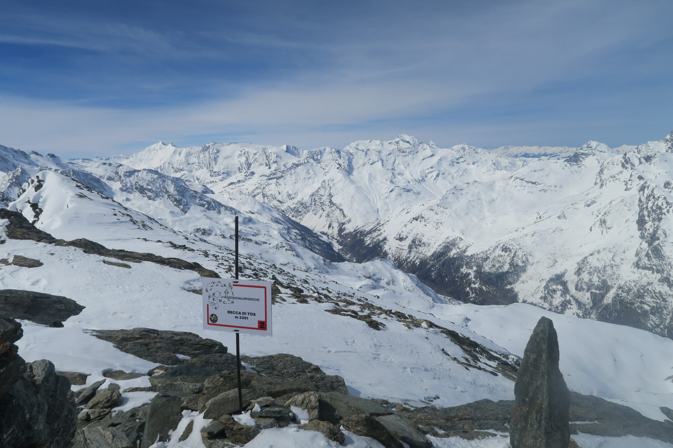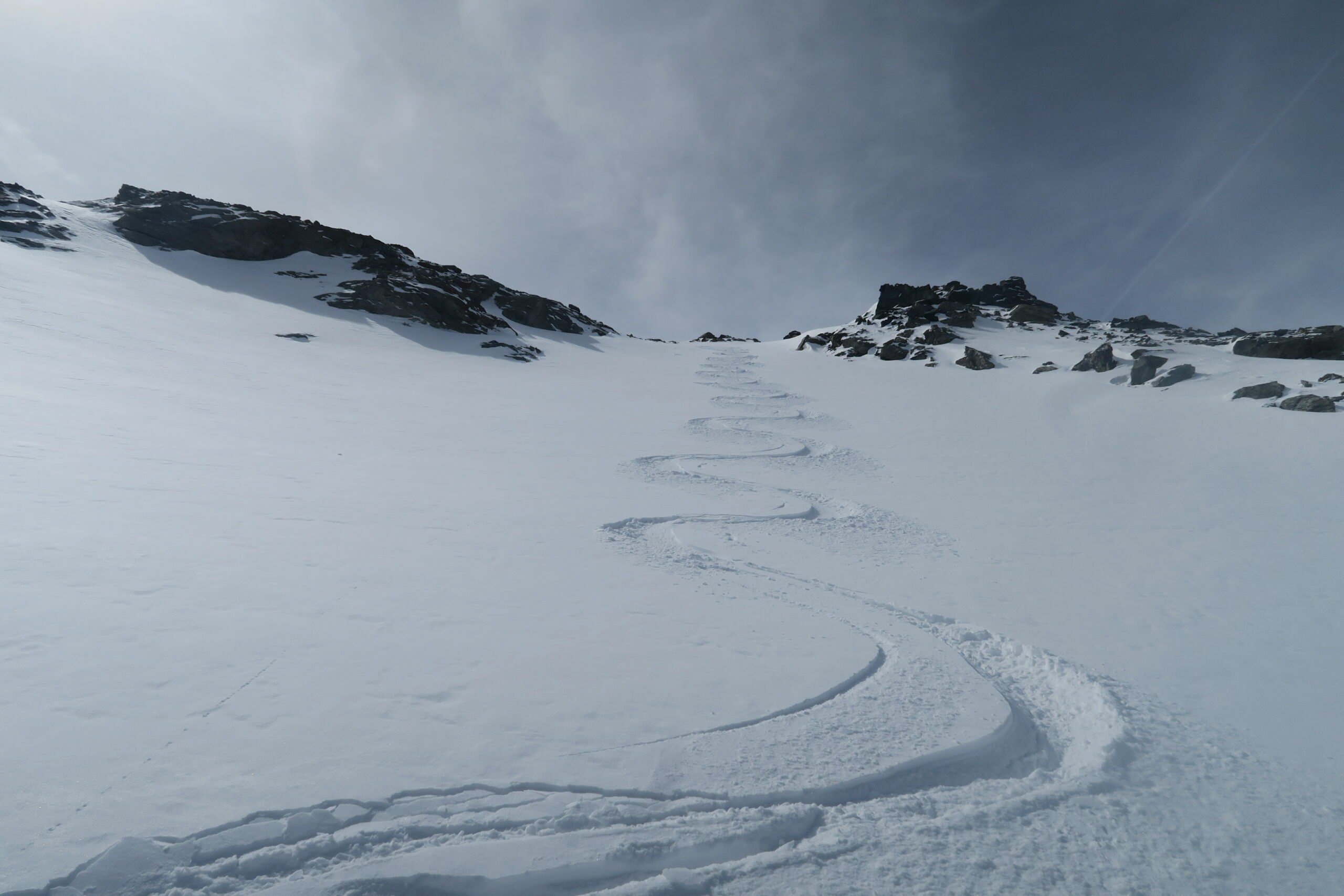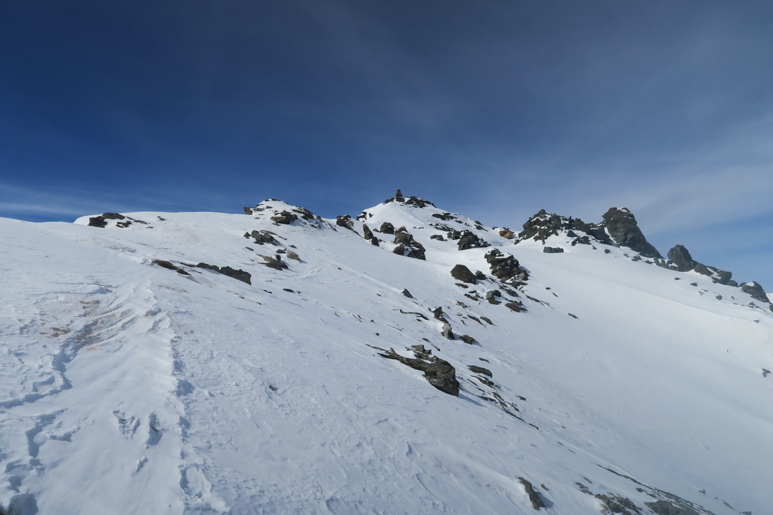 Dalla cima del canale sci ai piedi fino all’ometto della cima, ogni tanto spuntavano vecchie tracce precedenti all’ultima nevicata.