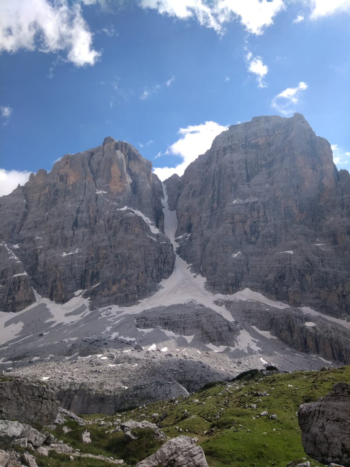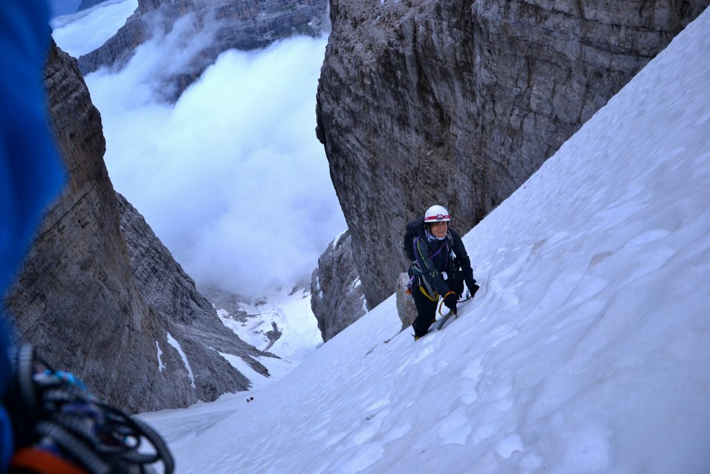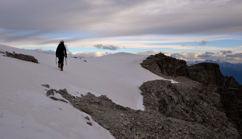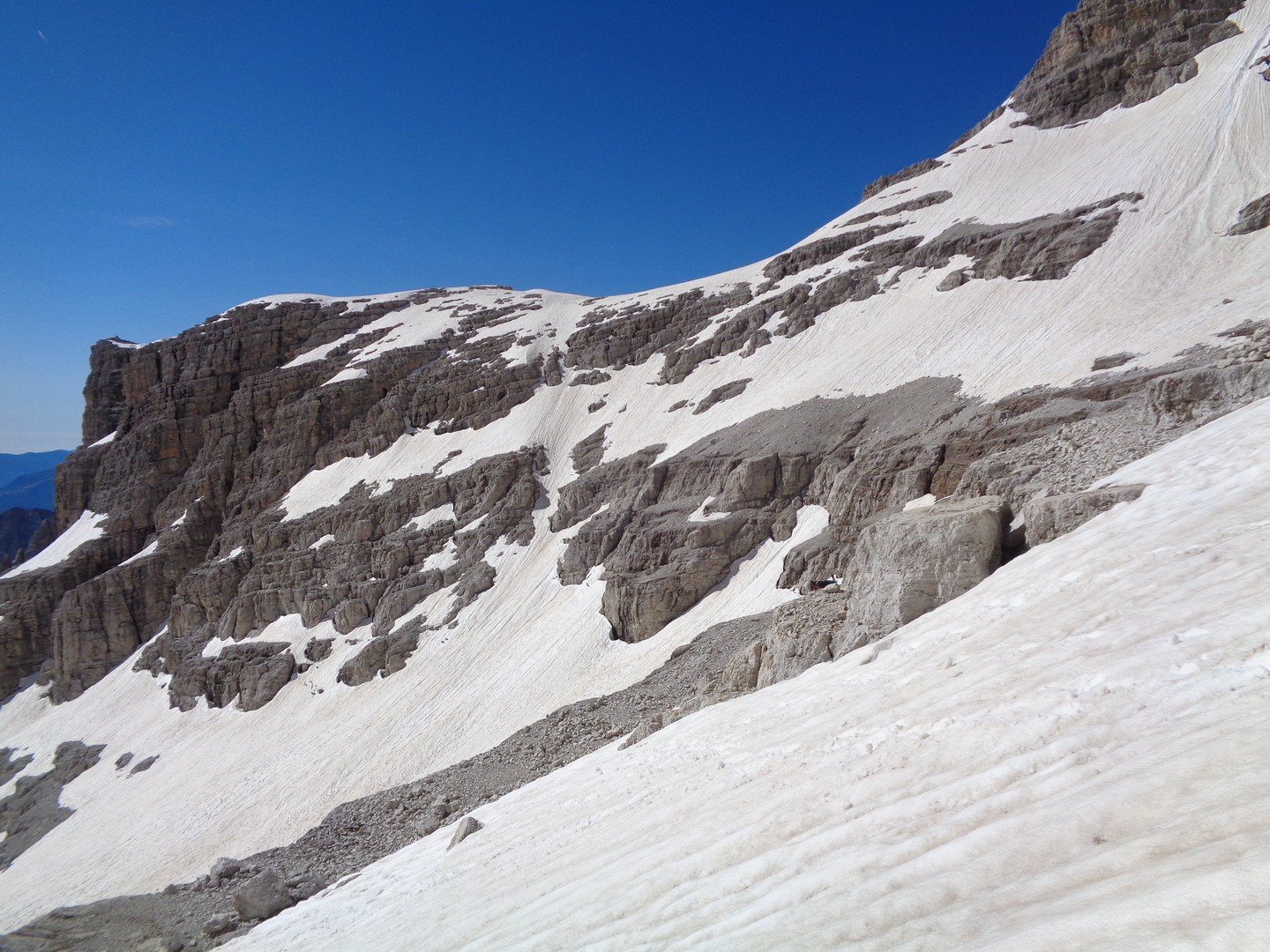 2° giorno: Dal rifugio si segue il sentiero con segnavia 392 che porta verso la Bocca di Brenta, si supera la cappelletta, fino a raggiungere un grosso blocco roccioso, dove occorre abbandonare il sentiero principale e prende verso dx per raggiungere (perdendo circa 100 m di dislivello) il fondo della Val Brenta, si sale poi sul versante opposto per una traccia di sentiero che sale tra detriti e blocchi rocciosi (o neve), supera un tratto più ripido e poi raggiunge l’ampia conca della conoide iniziale del Canalone della Tosa, coperta interamente dal piccolo ghiacciaio (la Vedretta del Crozzon).