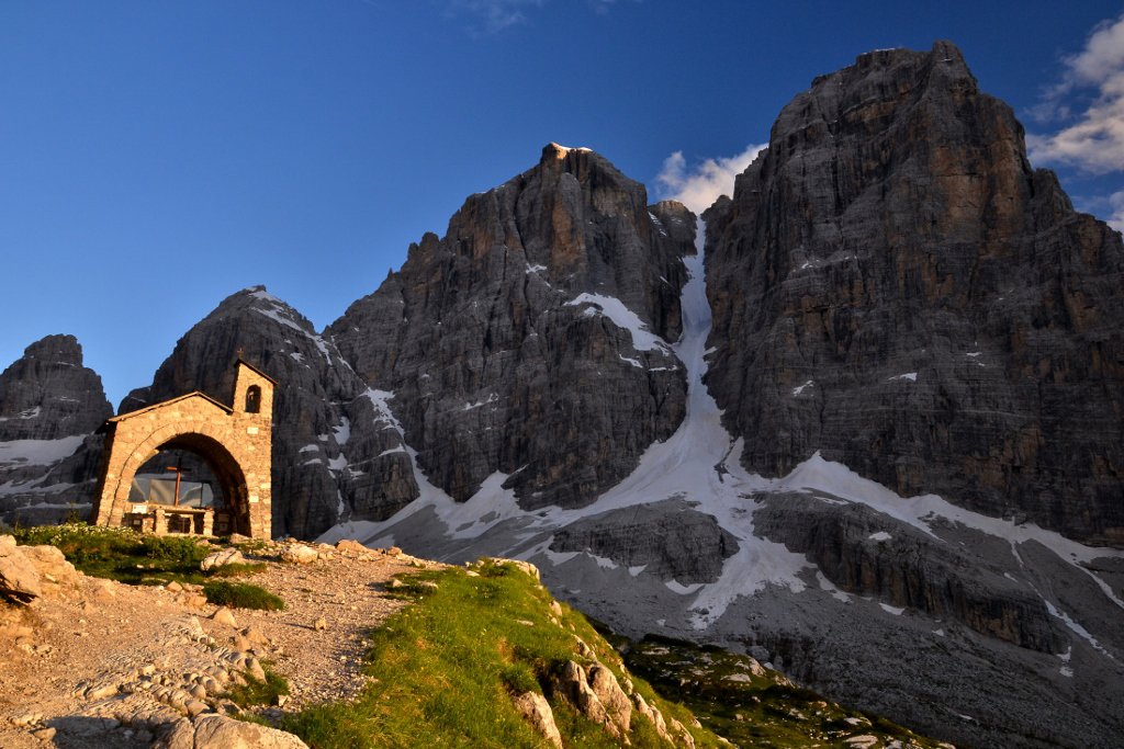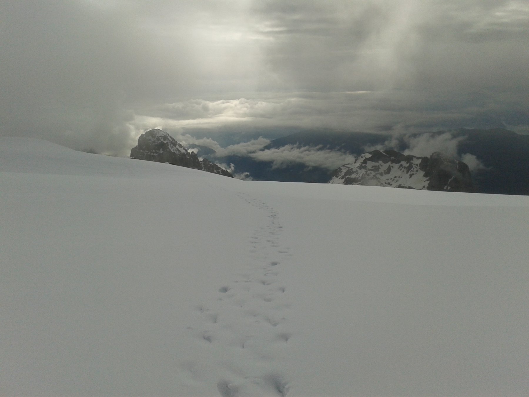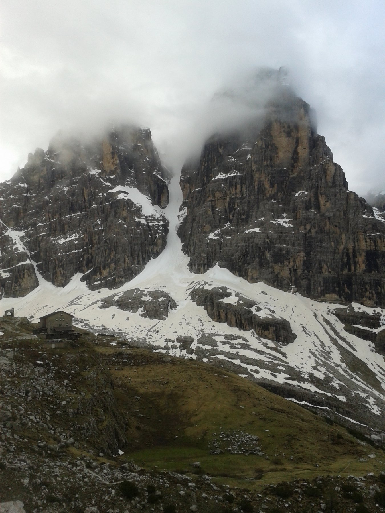 2° giorno: Dal rifugio si segue il sentiero con segnavia 392 che porta verso la Bocca di Brenta, si supera la cappelletta, fino a raggiungere un grosso blocco roccioso, dove occorre abbandonare il sentiero principale e prende verso dx per raggiungere (perdendo circa 100 m di dislivello) il fondo della Val Brenta, si sale poi sul versante opposto per una traccia di sentiero che sale tra detriti e blocchi rocciosi (o neve), supera un tratto più ripido e poi raggiunge l’ampia conca della conoide iniziale del Canalone della Tosa, coperta interamente dal piccolo ghiacciaio (la Vedretta del Crozzon).