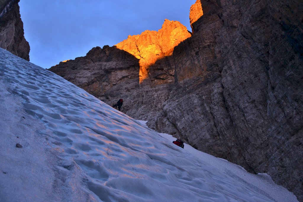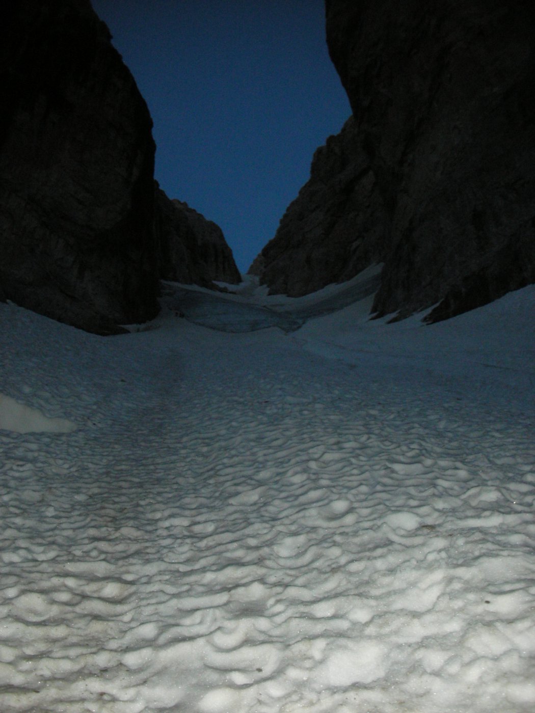 E consigliabile partire molto presto dal rifugio, sia per trovare la neve in condizioni migliori che per ridurre al minimo il rischio (alto) di possibili scariche di sassi e detriti, data la presenza di pietrame instabile ai bordi del canalone.