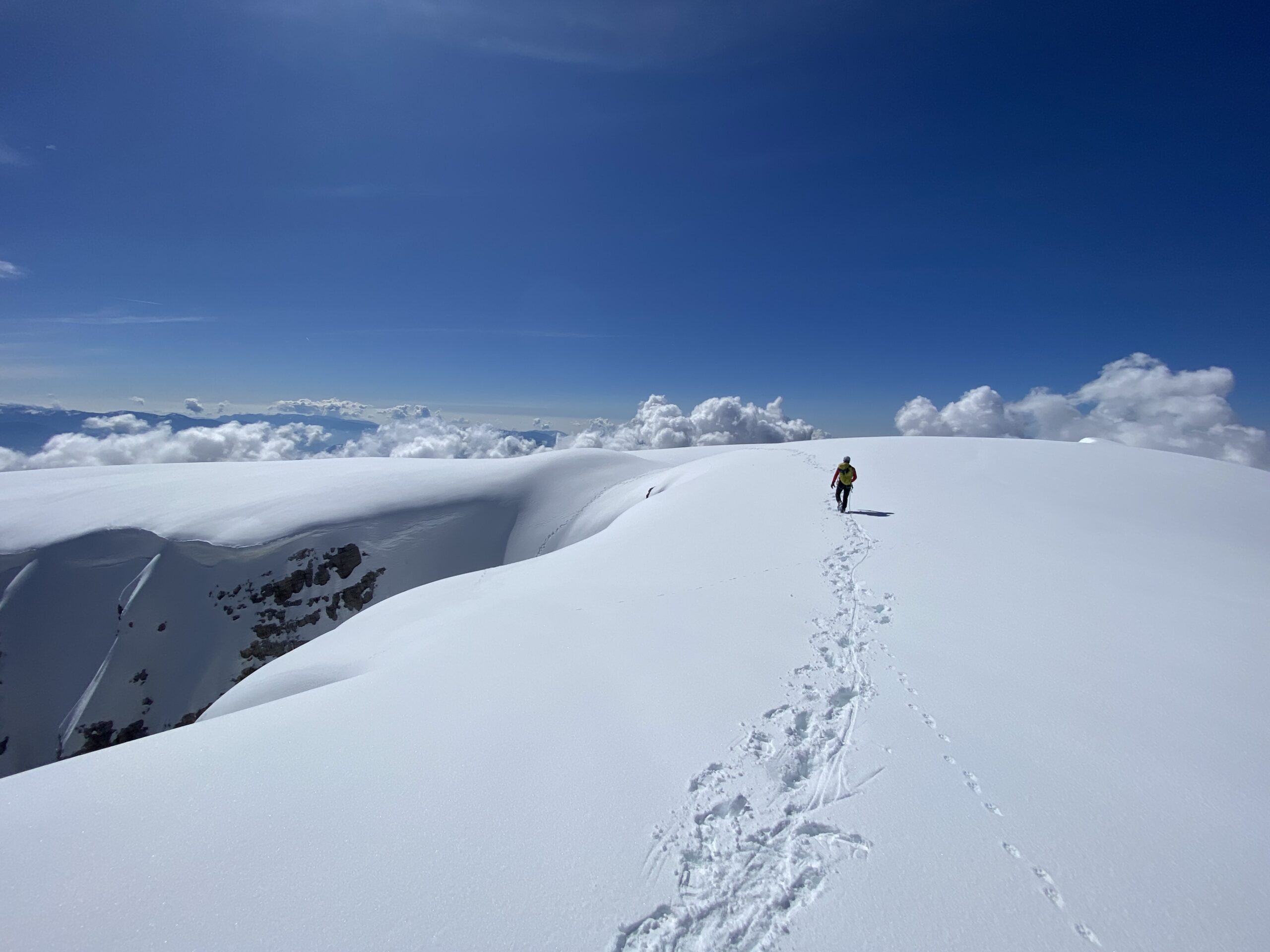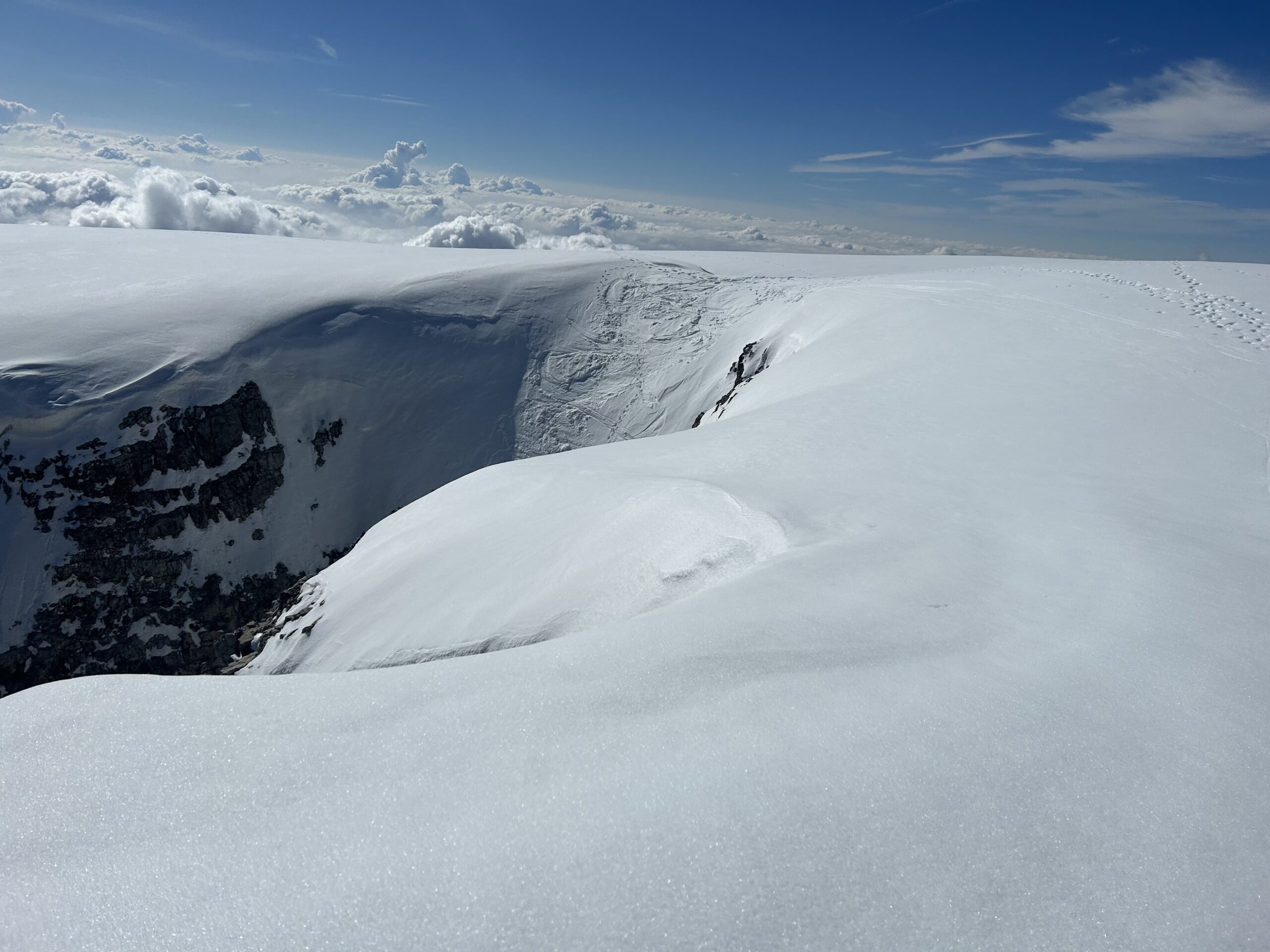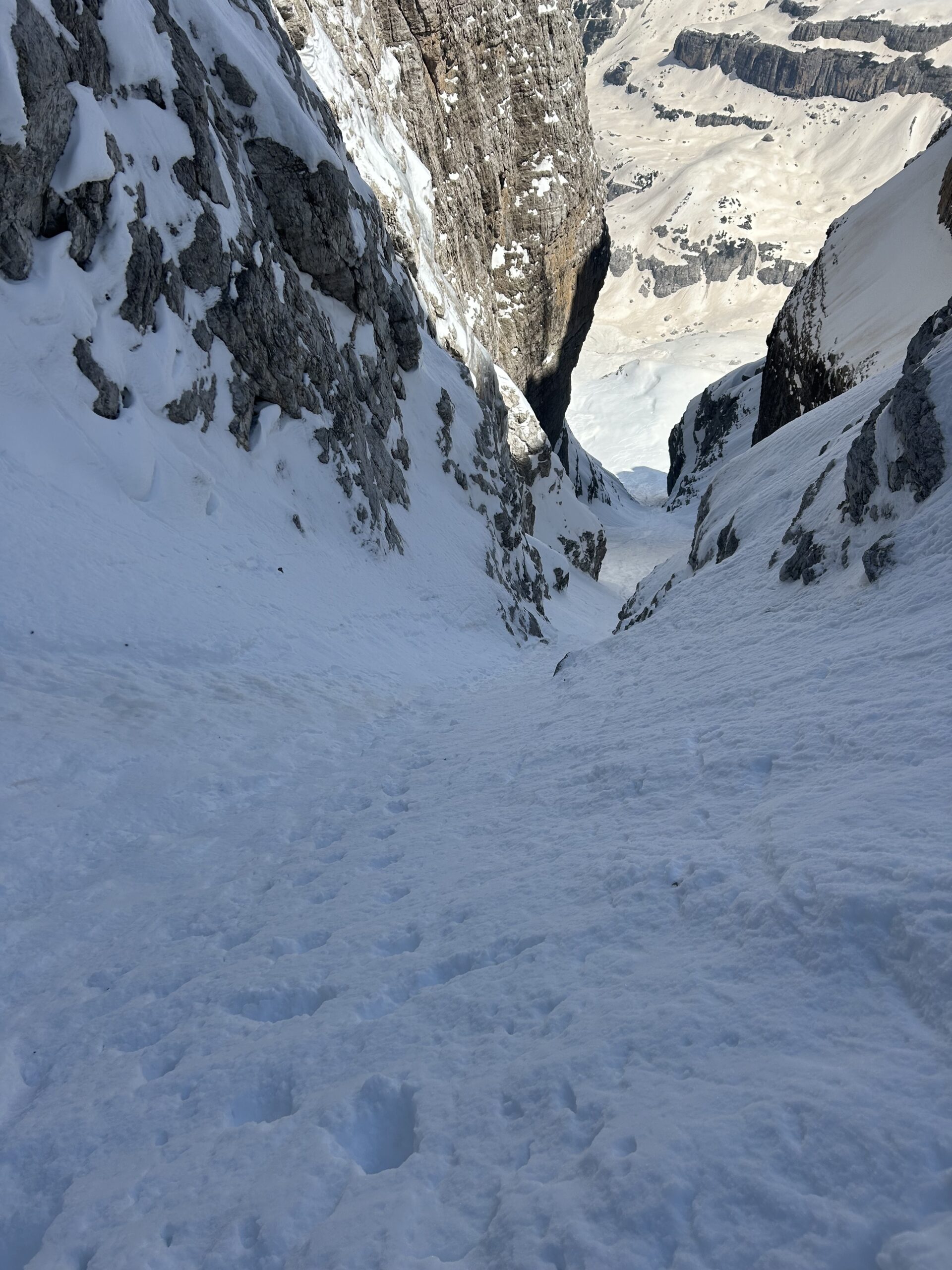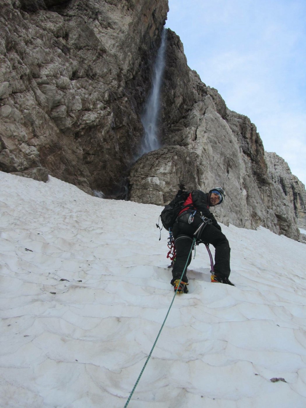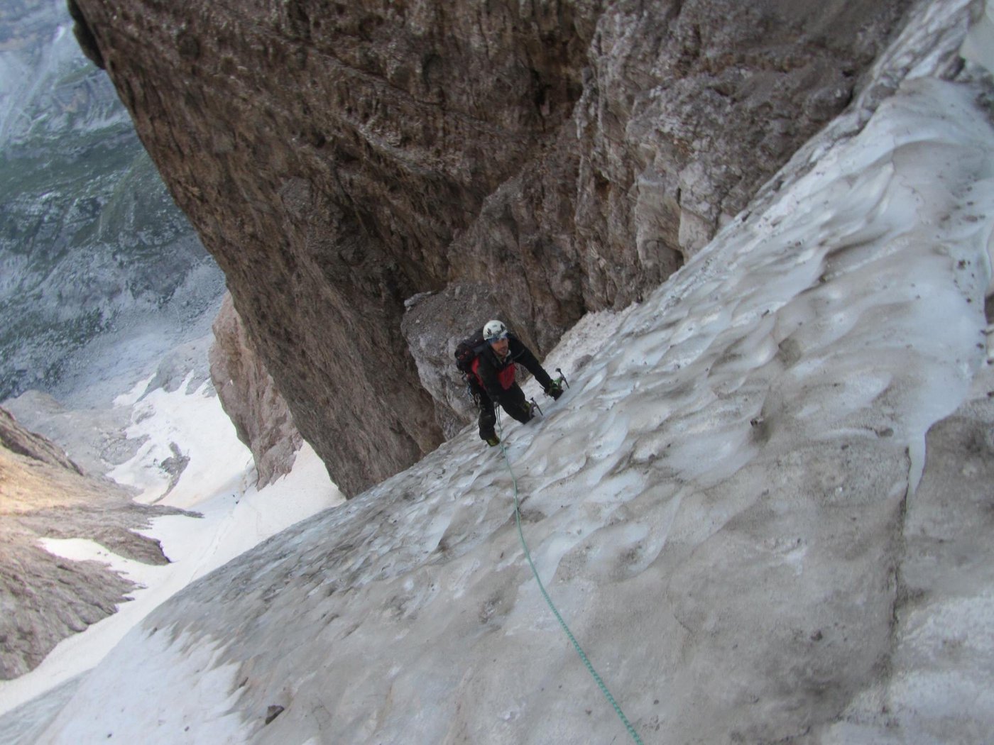 Superato il primo crepaccio si riprende a salire a centro canale, superando un tratto piuttosto ripido (un rigonfiamento chiamato “il ginocchio”) che arriva intorno ai 55°, poi il canale diventa leggermente meno ripido (45°) e raggiunge la seconda crepaccia (che a inizio stagione si supera bene, ma a luglio potrebbe già diventare problematica) che normalmente si supera sulla destra salendo.