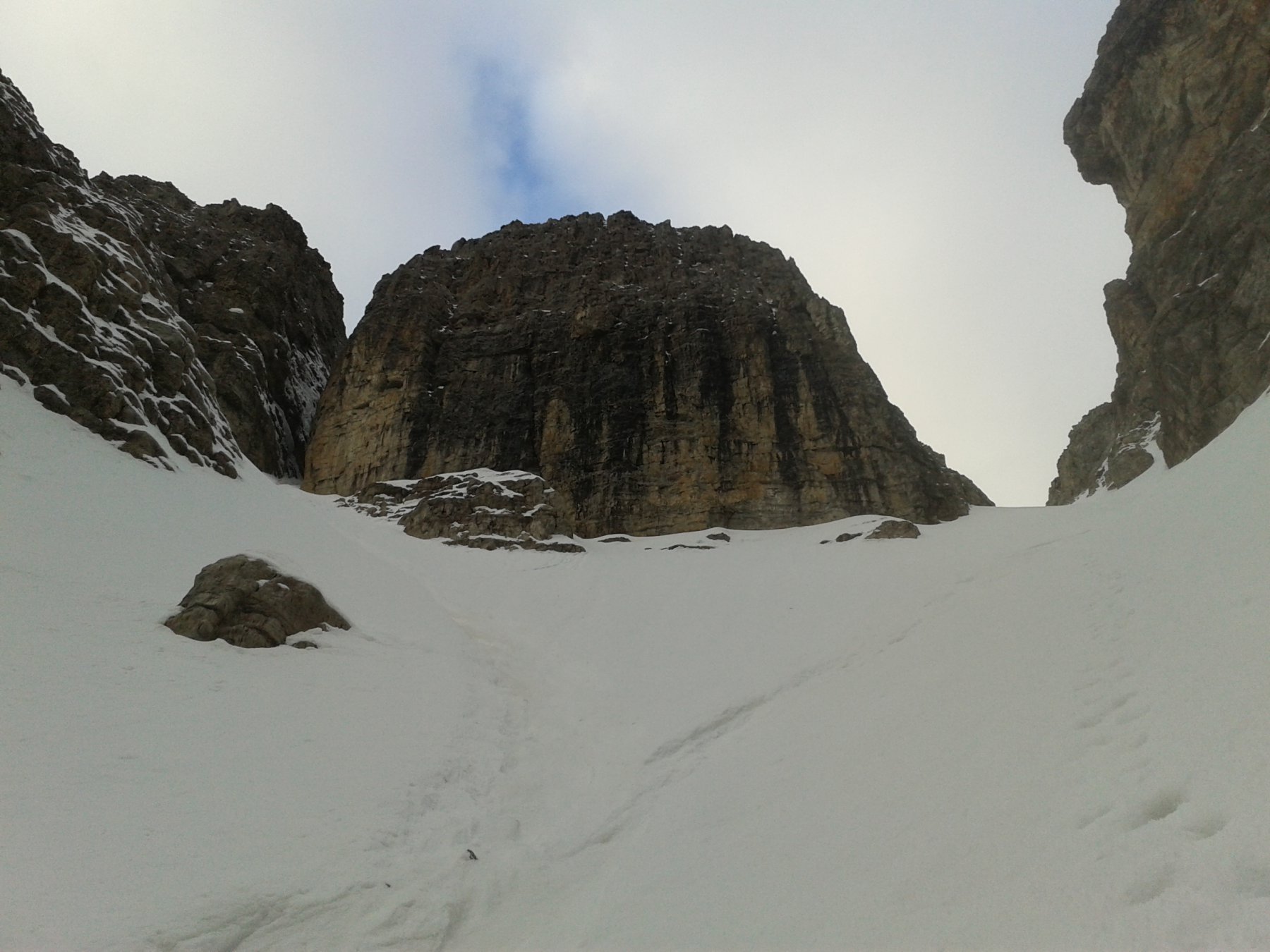 Si supera la conoide iniziale e si mette piede nel canalone, che si risale inizialmente tenendosi al centro (pendenza sui 45°) e poi verso sinistra, per superare il primo crepaccio nei pressi delle rocce.