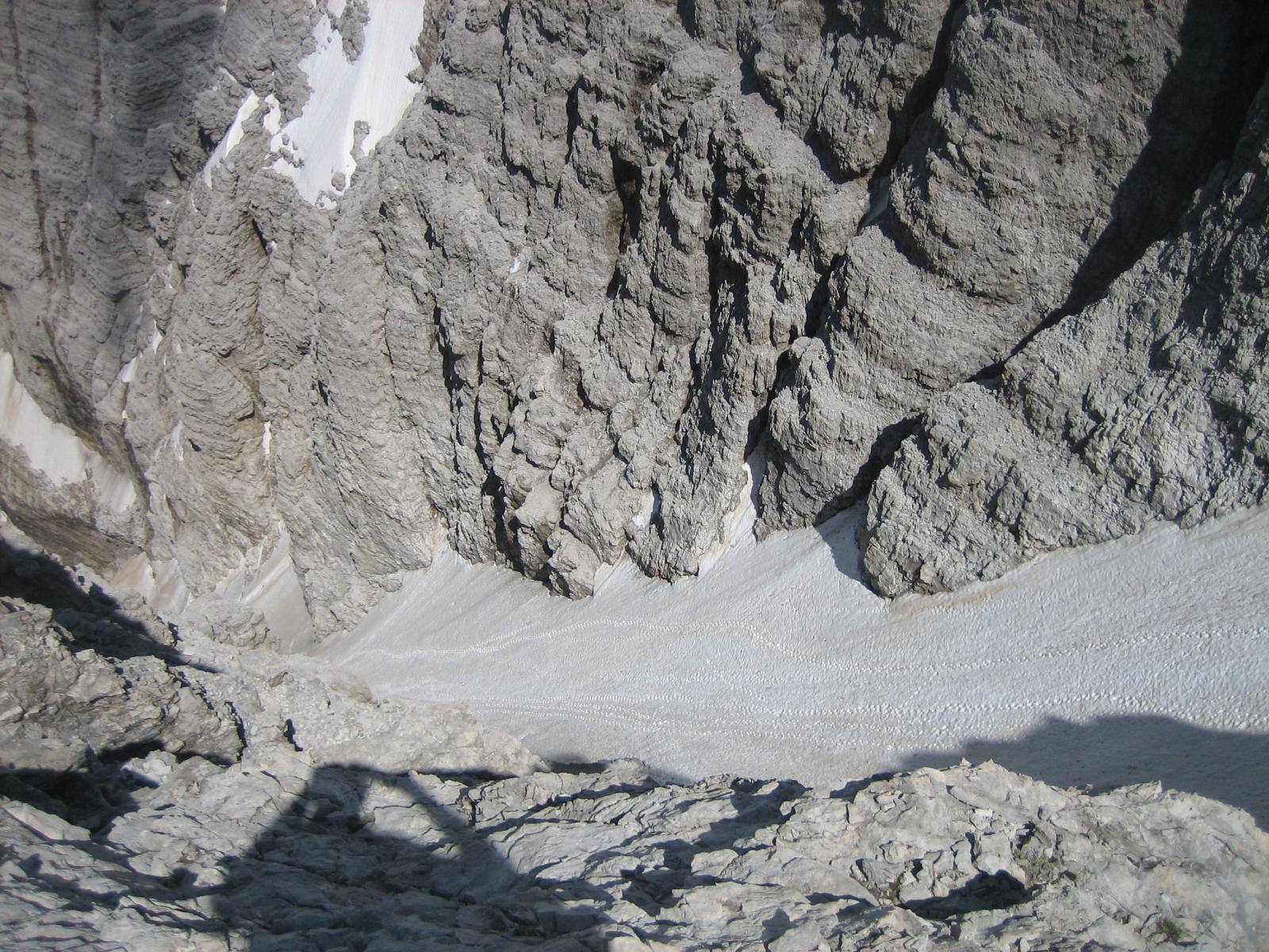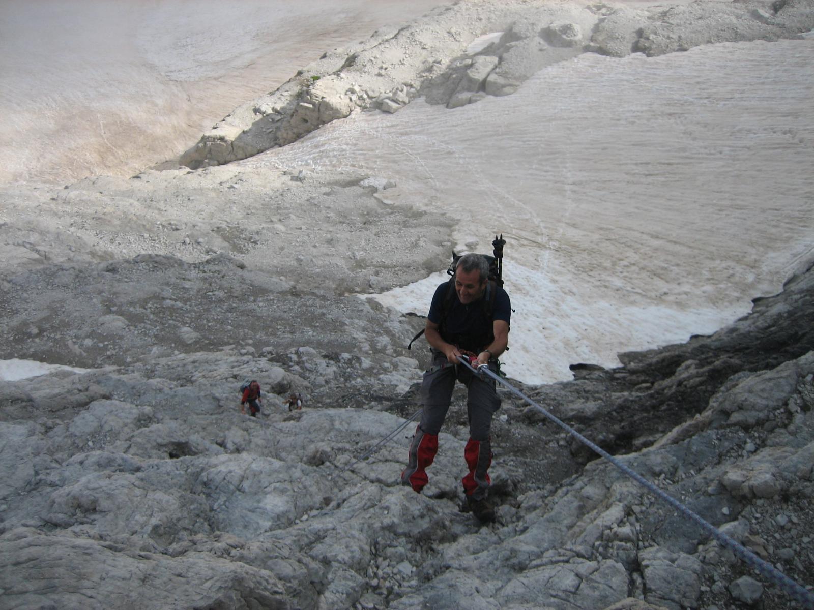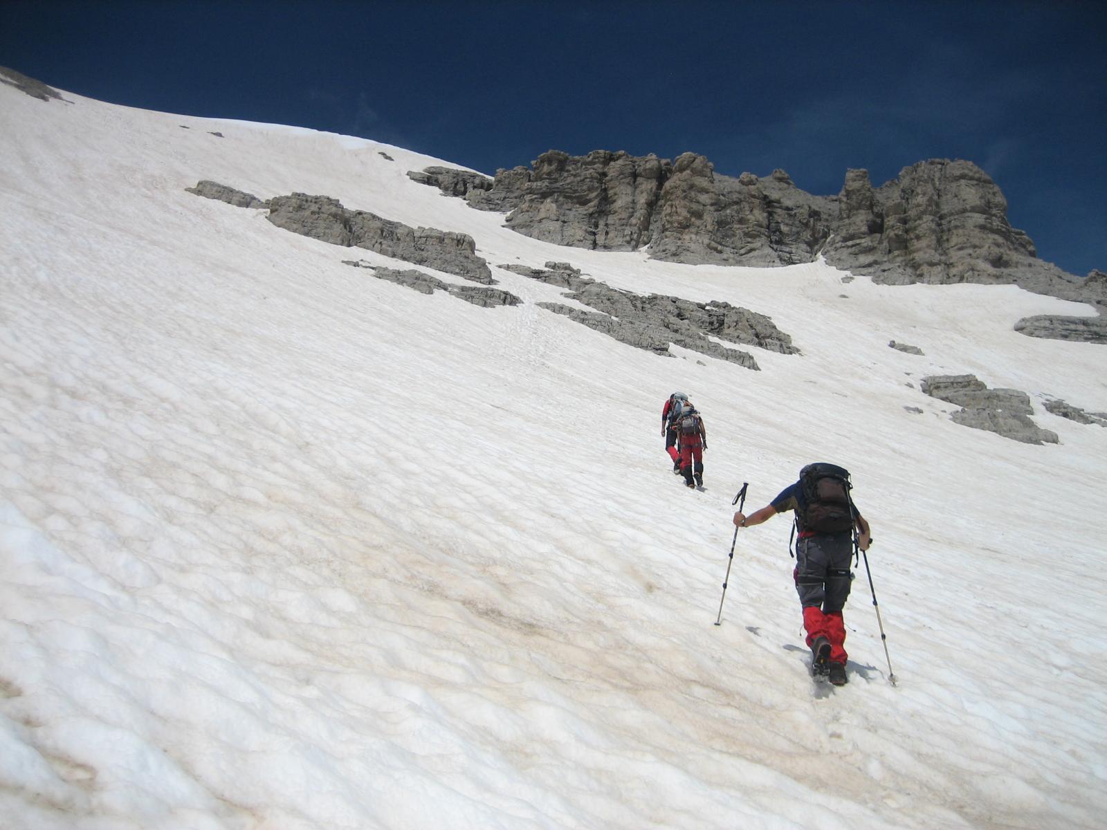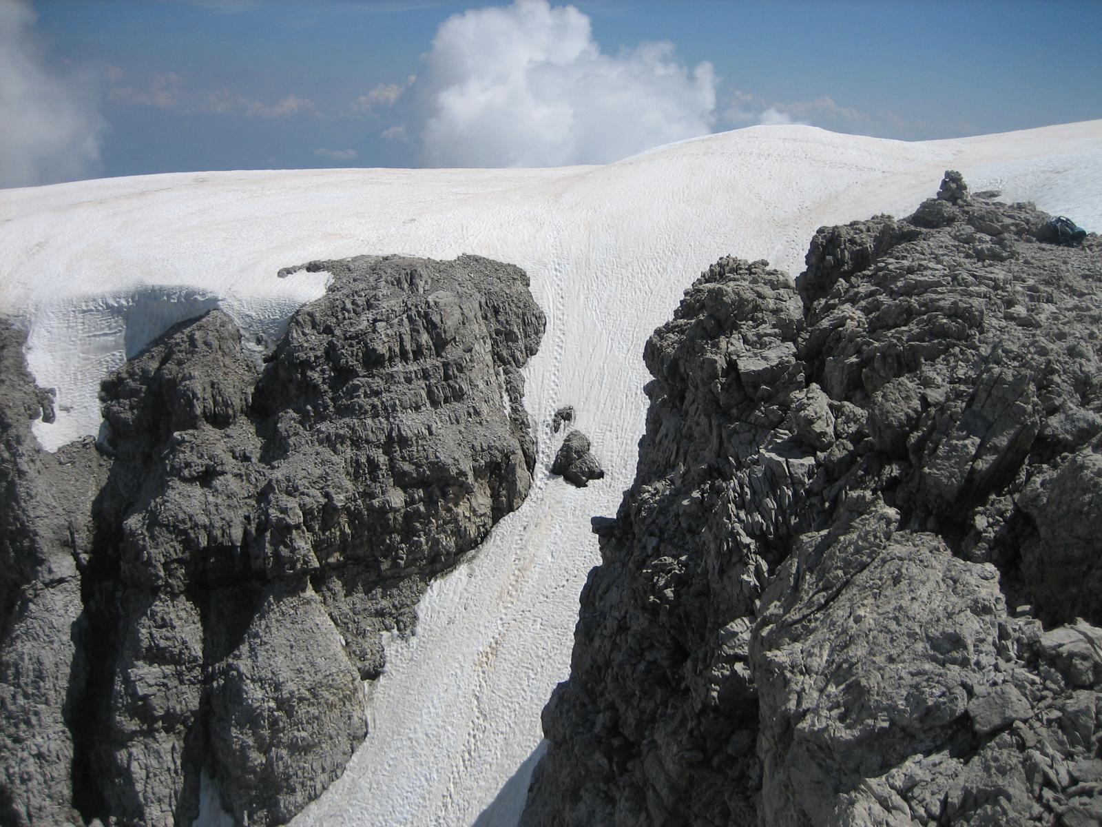 Raggiunti i ghiaioni della Vedretta sup. di Tosa si attaccano le rocce sulla dx dove la parete è meno alta e caratterizzata da due camini paralleli piuttosto bagnati. Si sale quello di sx con passi di II/II+ circa 25m. Calata attrezzata per la discesa. Si prosegue per tracce di sentiero e ometti fra paretine e ghiaioni fino alla piatta vasta sommità.
