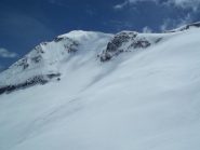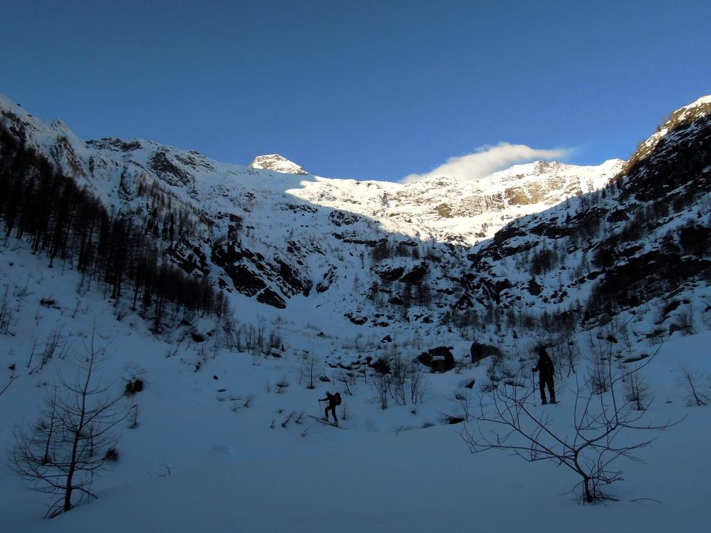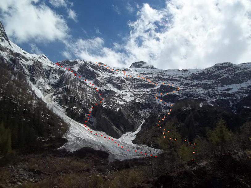 Seguire le tracce del sentiero estivo, superare il ripido salto di rocce sopra le baite, e poi sempre a sinistra per i due canaletti uscire sulla terrazza superiore (2265 metri).