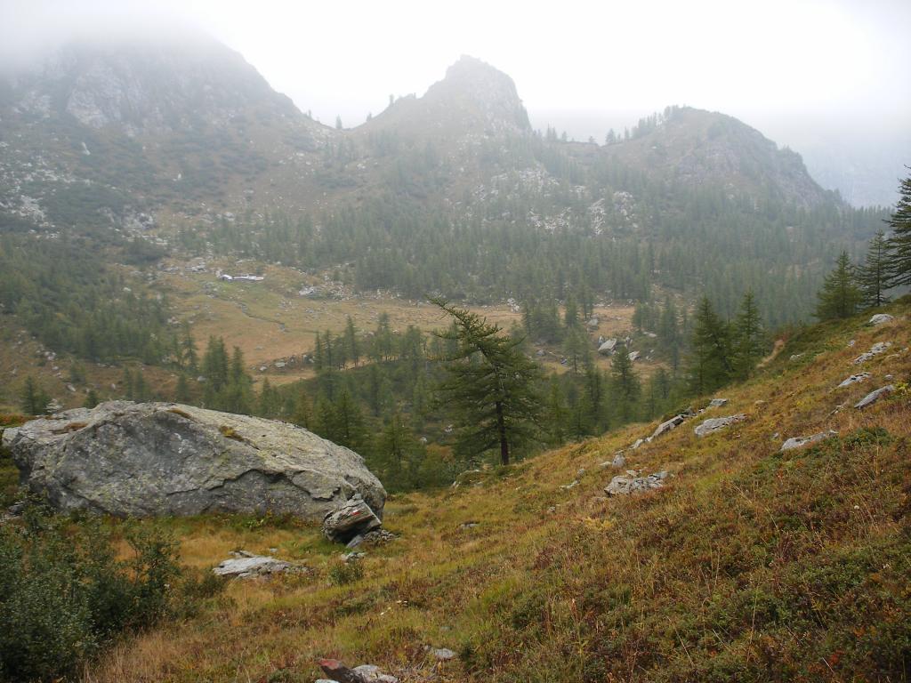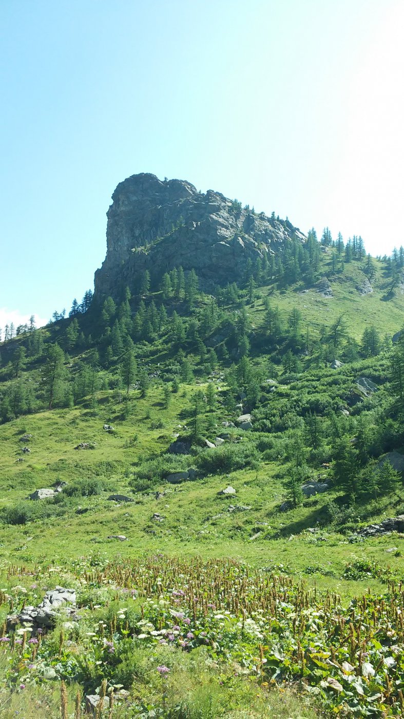 Si sale fino a un valloncello da cui a destra, senza sentiero, si può in breve raggiungere il Roc Neir o Rocca Nera 1949 m, con ottimo colpo d’occhio sul Piano .